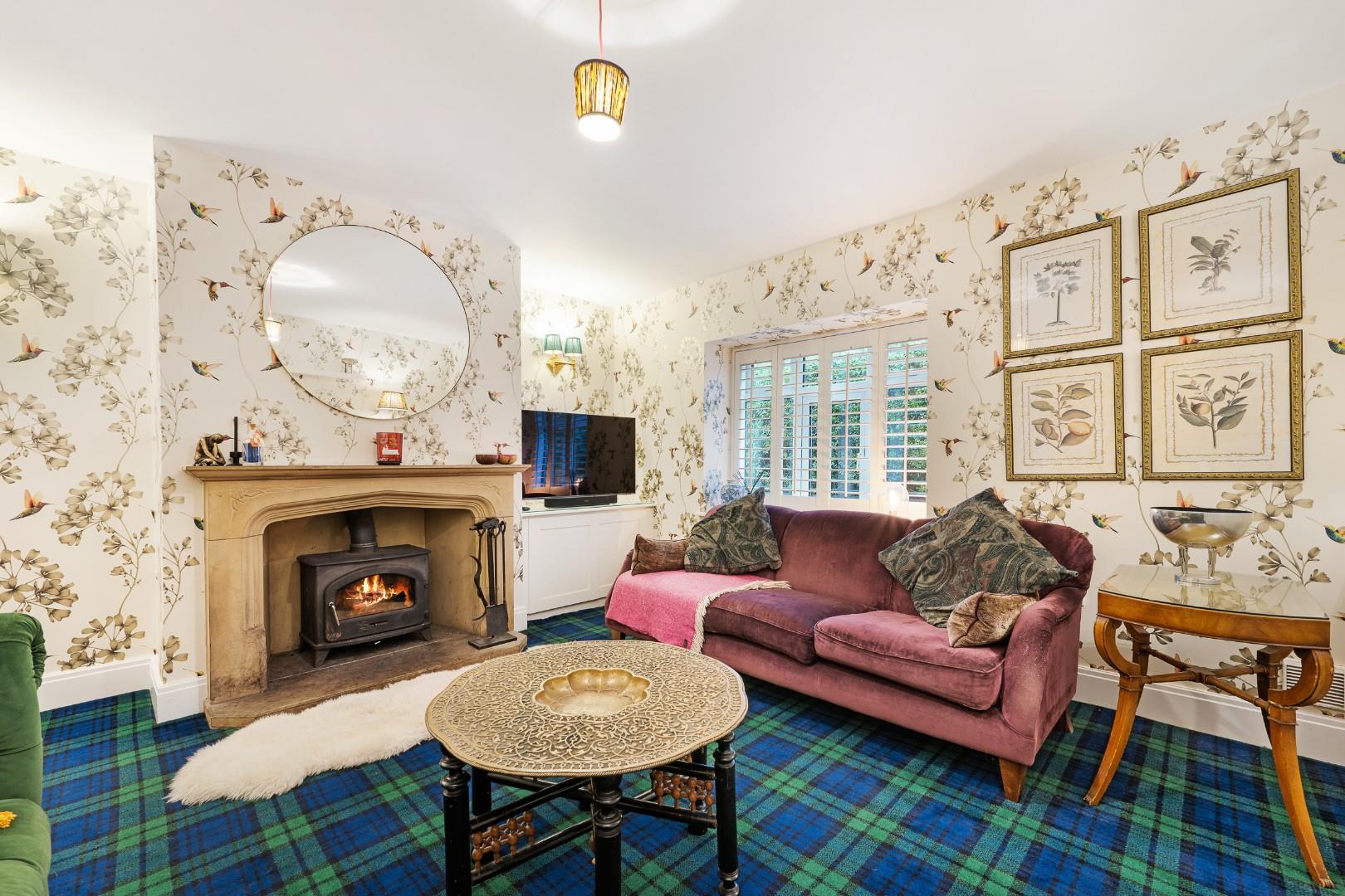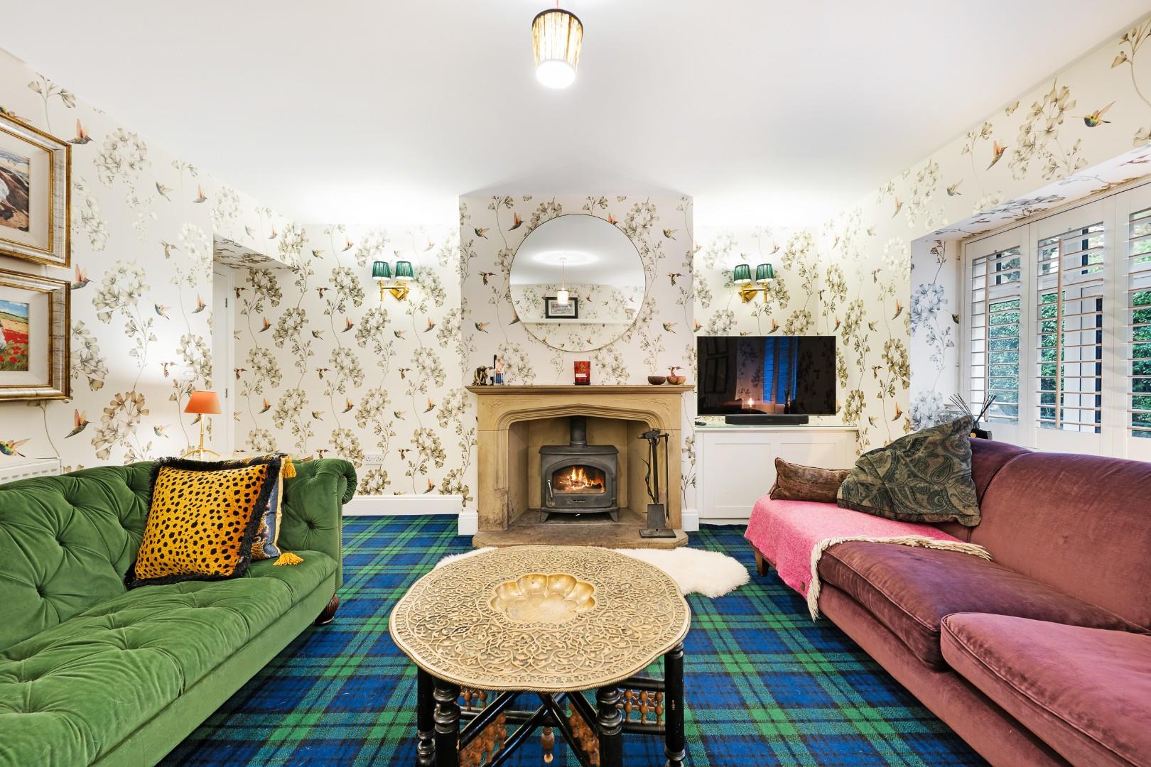 The lounge is more of a traditional, cosy sitting area, where fitted window shutters and a multifuel burner set within a stone fireplace continue the rustic country house aesthetic. It is a large room with ample space for multiple sofas, and a range of integrated storage units add to its practicality.