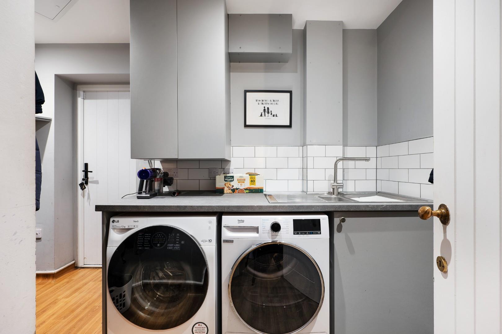 The utility features plumbing for the washing machine and dryer, an extra sink and tap, additional worktop and storage spaces, as well as plenty of room for keeping coats and shoes tidy and out of the way.