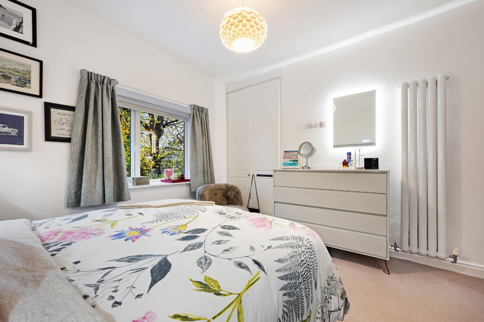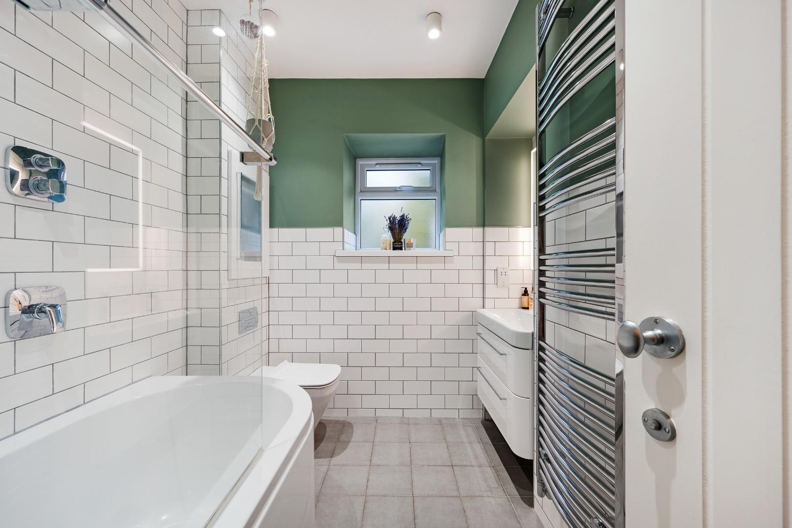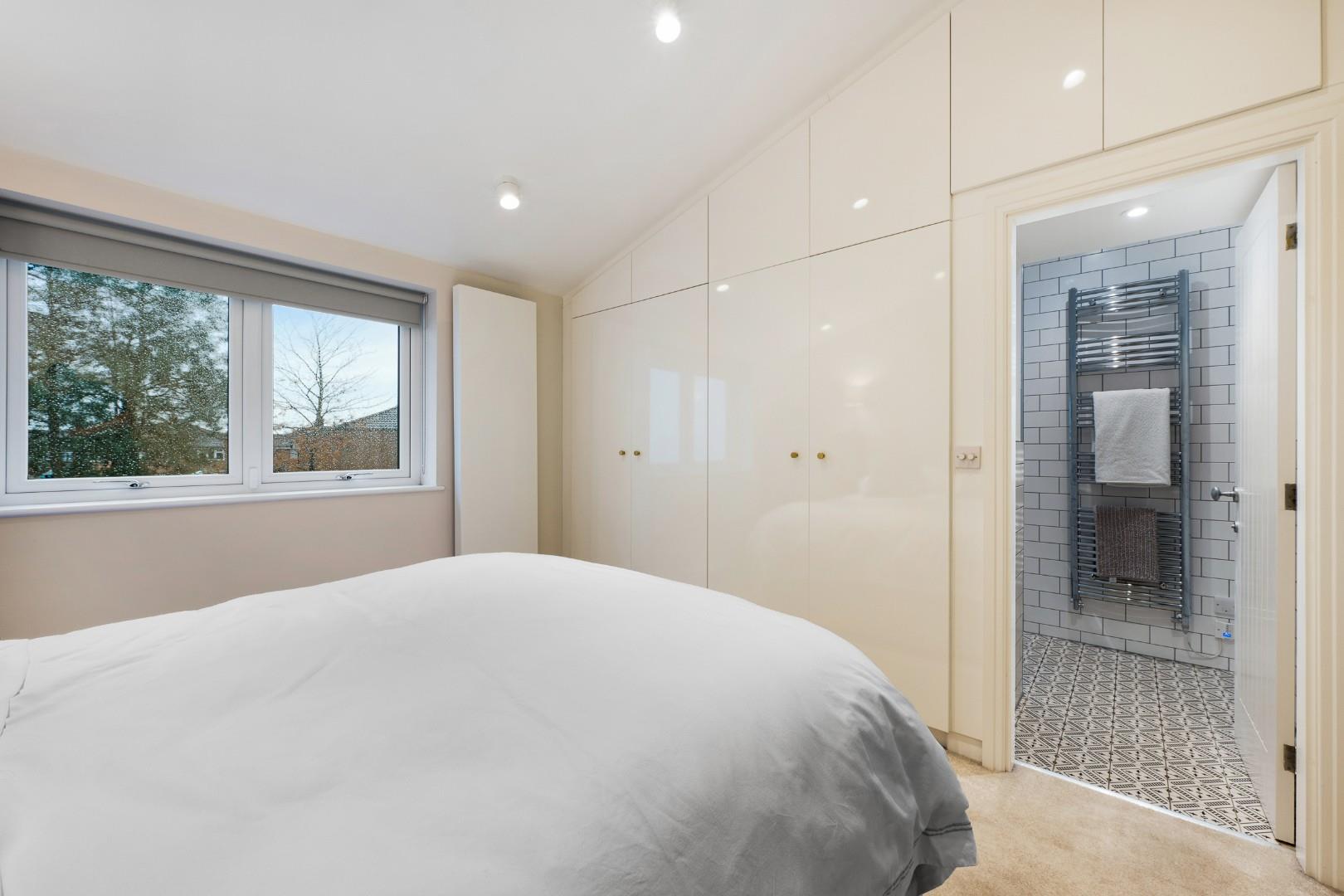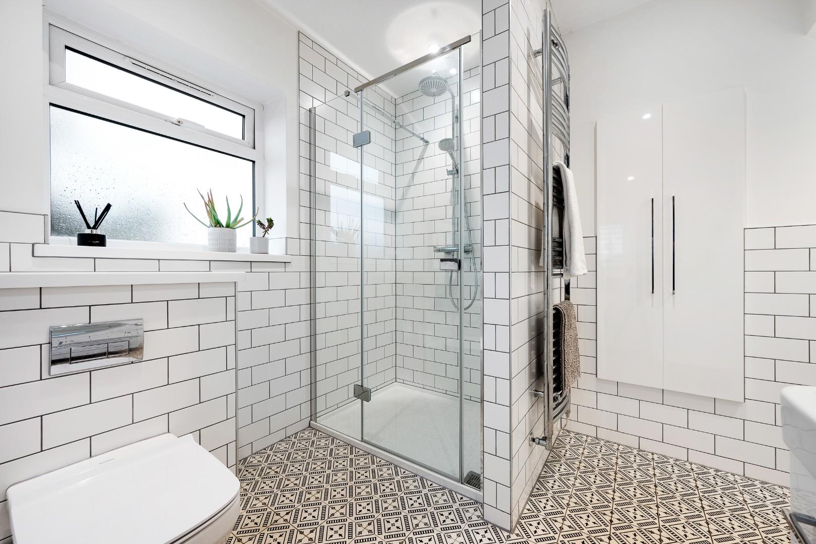 Upstairs the master bedroom features a smart, fitted storage wall, and a large en-suite with underfloor heating and four-piece suite, comprising a walk-in shower, tiled-in bath, vanity basin and WC with chrome heated towel rail. Statement floor tiling complements the white metro tiles on the walls.