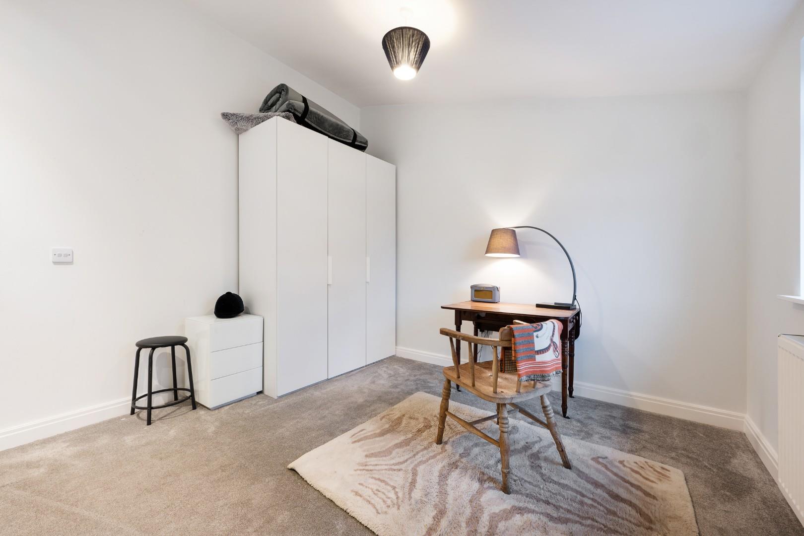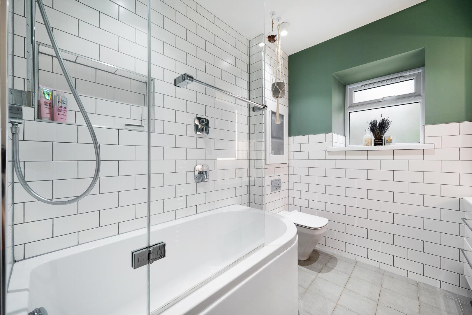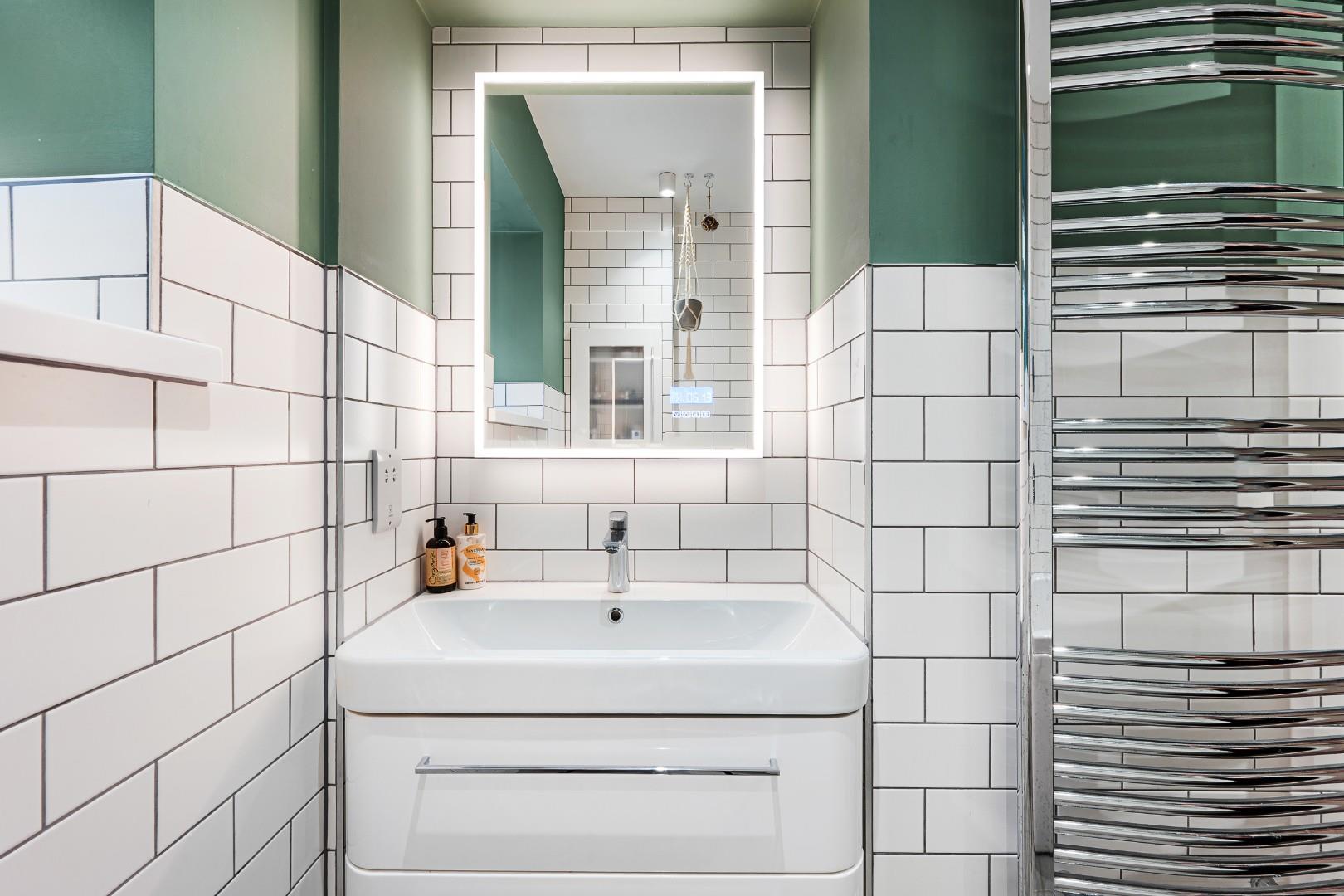 Upstairs the master bedroom features a smart, fitted storage wall, and a large en-suite with underfloor heating and four-piece suite, comprising a walk-in shower, tiled-in bath, vanity basin and WC with chrome heated towel rail. Statement floor tiling complements the white metro tiles on the walls.