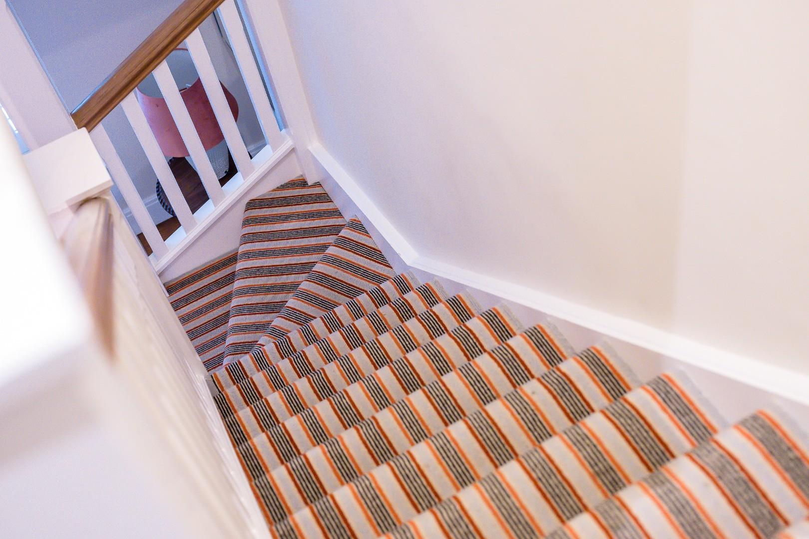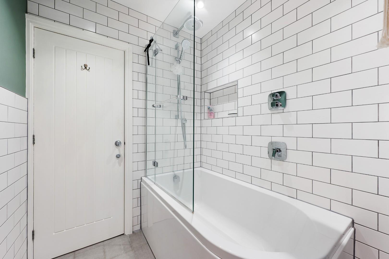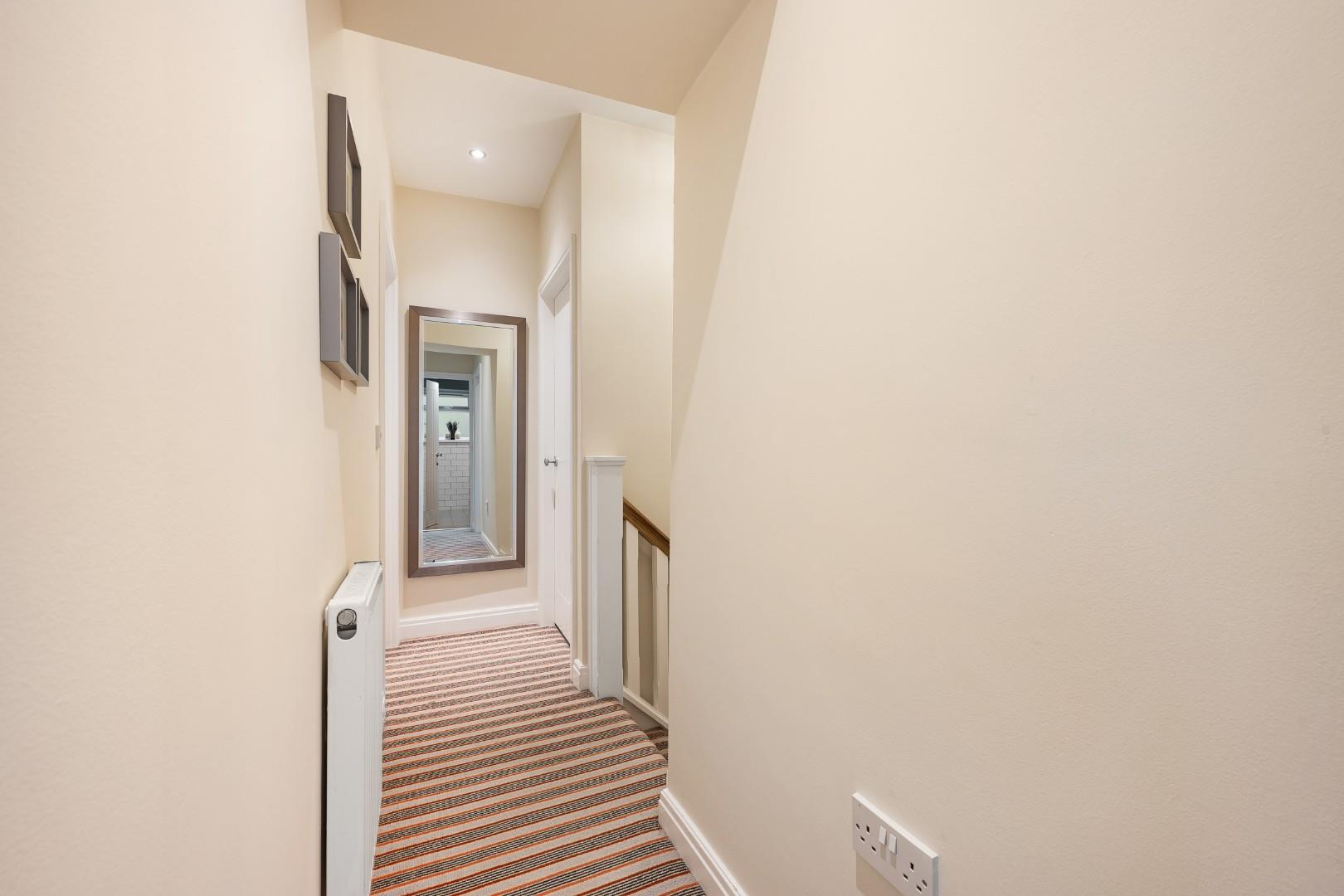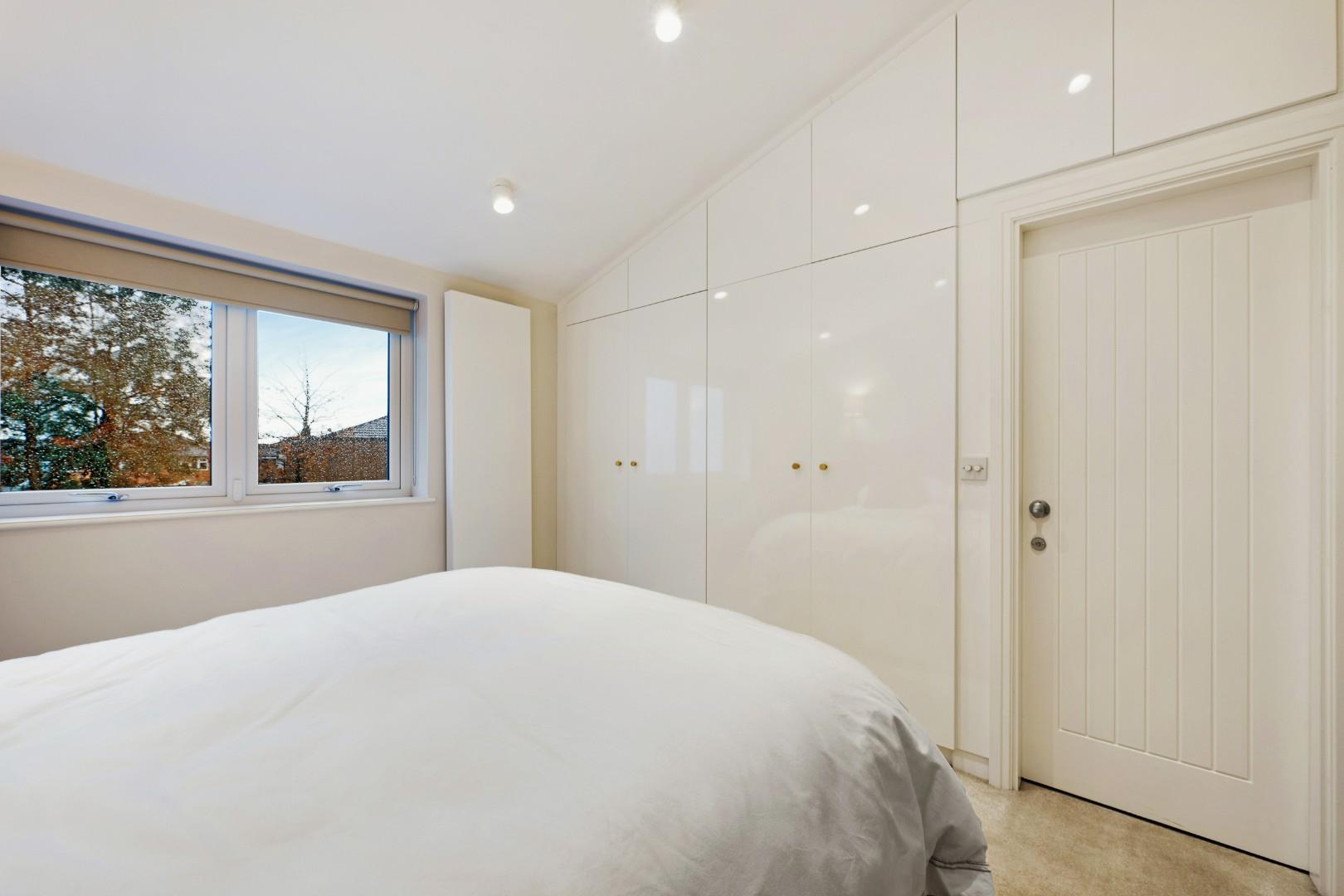 Upstairs the master bedroom features a smart, fitted storage wall, and a large en-suite with underfloor heating and four-piece suite, comprising a walk-in shower, tiled-in bath, vanity basin and WC with chrome heated towel rail. Statement floor tiling complements the white metro tiles on the walls.