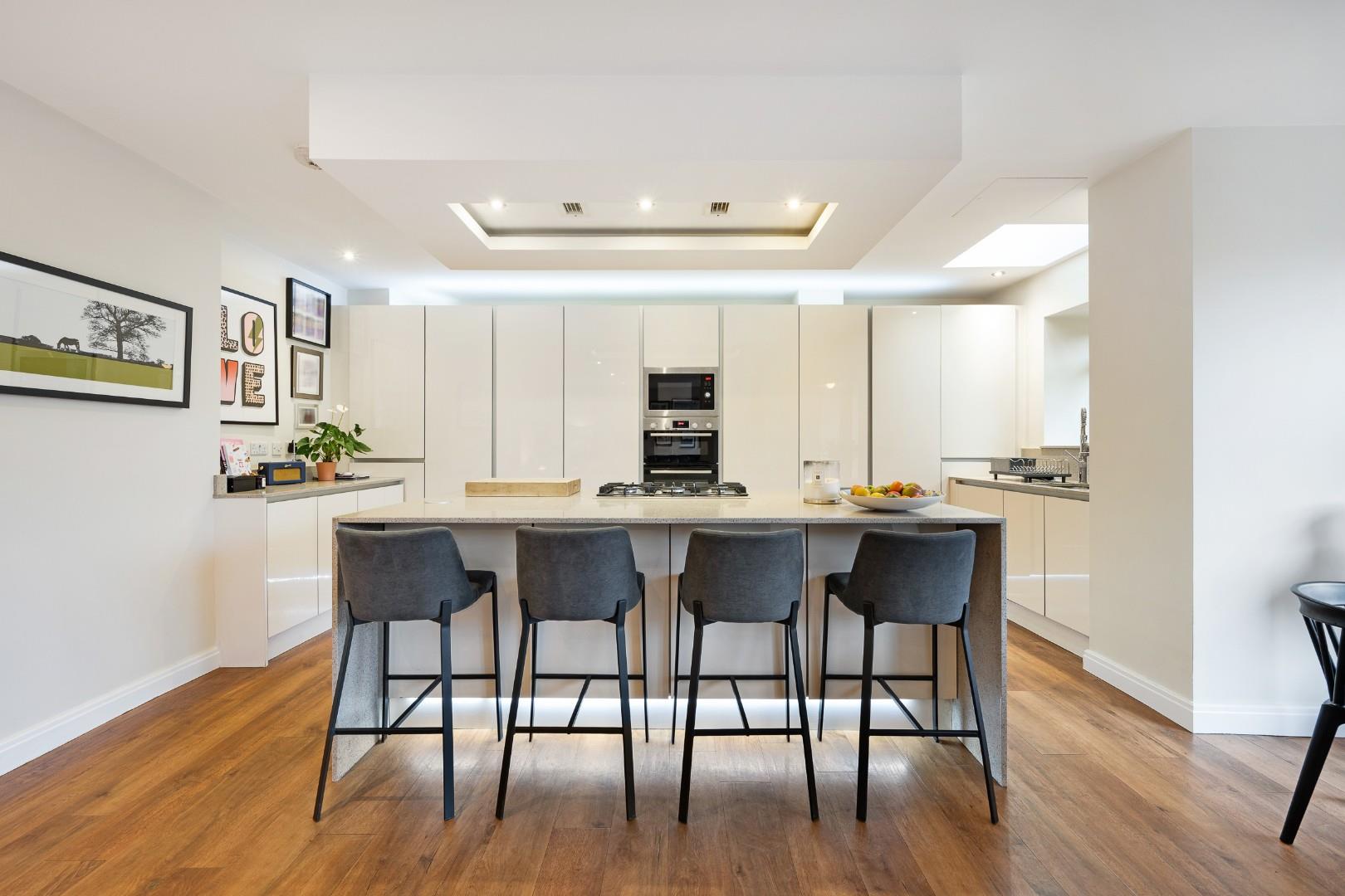 The kitchen is undoubtedly the heart of the open plan area, and its large island with seating for four provides a superb social appeal, highly practical for both everyday family life and when entertaining family and friends.
