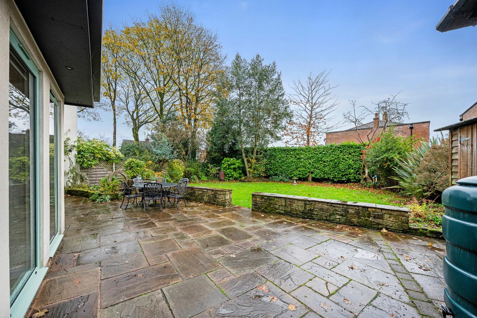 The plot extends a substantial way behind the property, and along with its generous width offers a very spacious garden, bordered by mature trees and shrubbery. There is an abundance of space for the kids to play safely while keeping an eye on them from the open plan kitchen and living space, and the glass double doors afford that indoor-outdoor lifestyle, opening onto the large patio – the perfect setup for summer socialising and enjoying barbeques or al-fresco dining with family and friends.