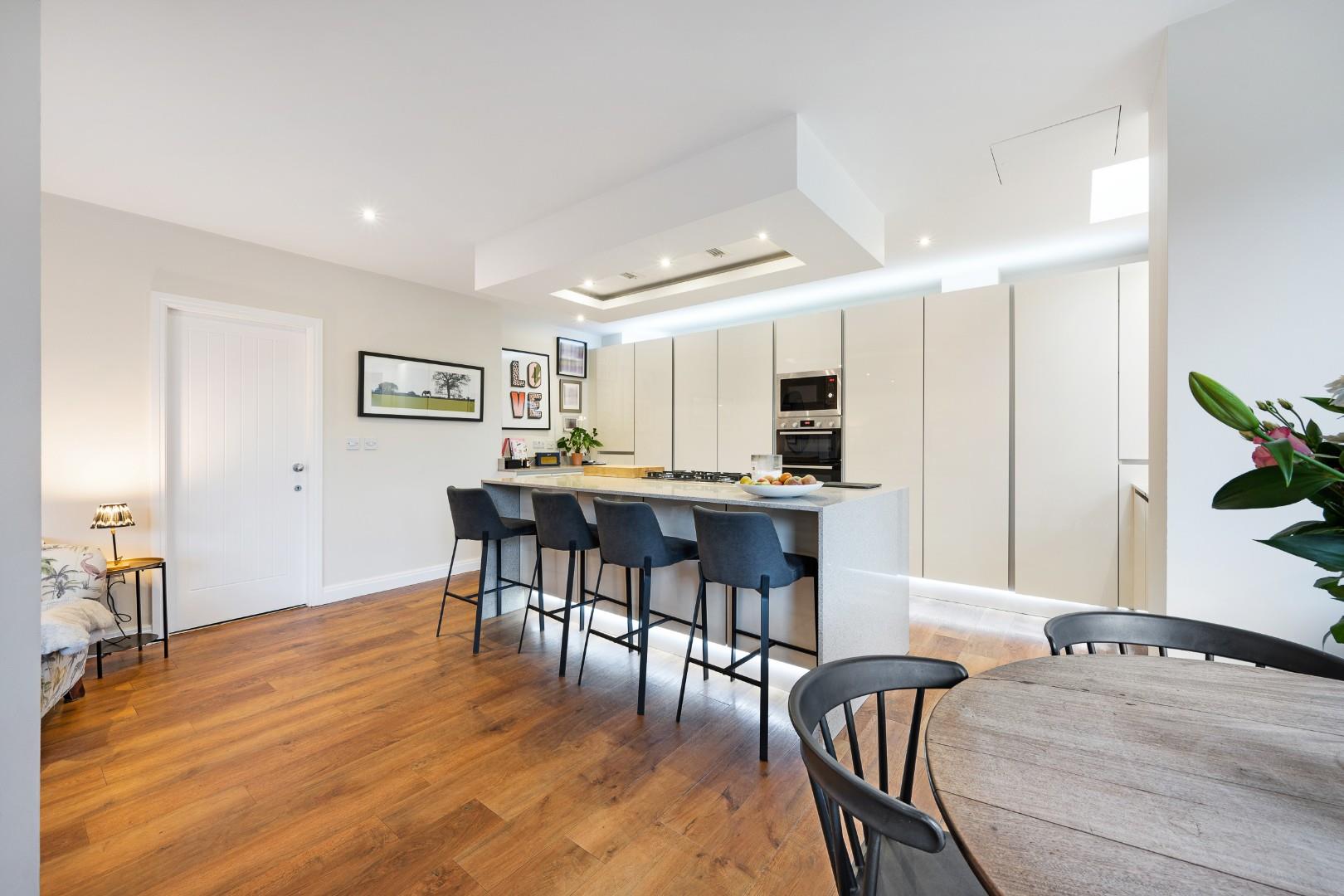The open aspect living space at the rear is highly unique in design, with angular walls onto the garden that separate the different spaces while retaining the flow of open plan living. High ceilings and lots of natural light give a bright and airy feel, further enhanced by Velux windows with remote control, and the oak-style Karndean flooring found throughout most of the ground floor gives a premium feel while also being practical and easy to maintain.