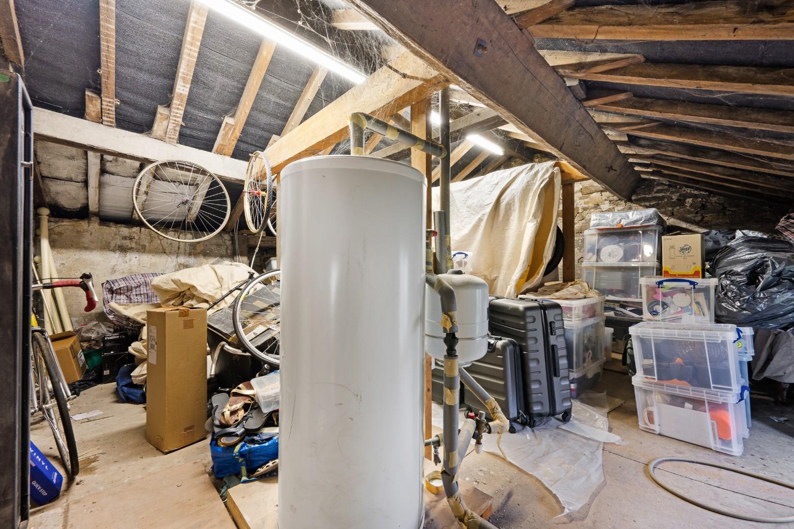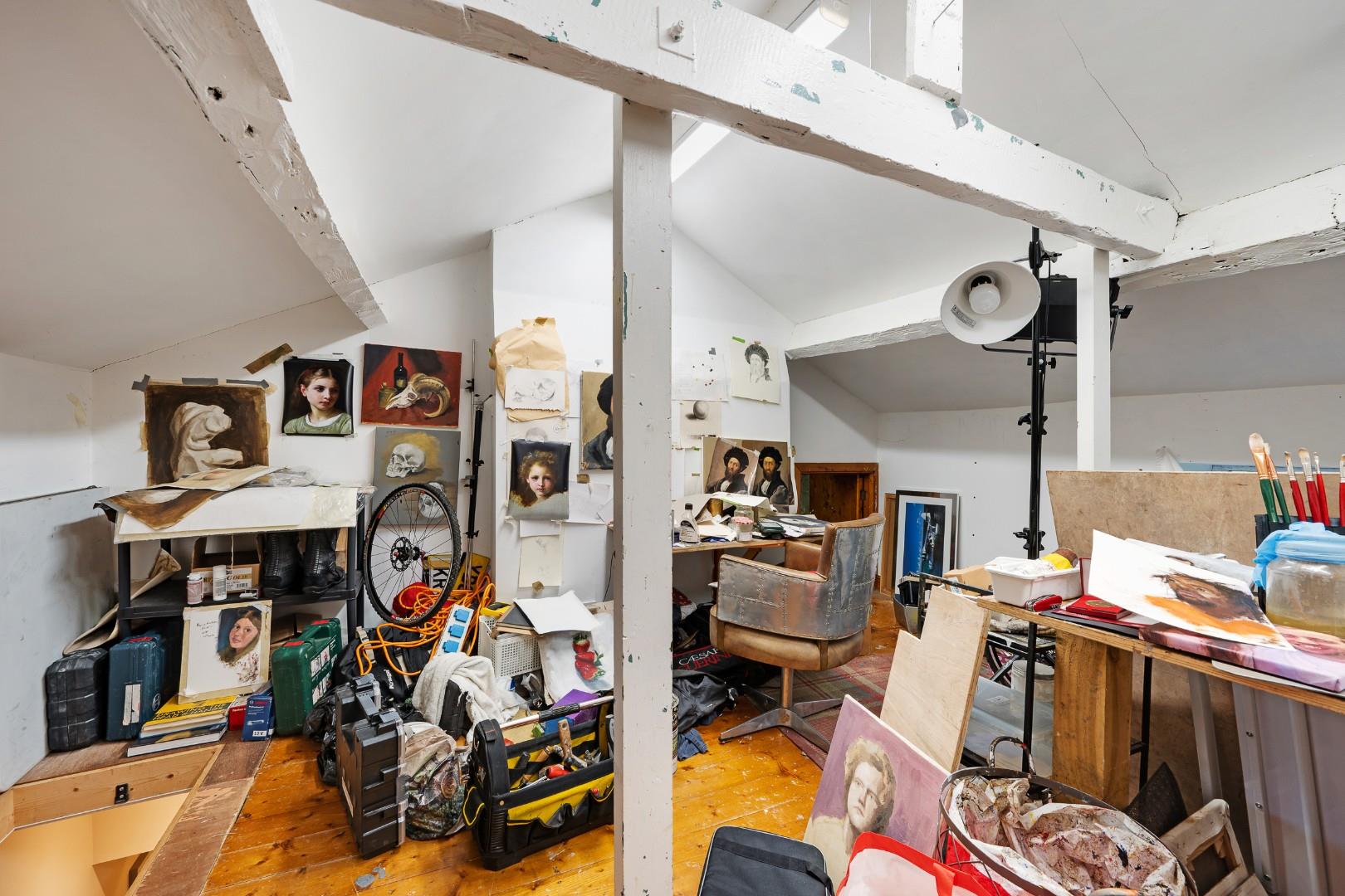The loft also provides a generous amount of storage space. It is split into two rooms, both with lighting, and one of which is currently used as an art studio with boarded and plastered walls.