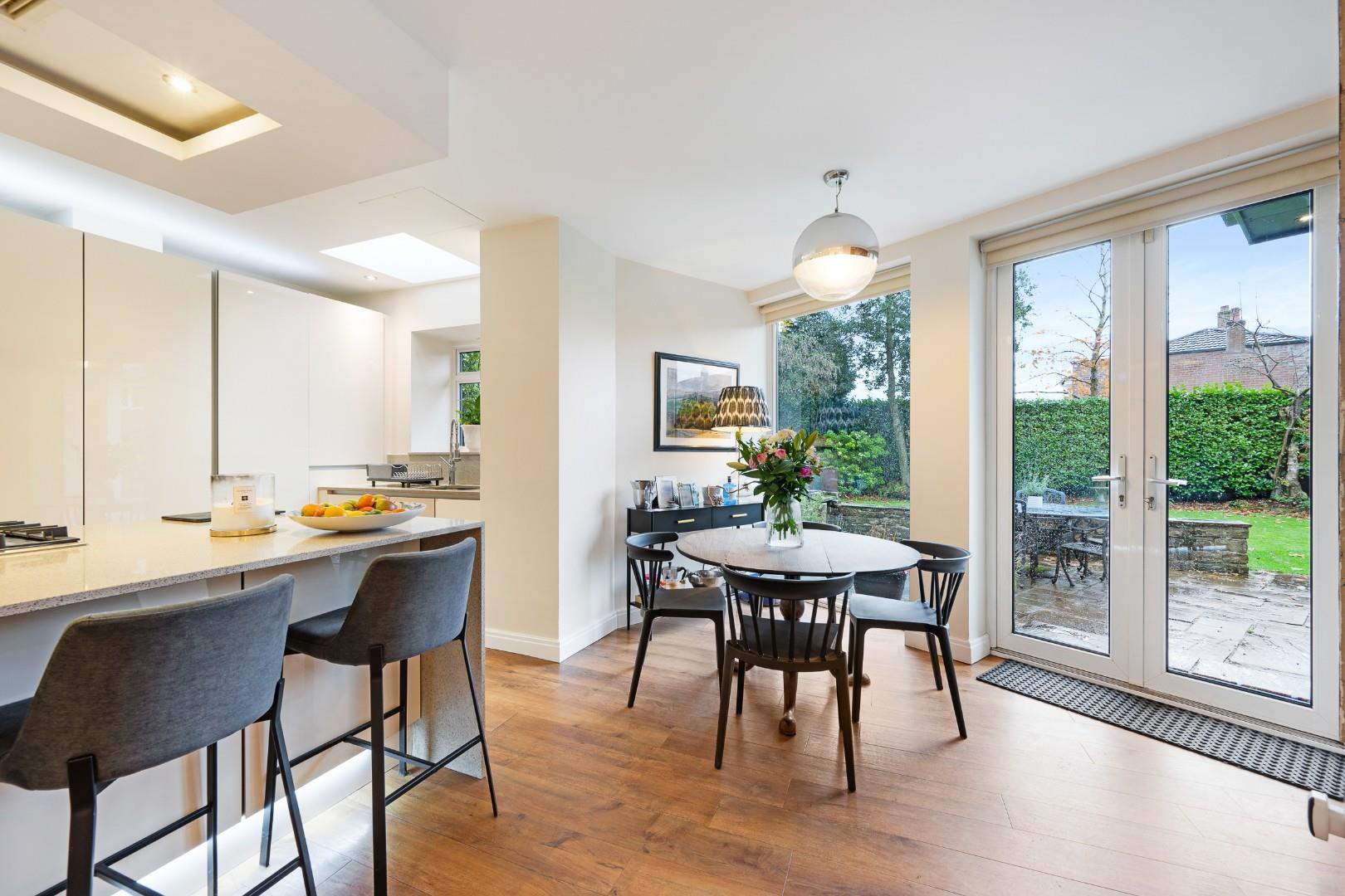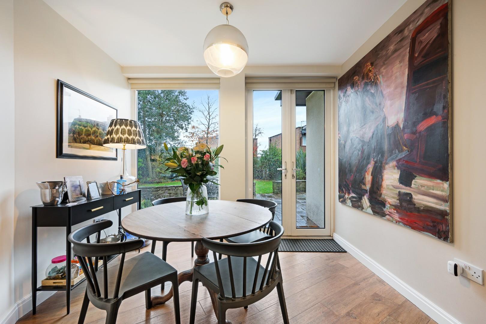 Near to the kitchen, the dining area also enjoys views onto the mature garden, as does the sitting area with further floor to ceiling windows and another Velux window.