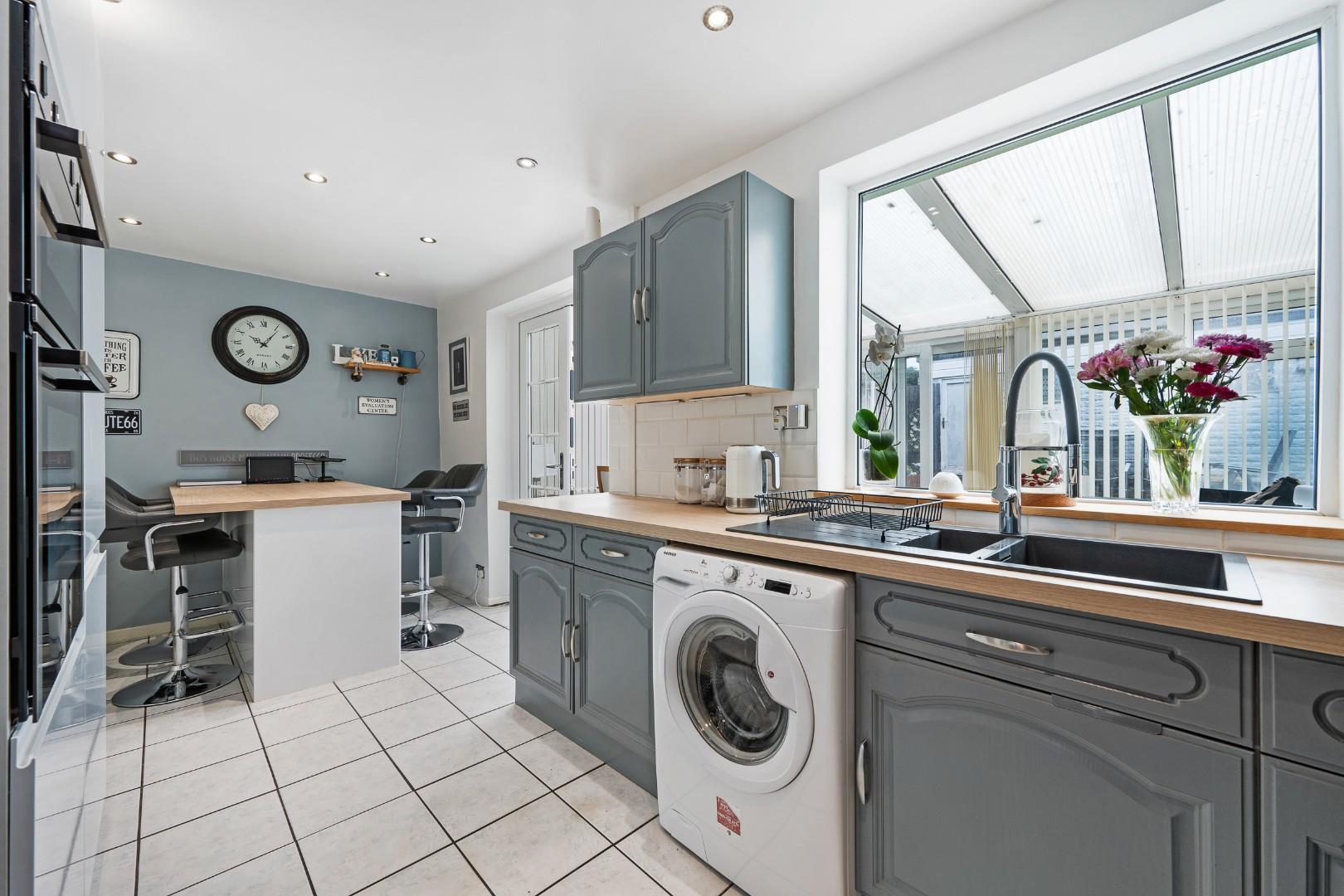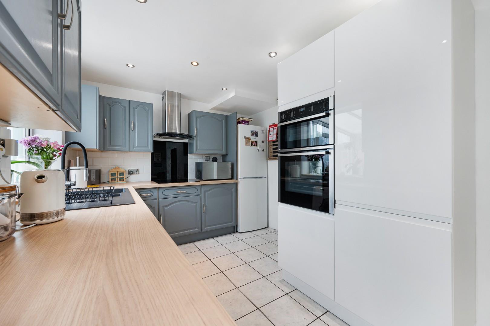 The kitchen design is two-tone with white metro tile splashbacks and white gloss units that add contrast to the traditional grey cabinetry and oak-style worktop. The worktop continues in the open plan dining area with seating for four, and it also provides further storage, featuring fitted units below.