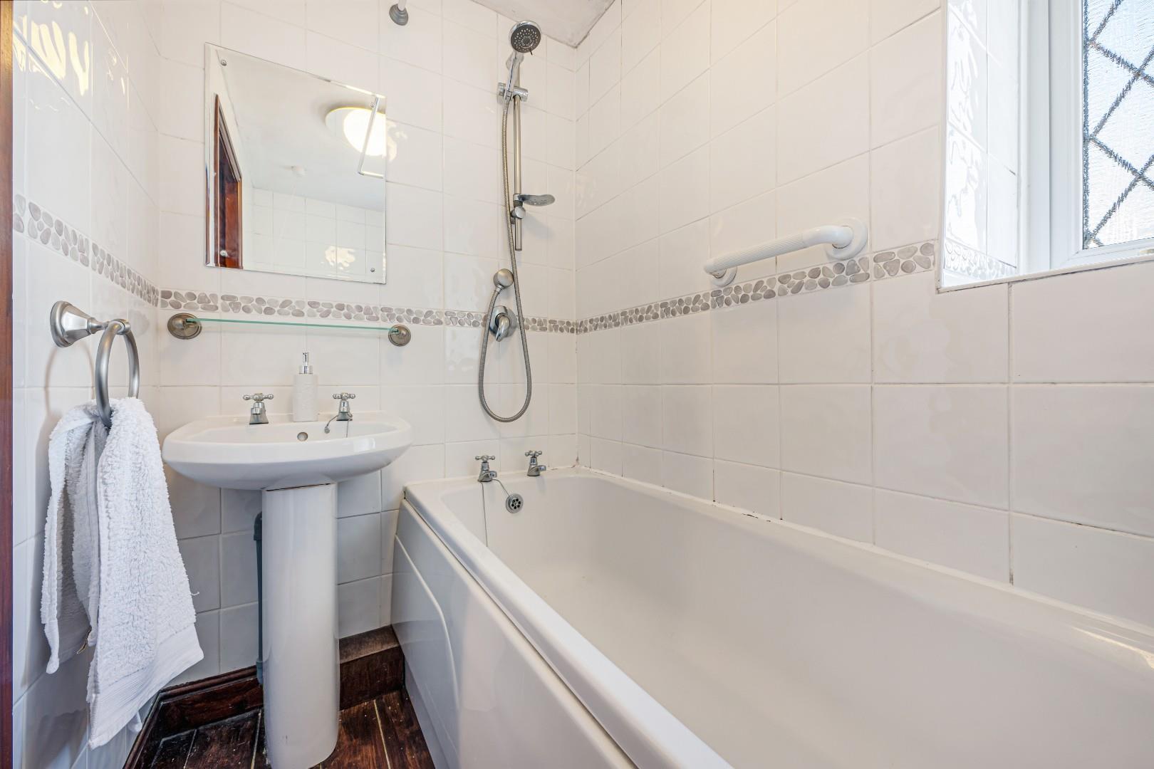 The bathroom is situated on the first floor to the rear of the home, featuring fully tiled walls and a three-piece suite including a bath with shower over, wash basin and WC.
