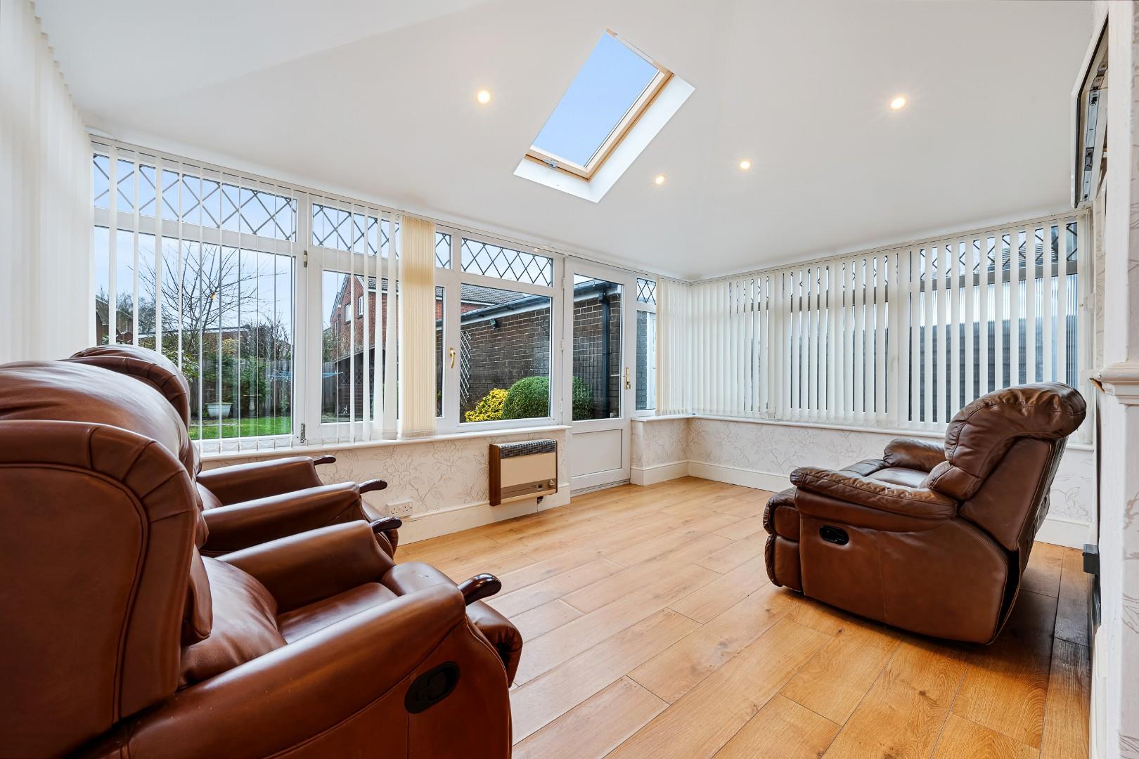 To the rear of the property is the extended part of the home, comprising a large room suitable for use as both a living room and dining area. Overlooking the garden, it is filled with natural light, featuring windows on all sides and a skylight within the spotlight ceiling. This is a very bright and airy space, adding versatility and flexibility for family life, while also providing easy access to the garden to enjoy that desirable indoor-outdoor lifestyle on warm summer days.