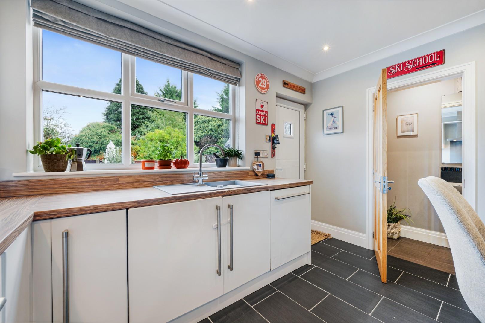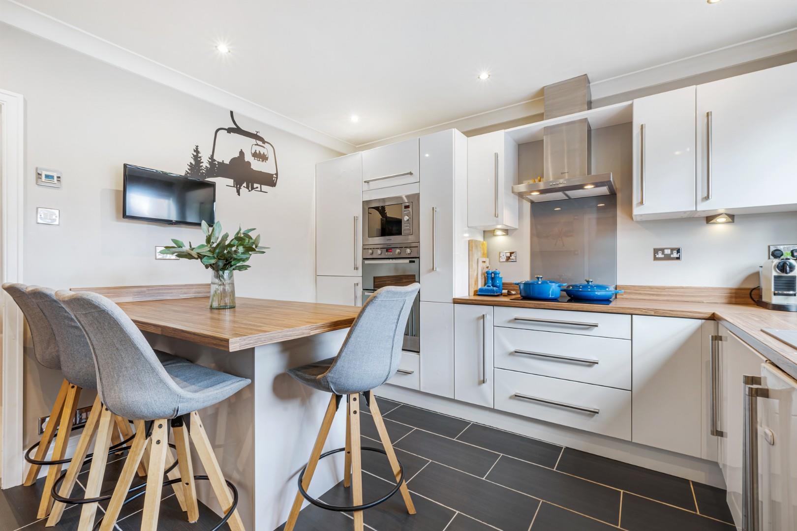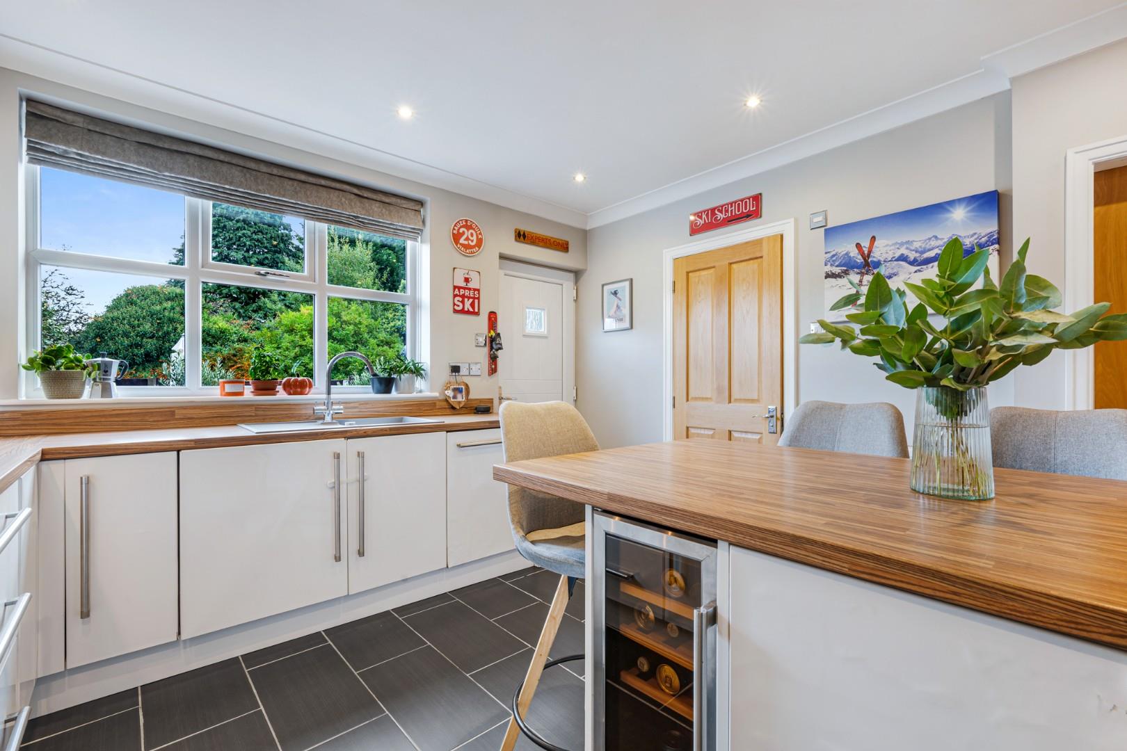 To the rear, the bright and airy ambience continues where a fully integrated contemporary kitchen with peninsula and bar seating brings together style and practicality. It’s a fabulous social space owing to the peninsula with bar seating for up to four. Integrated appliances here include a fridge-freezer, double oven, microwave, four-ring hob with extractor hood, washing machine, dishwasher, and wine fridge. The oak style worktop adds a country kitchen aesthetic, with a contrast light grey Blanco sink and drainer, and chrome swan-neck mixer tap.