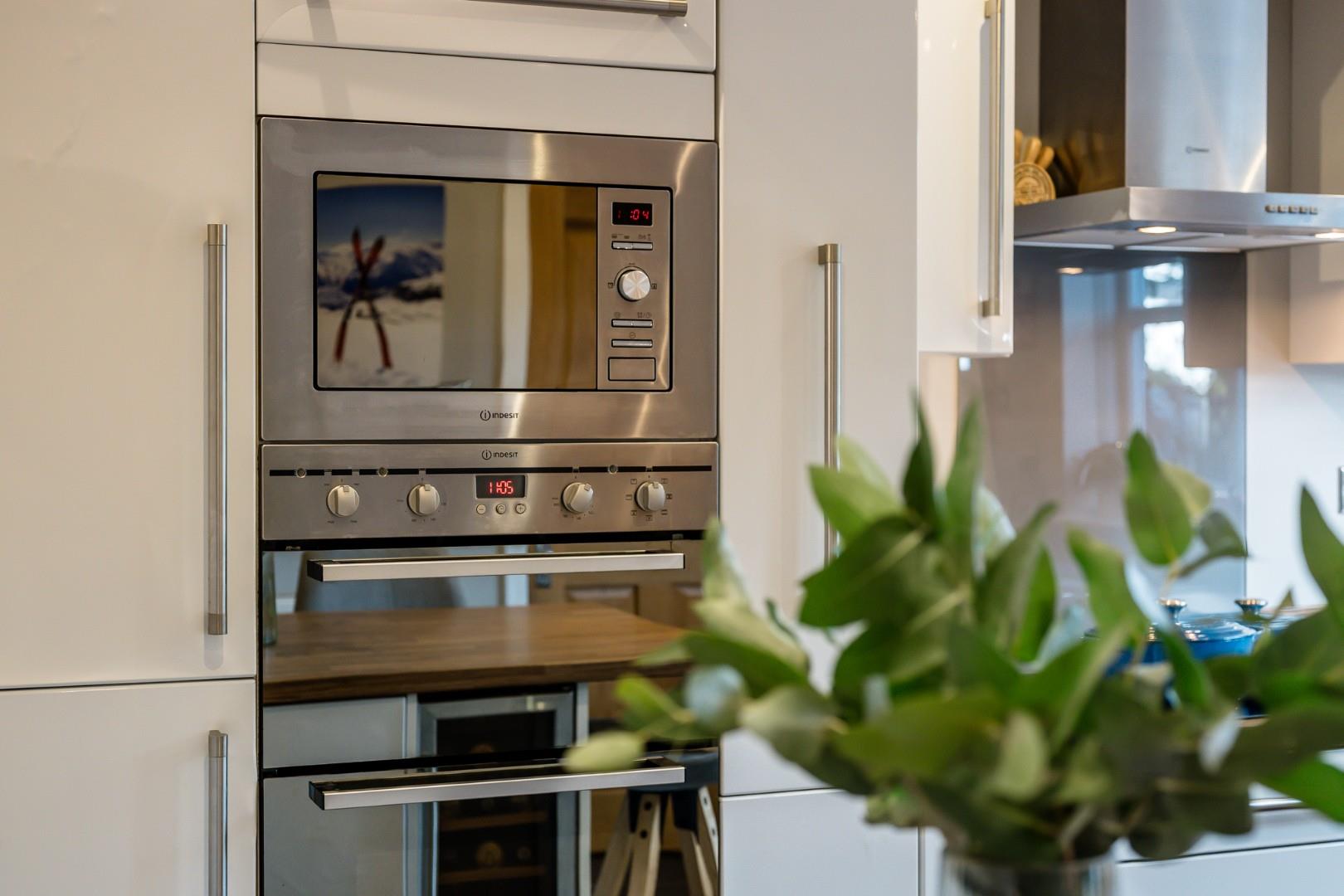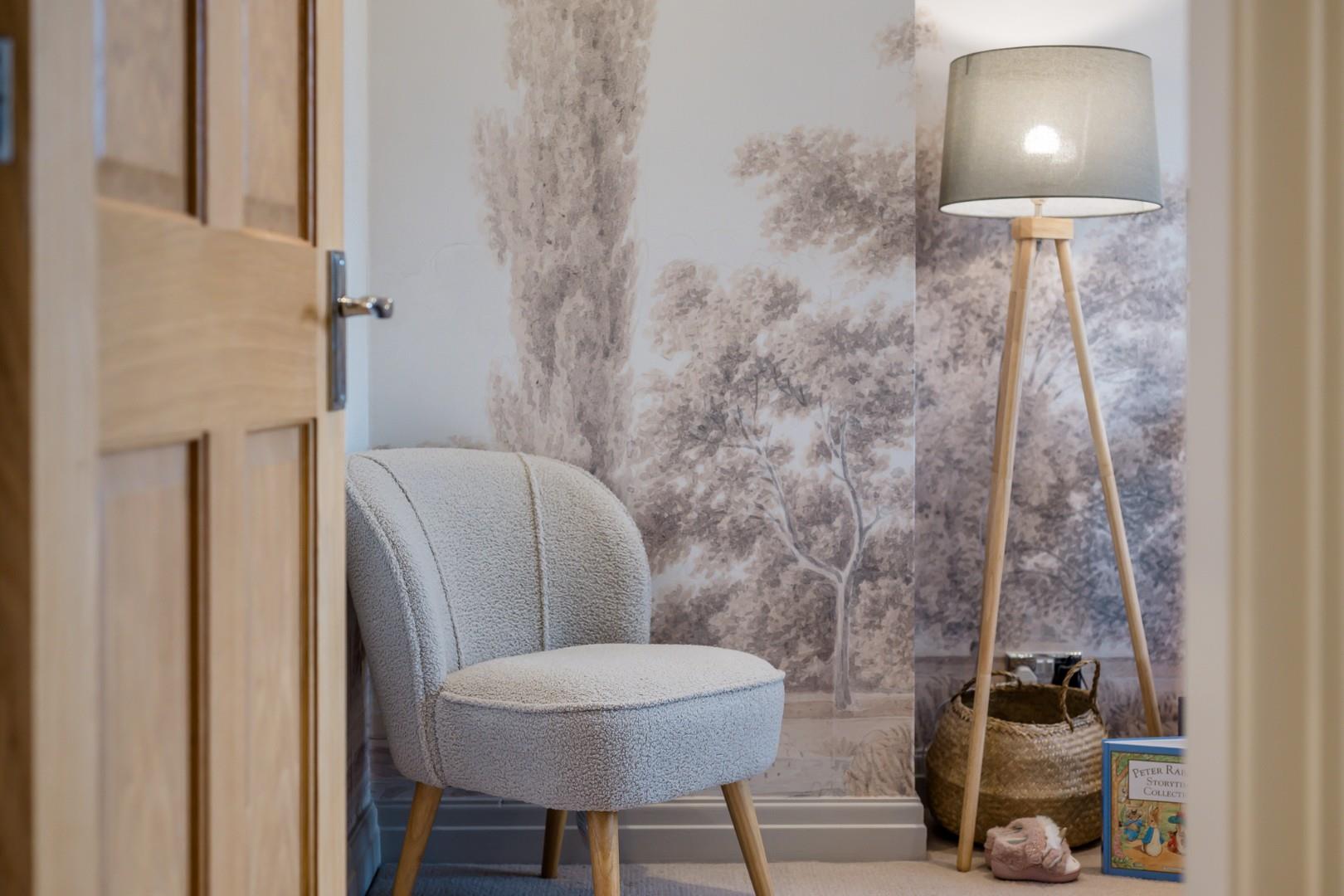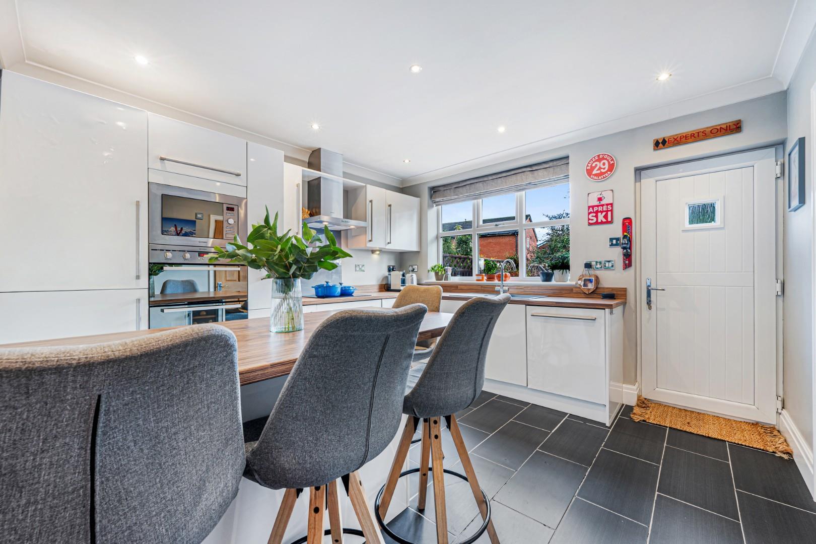 To the rear, the bright and airy ambience continues where a fully integrated contemporary kitchen with peninsula and bar seating brings together style and practicality. It’s a fabulous social space owing to the peninsula with bar seating for up to four. Integrated appliances here include a fridge-freezer, double oven, microwave, four-ring hob with extractor hood, washing machine, dishwasher, and wine fridge. The oak style worktop adds a country kitchen aesthetic, with a contrast light grey Blanco sink and drainer, and chrome swan-neck mixer tap.
