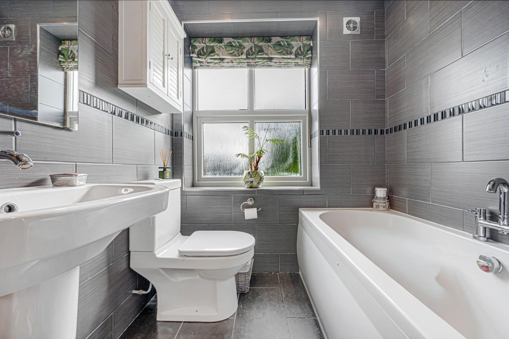 Within the fully tiled family bathroom is a modern four-piece suite, comprising a walk-in shower with rainfall head, bath, basin, WC, along with a chrome heated towel rail.