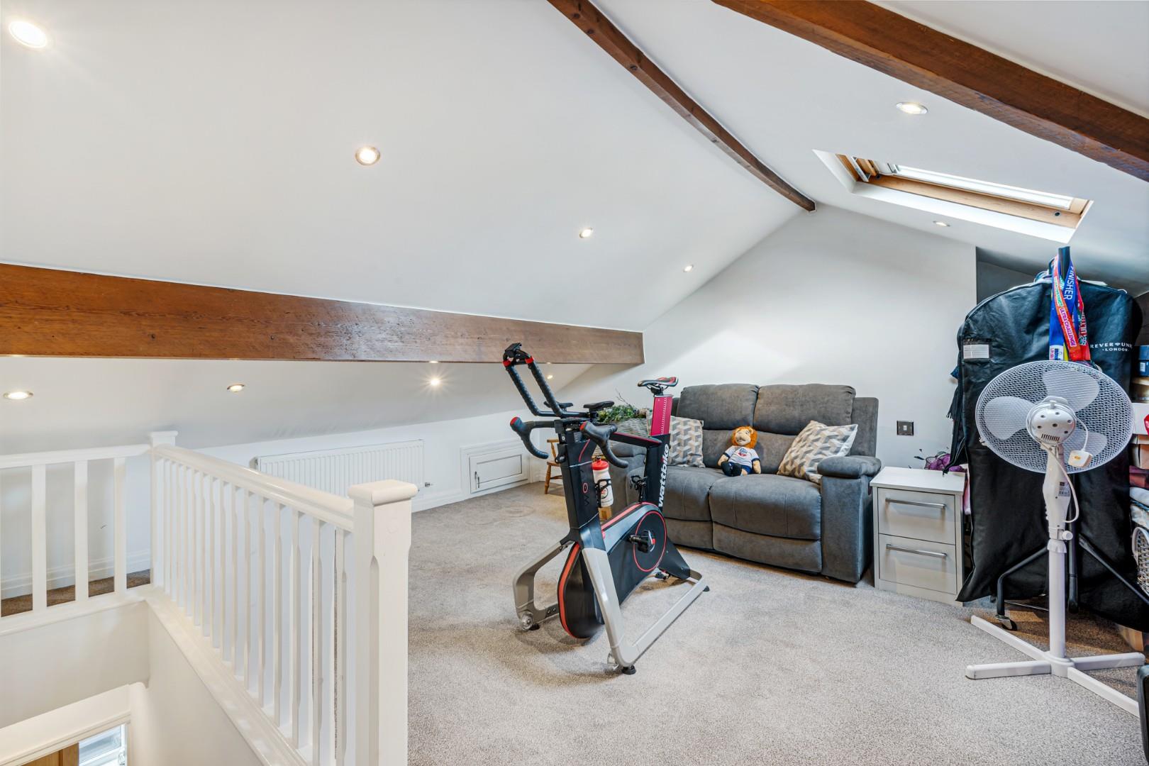 The converted loft room is accessible from the master bedroom. With exposed beams, sloped ceilings and Velux window, it’s a characterful room which gives valuable extra space, ideal for use as a home office, hobby room, exercise space, or simply as additional storage.