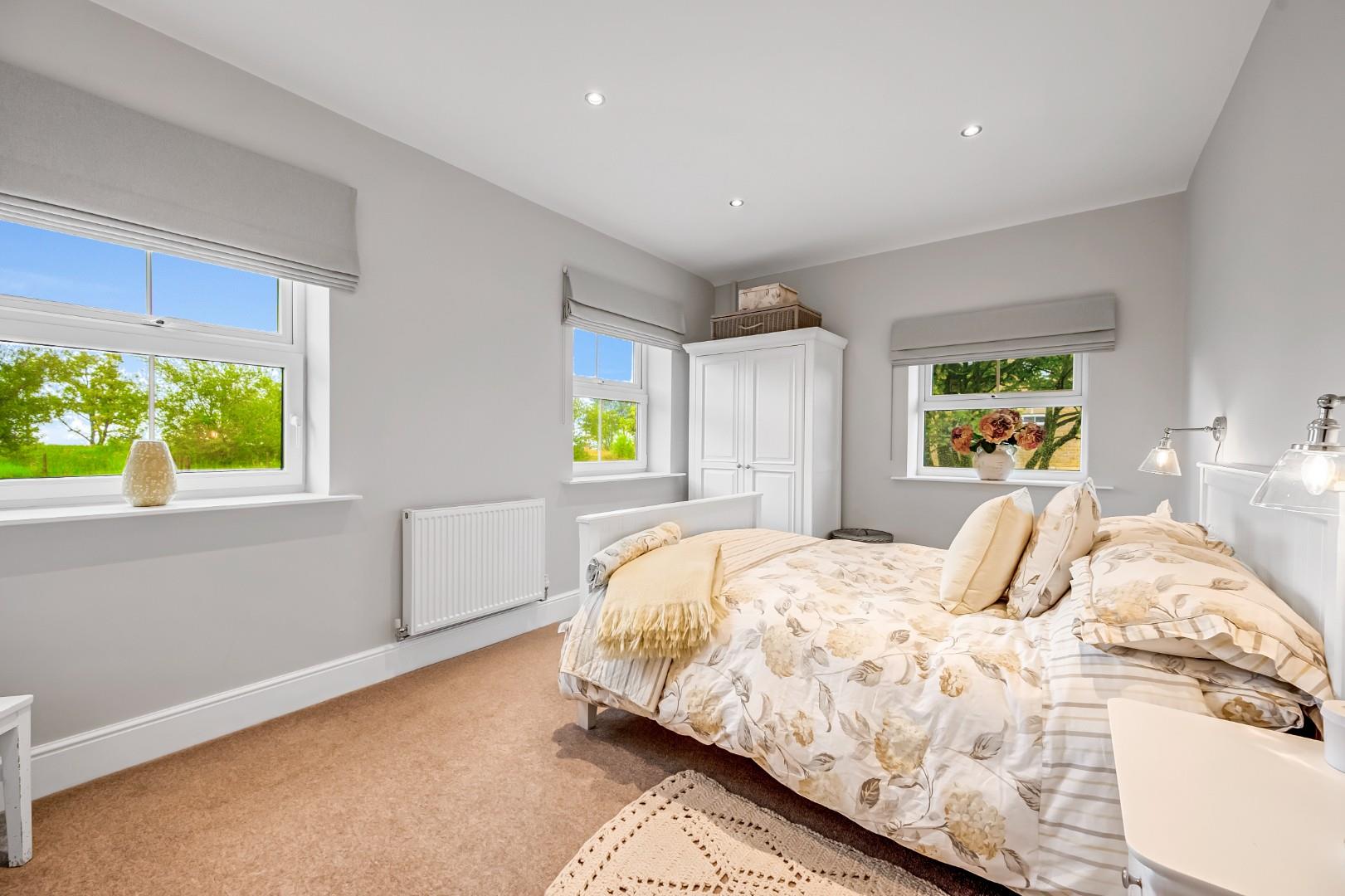 The second bedroom, located at the rear, enjoys far-reaching views across open fields, while the third bedroom is enhanced by a comprehensive range of hand-painted, solid-wood fitted furniture, giving another premium, bespoke finish.
