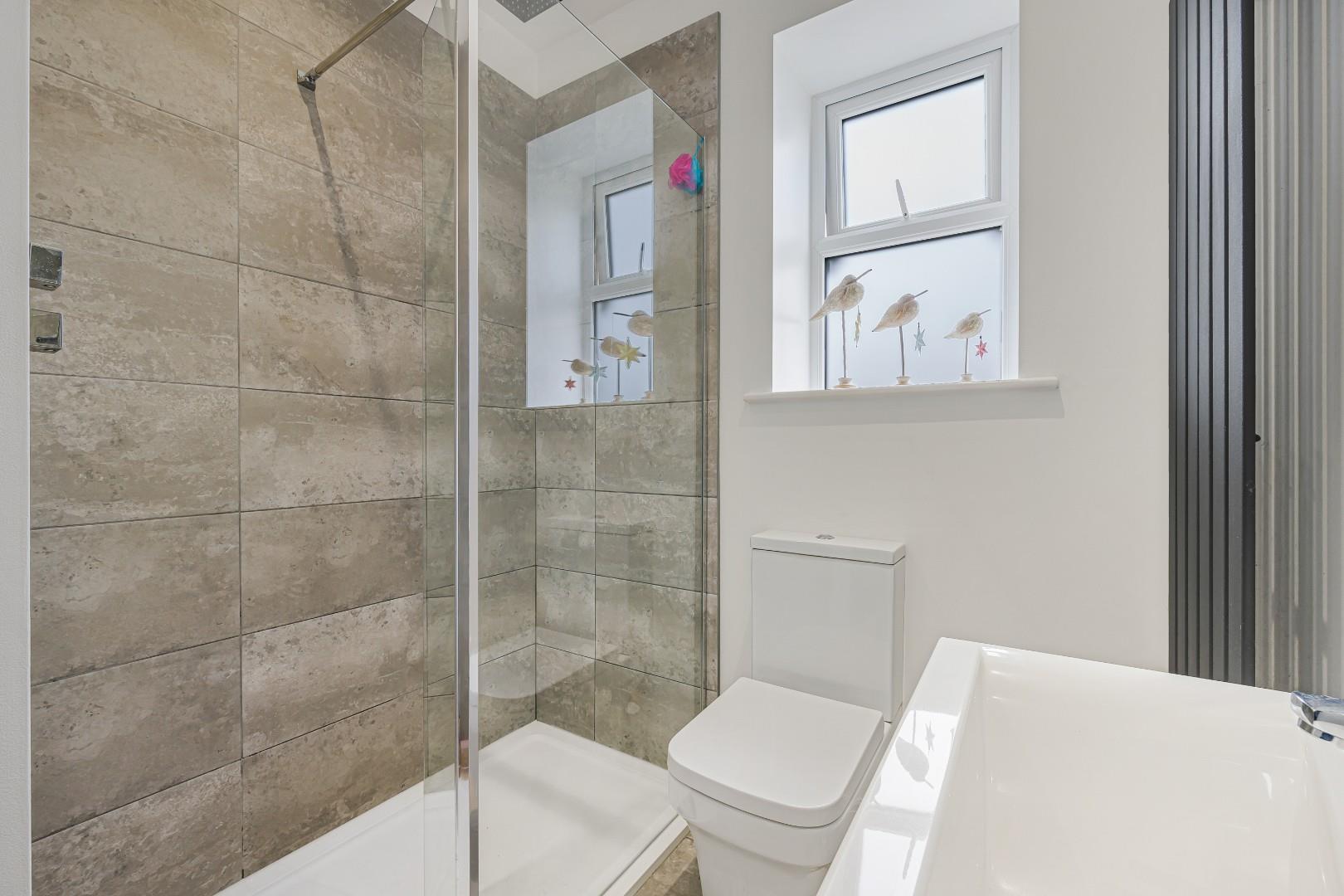 The property benefits from a stylish and contemporary bathroom, finished to a high standard with quality fittings throughout. The suite comprises a sleek walk-in shower with glass enclosure and modern rainfall shower head, complemented by elegant full-height tiling that adds a refined and luxurious feel. A modern low-level WC and a vanity unit with integrated wash basin provide both practicality and additional storage, enhancing the room’s functionality. A heated towel radiator adds comfort and convenience, while the overall design is clean, well-maintained, and thoughtfully arranged to maximise space. This well-appointed bathroom offers a perfect blend of style and practicality, ideal for modern living.
