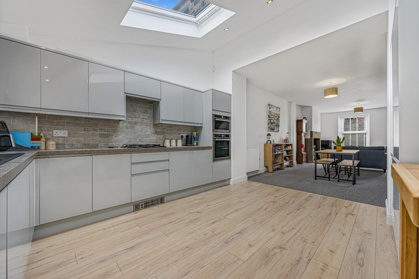 This impressive open-plan kitchen and living space has been thoughtfully designed to create a bright and highly functional heart of the home. The brand new kitchen features sleek, handle less cabinetry, integrated appliances, and a generous worktop space, all complemented by stylish finishes and a contemporary layout. Large skylights flood the kitchen area with natural light, enhancing the sense of space and creating an inviting atmosphere throughout.