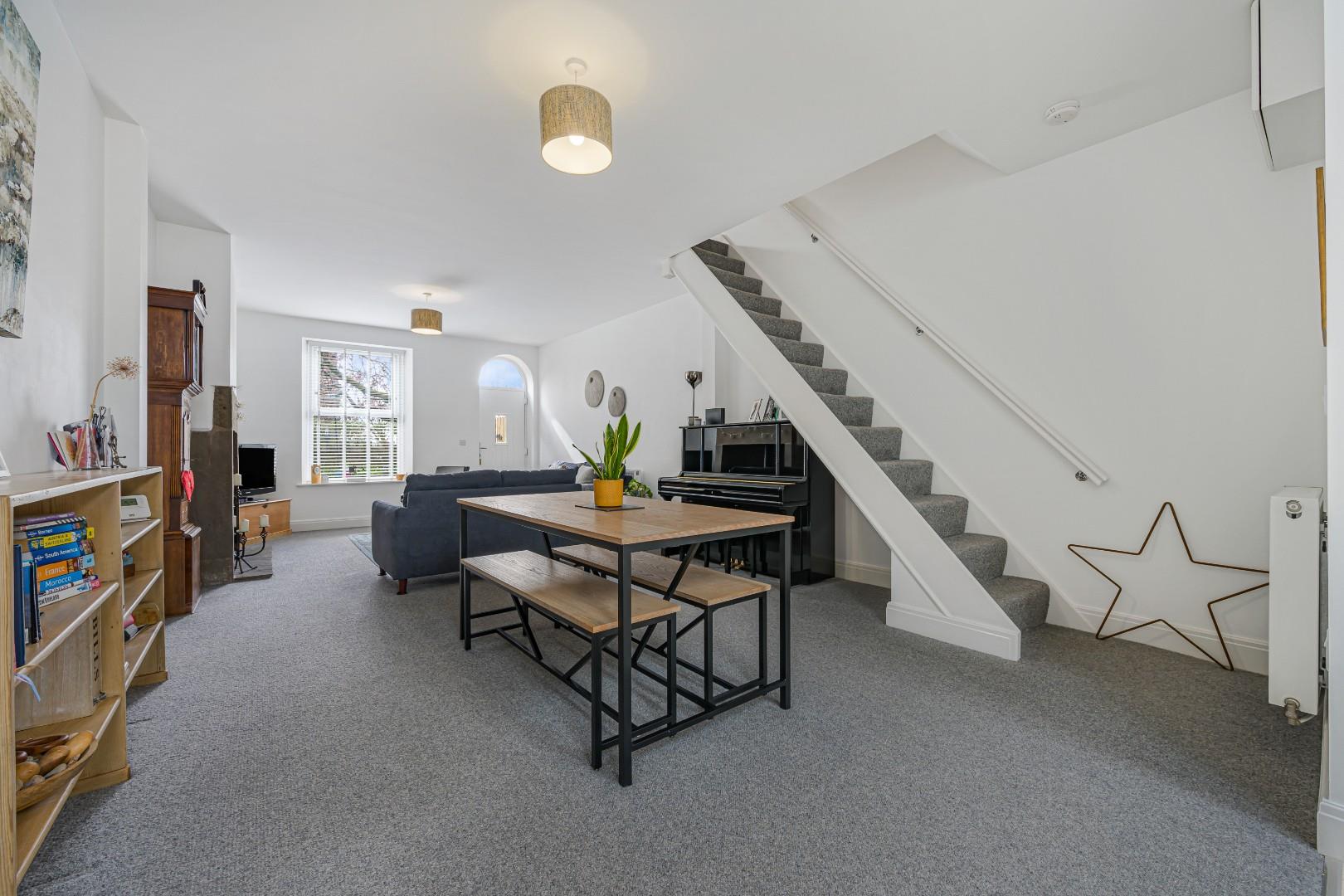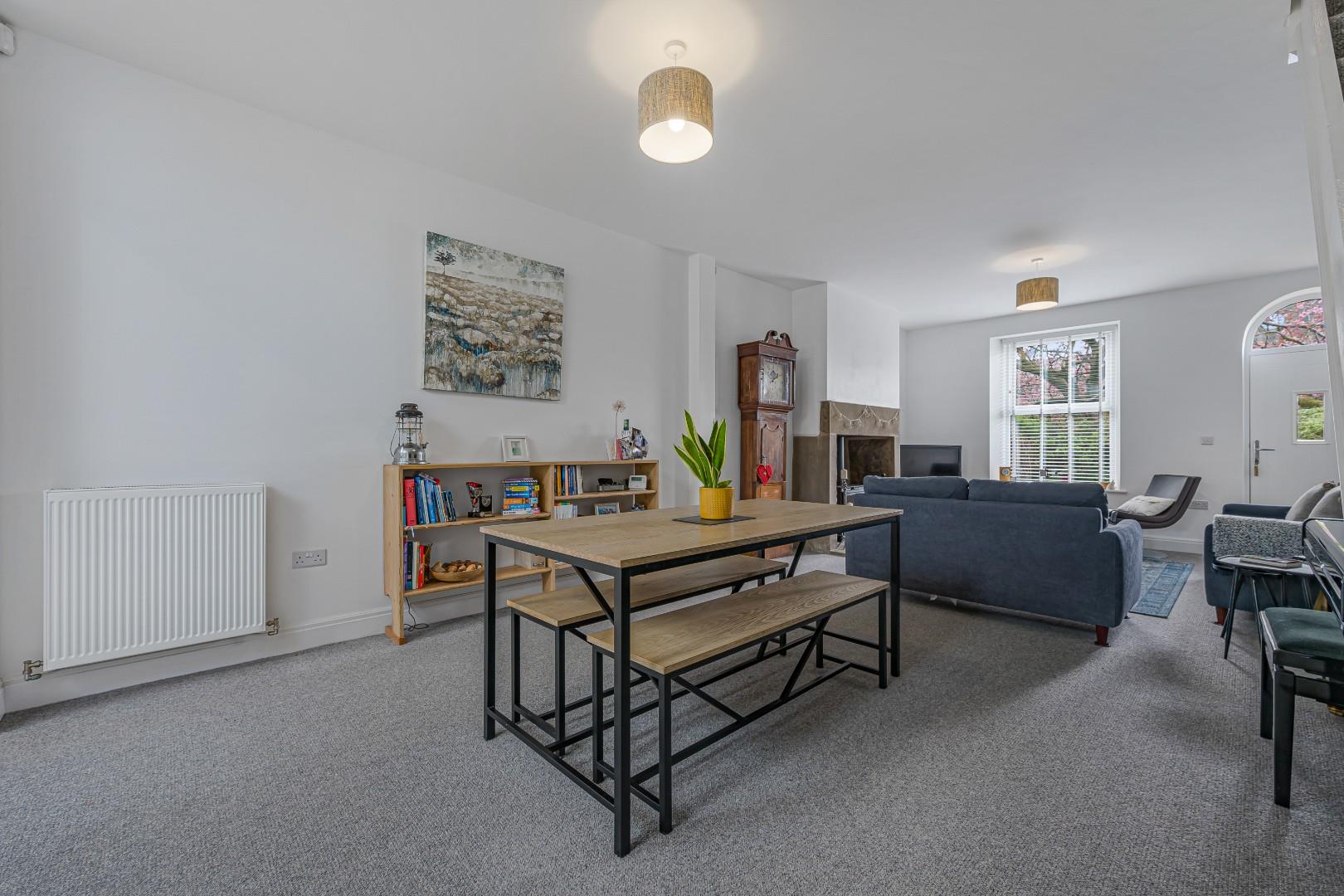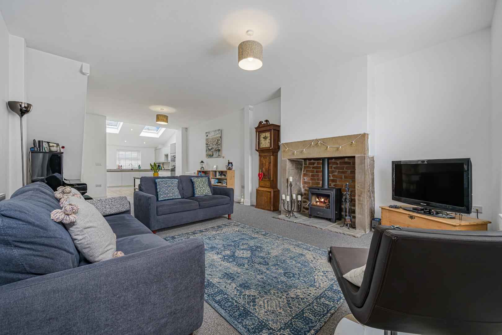 The living area offers a seamless transition from the kitchen, providing a comfortable yet elegant setting ideal for both relaxing and entertaining. A charming feature fireplace with a log-burning stove adds warmth and character, beautifully contrasting with the modern aesthetic. The elongated layout allows for flexible furniture arrangements, including a dedicated dining area, while neutral décor and quality flooring complete this sophisticated and versatile living space.
