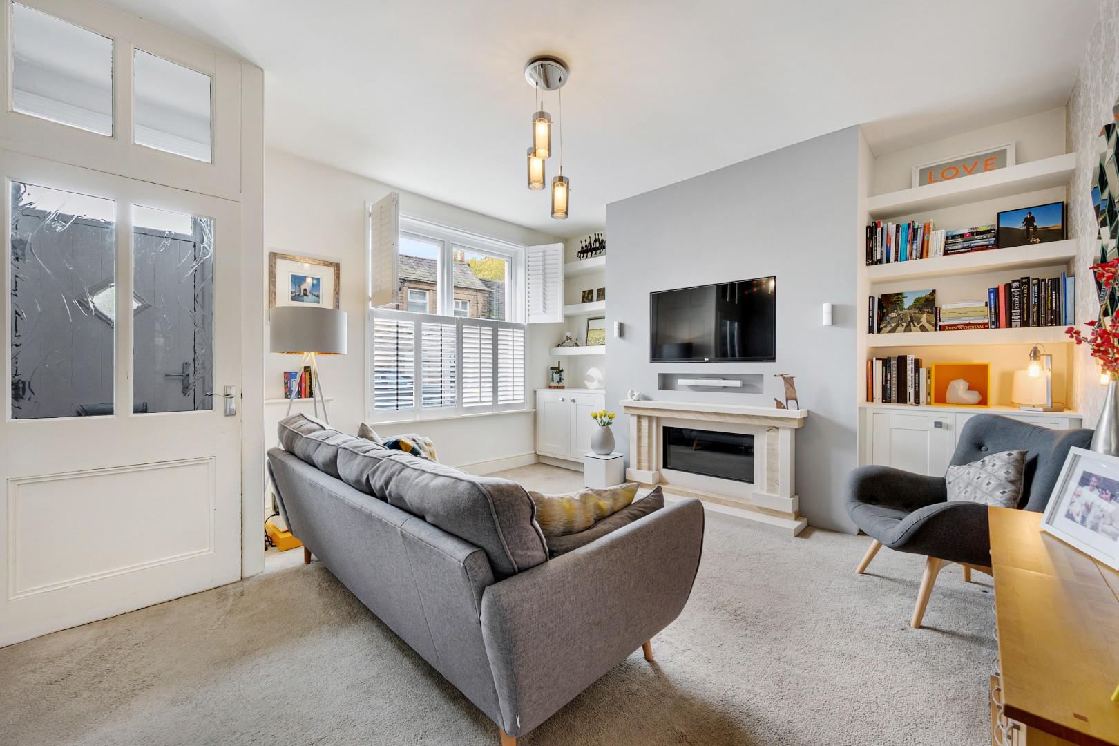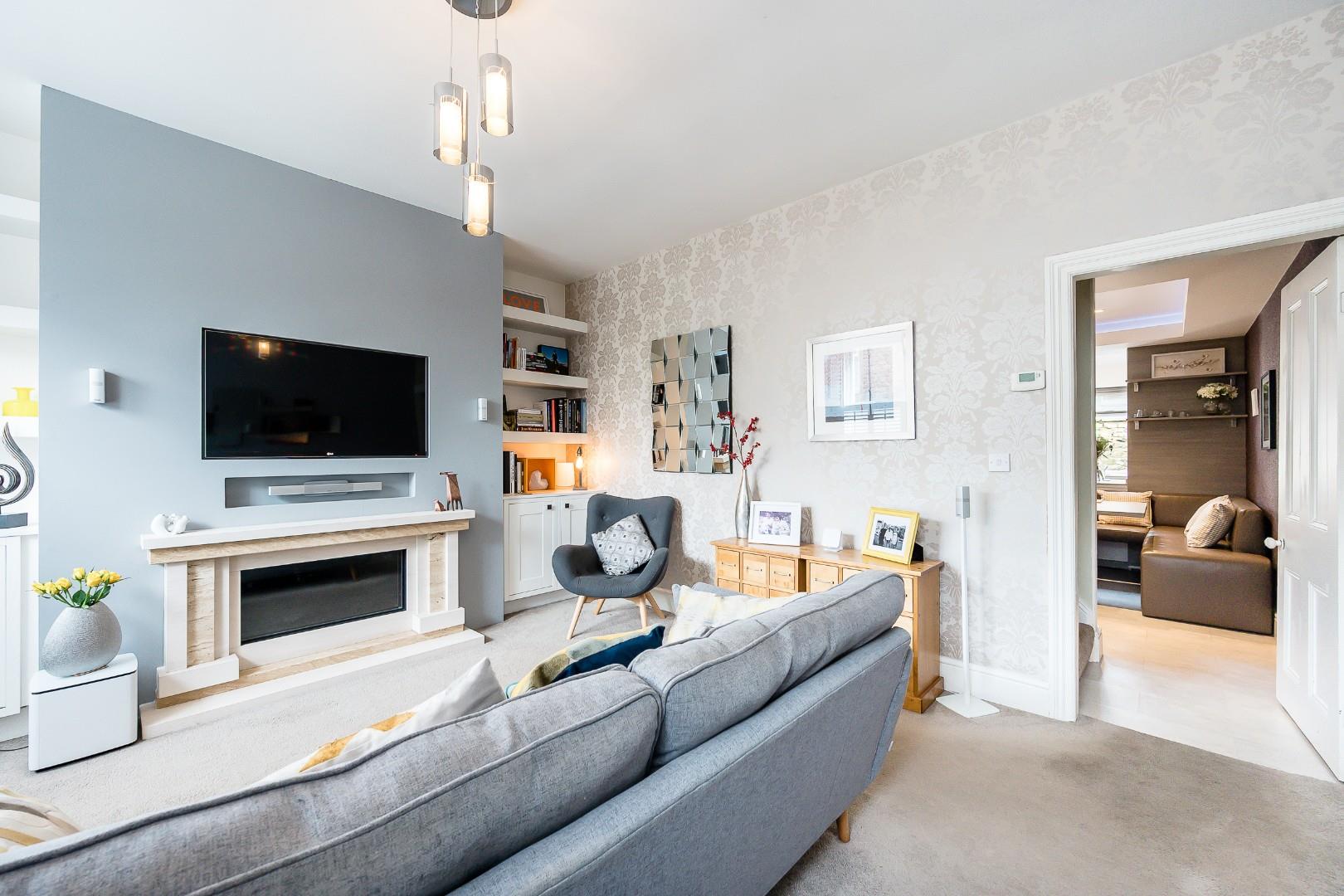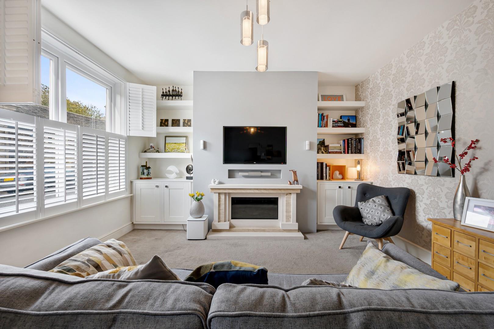A traditional entrance vestibule welcomes you into the home and leads into the front lounge, where window shutters immediately give that country cottage aesthetic, while a contemporary feature fireplace gives a nod to the recent refurbishment. The décor here is fresh and neutral, complementing the bright and airy feel. Besides the chimney breast is a range of fitted shelving and cabinetry, providing handy storage.
