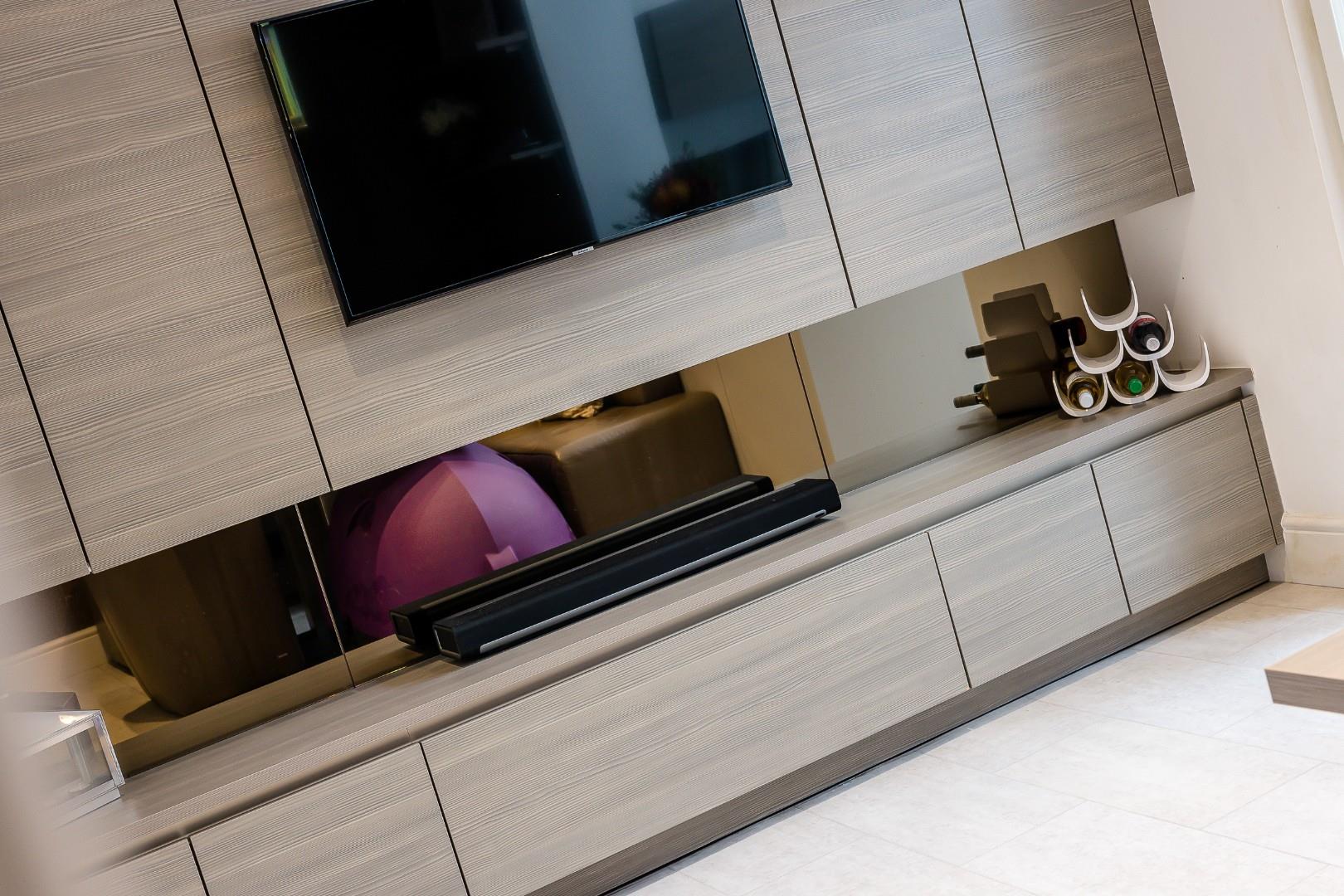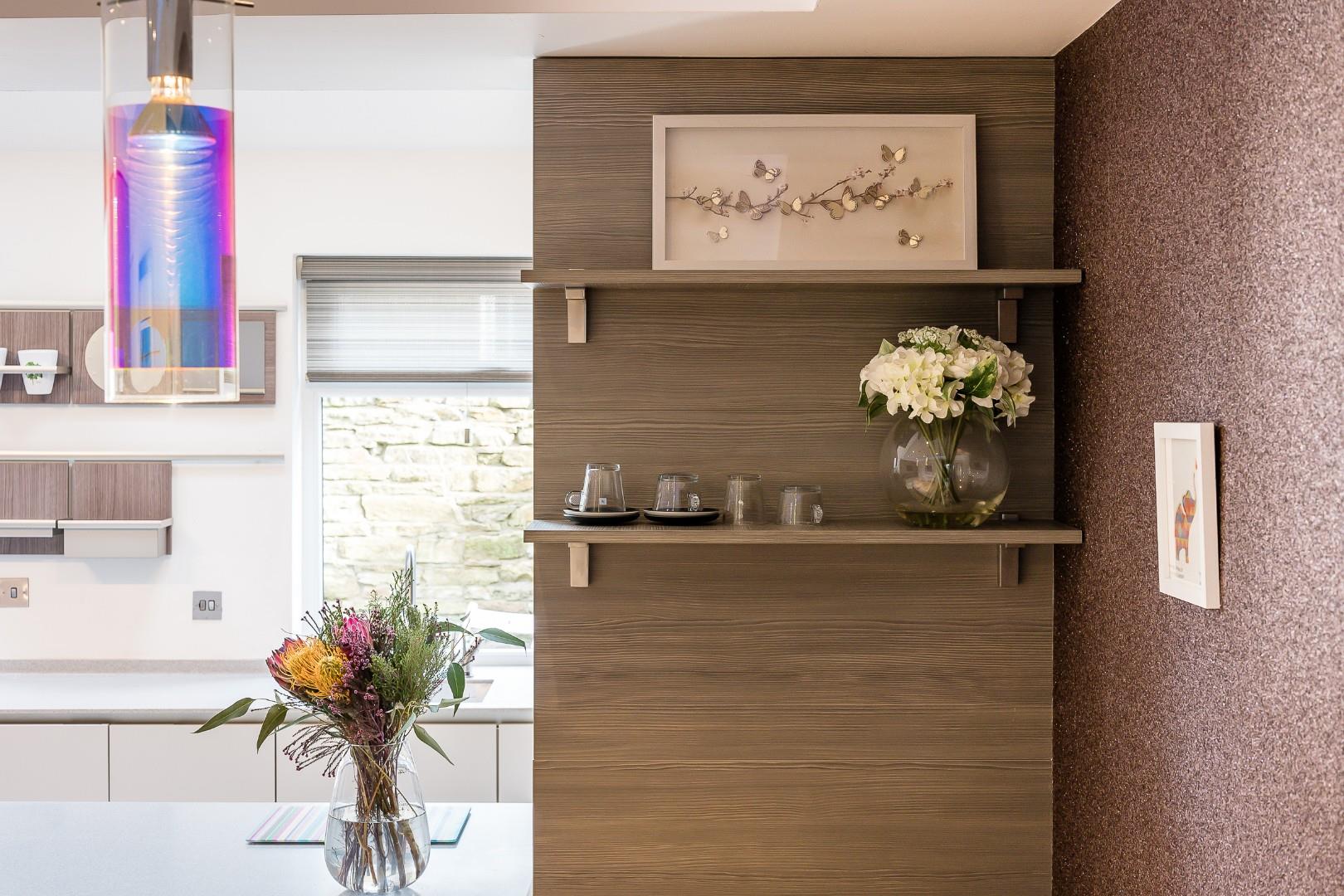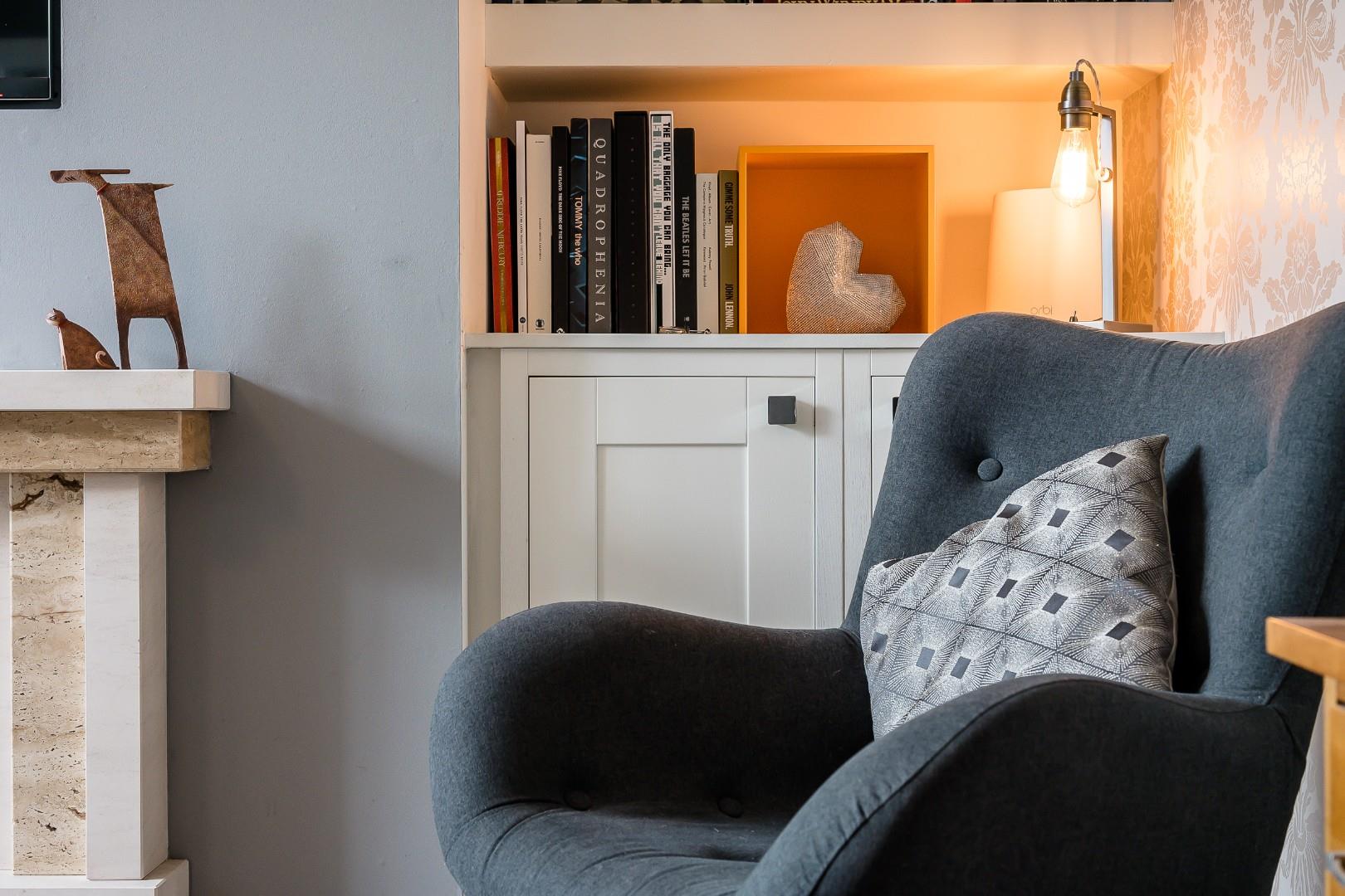 A traditional entrance vestibule welcomes you into the home and leads into the front lounge, where window shutters immediately give that country cottage aesthetic, while a contemporary feature fireplace gives a nod to the recent refurbishment. The décor here is fresh and neutral, complementing the bright and airy feel. Besides the chimney breast is a range of fitted shelving and cabinetry, providing handy storage.