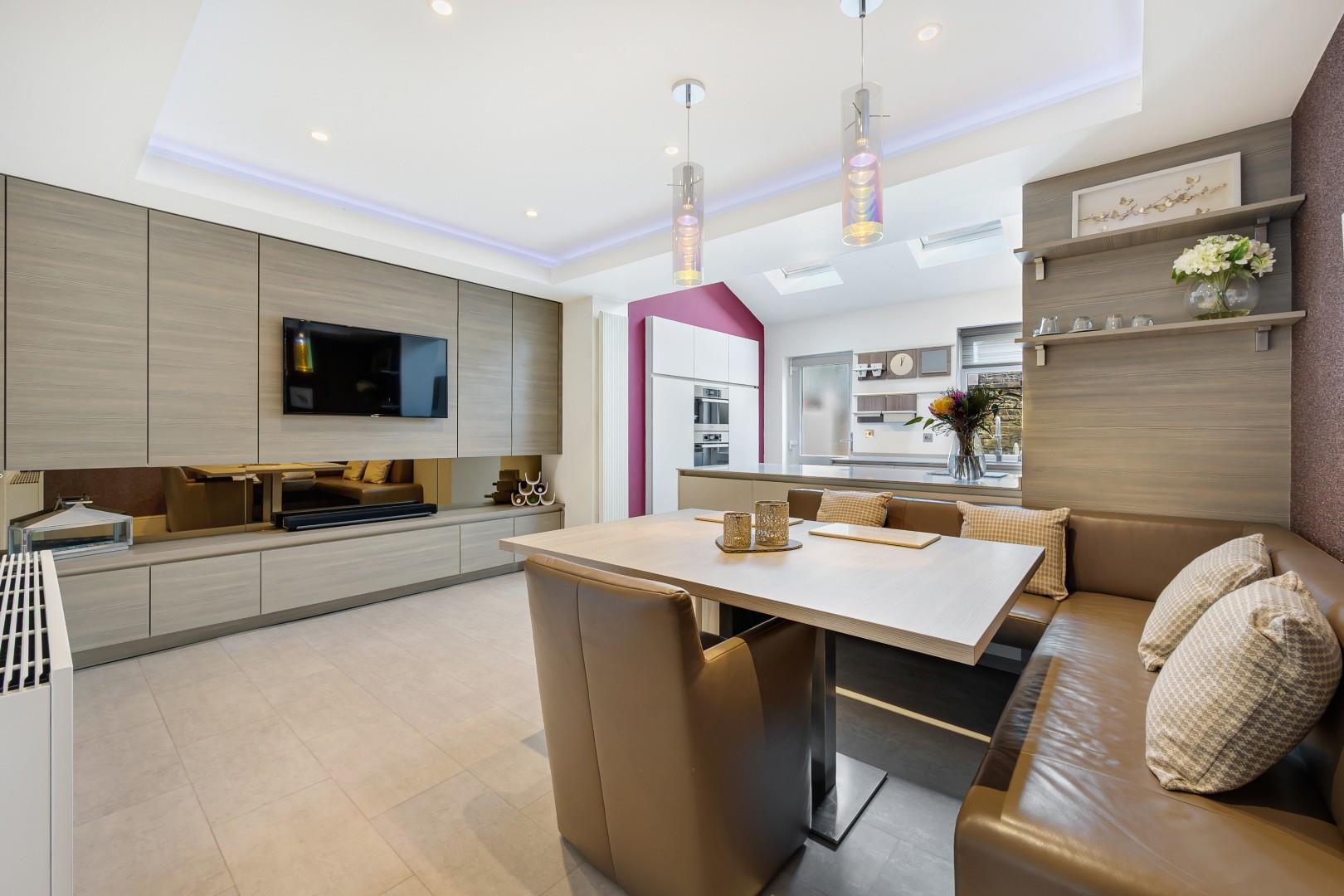 Through to the rear and the home opens into the impressive open plan living space which is both practical and stylish alike… A modern recessed ceiling with inset lighting adds a trendy finish to the dining and social area while complementing the modern media wall. The media wall gives plenty of storage space while again bringing a notable contemporary style to the room. And the current owner has a fantastic set up with a dining table and banquette seating that matches the décor just perfectly, which is available to purchase upon separate negotiation if desired.