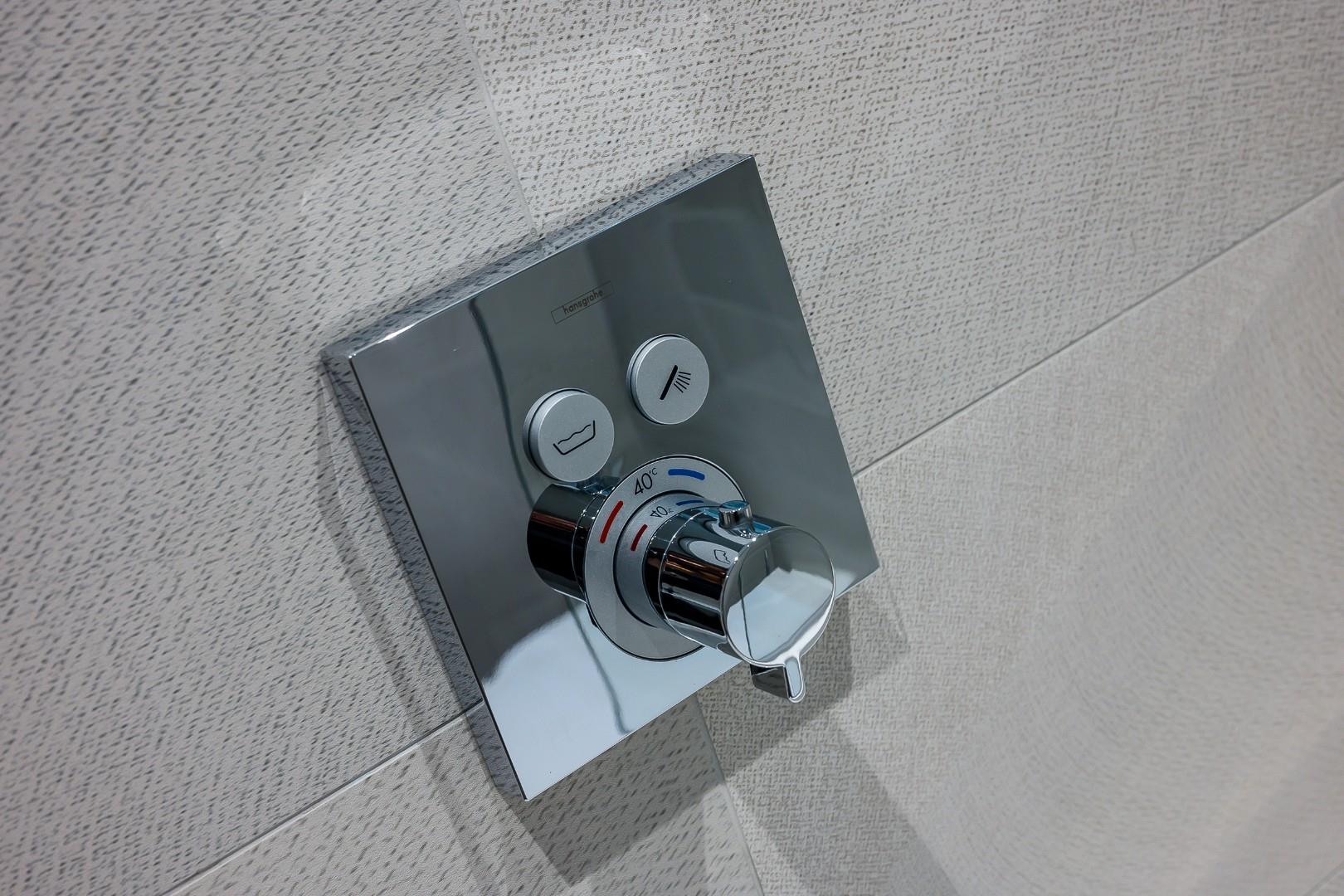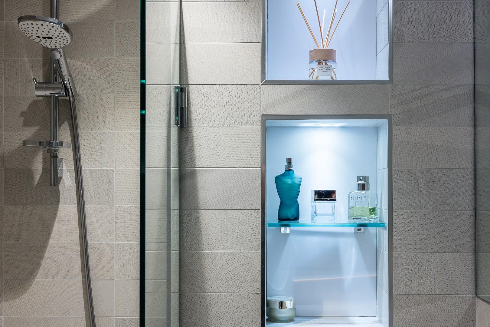 Like the social space downstairs, the family bathroom features trendy recessed ceiling lighting, plus a large wall mirror, textured wall tiling and wood effect floor which together create a boutique, stylish finish. The three-piece suite comprises a bath with Hansgrohe shower, vanity basin with Hansgrohe taps integral storage, and WC.