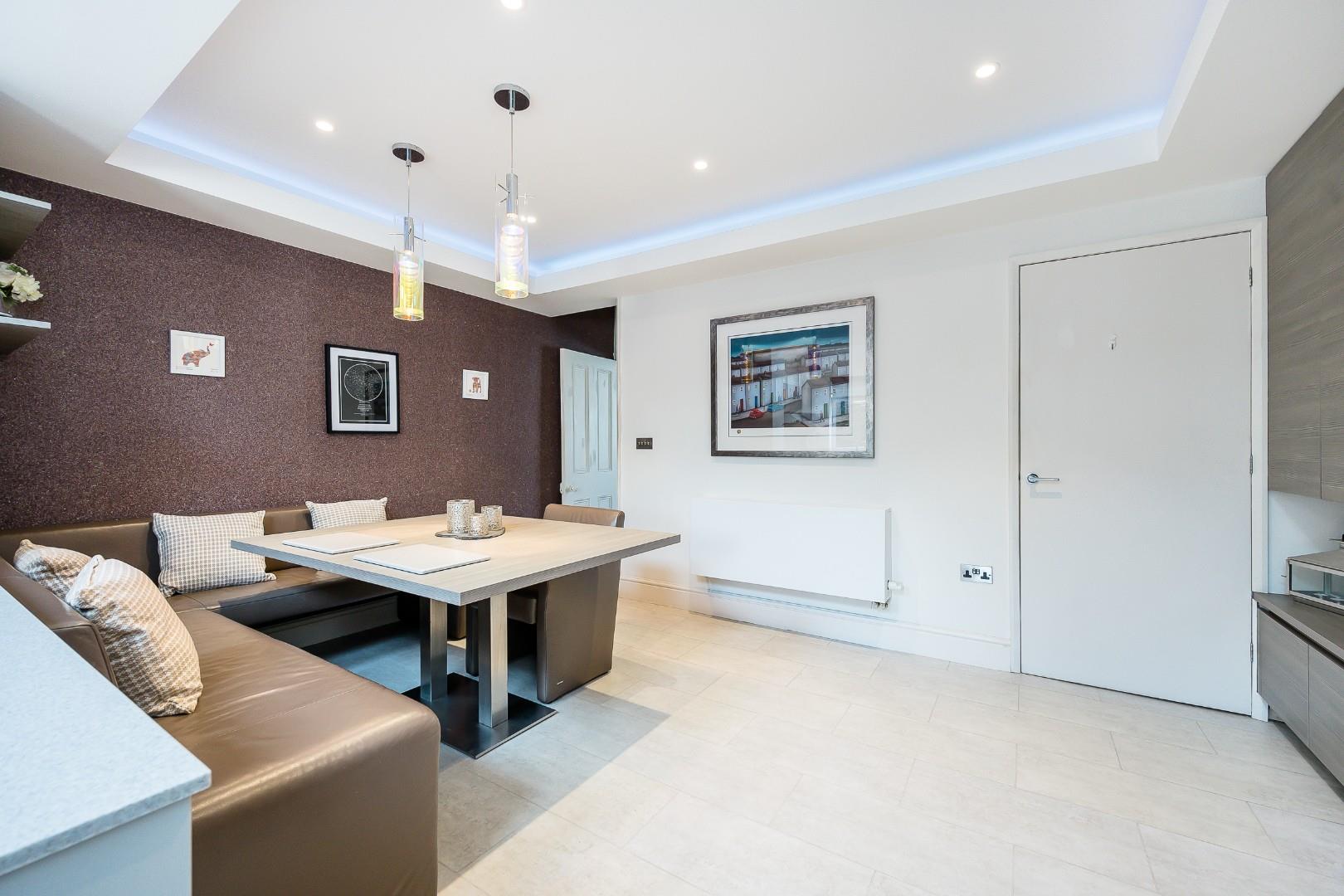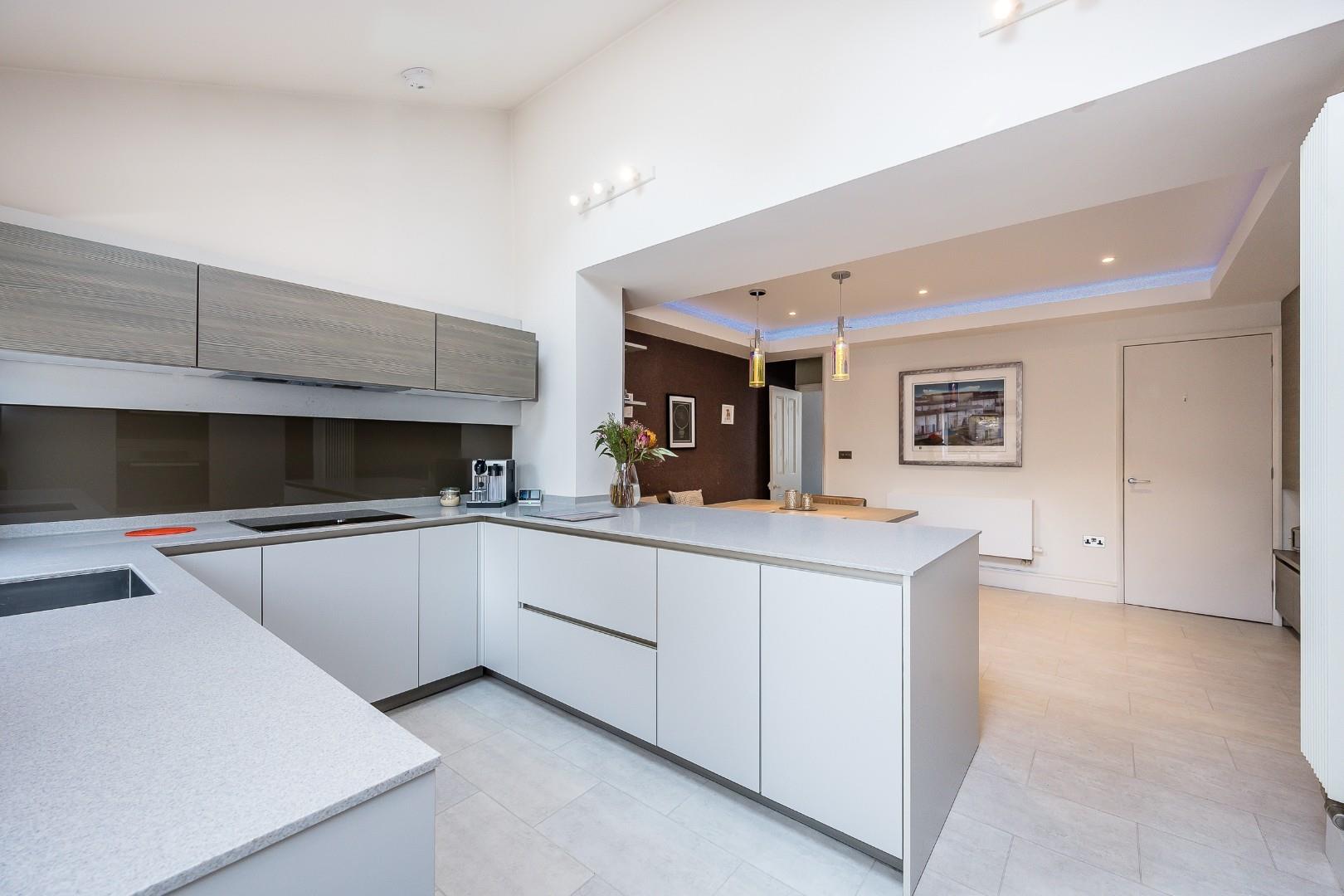 Within the extended aspect of the downstairs living space is a top quality SieMatic kitchen, fitted with a range of premium integrated appliances, including a full length Miele fridge, oven and steam oven, Neff freezer and induction hob with extractor hood, plus an integrated washer and dishwasher. A stainless steel sink is seamlessly set within the Corian worktop, with a multifunctional chrome swan neck mixer tap, plus a Quooker tap too! Everything at 84 High Street is top quality and evidently well cared for – perfect and easy to move into. The vaulted ceiling and Velux windows within the kitchen create that desirable bright and airy ambience and again add to that premium modern style.