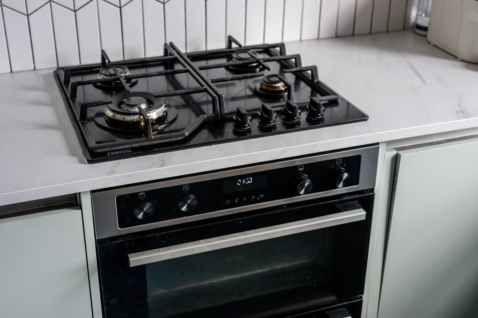 The kitchen, newly installed in 2024, is fitted with modern cabinetry, tiled statement flooring and complementary splashbacks, and a full range of integrated appliances including double oven, four-ring gas hob, extractor, dishwasher, and fridge freezer.