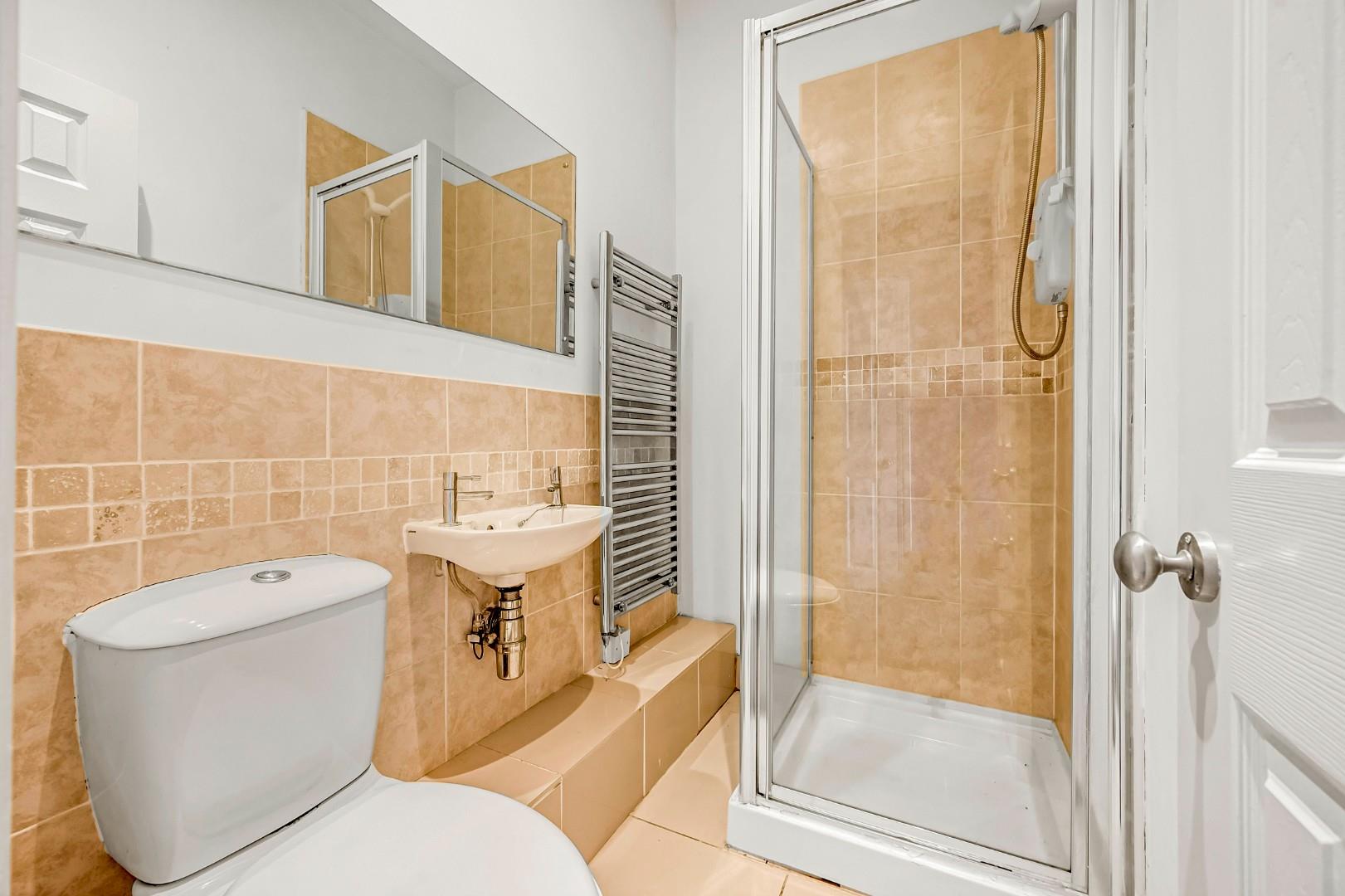 Upstairs, the master bedroom is a generous double with its own en suite, fitted with a three-piece suite including shower, wash basin, and WC with contemporary tiled walls. The second bedroom is another good-sized double overlooking the rear, while the third bedroom offers versatility as a children’s bedroom or home office. Completing the first floor is a stylish four-piece family bathroom with tiled-in bath, walk-in shower, wash basin, and WC, finished in a way that complements the overall style of the property.