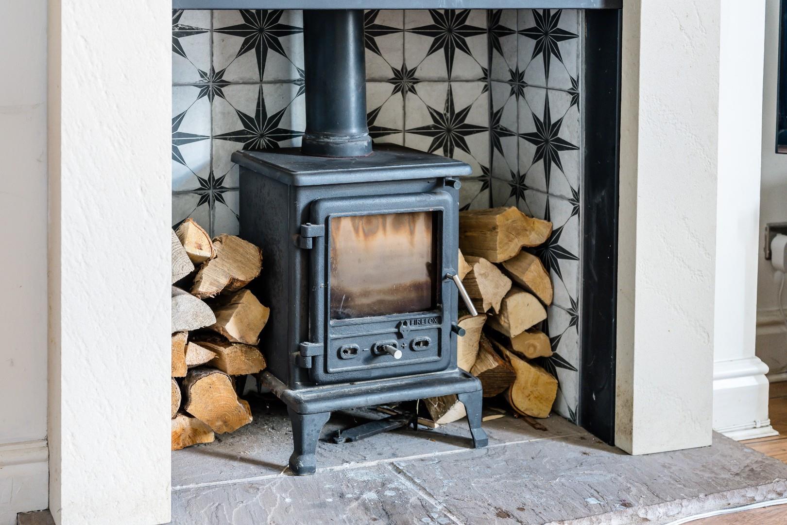 The property opens into a welcoming entrance hall, immediately showcasing the high ceilings and sense of space. To the front, the lounge is a cosy retreat featuring a log burner set within a tiled alcove, while to the rear, a second reception room with extended aspect featuring a vaulted ceiling and Velux window provides an airy and versatile family living space. This open-plan area is flexible for use as an additional lounge and dining room, which further flows onto the kitchen.