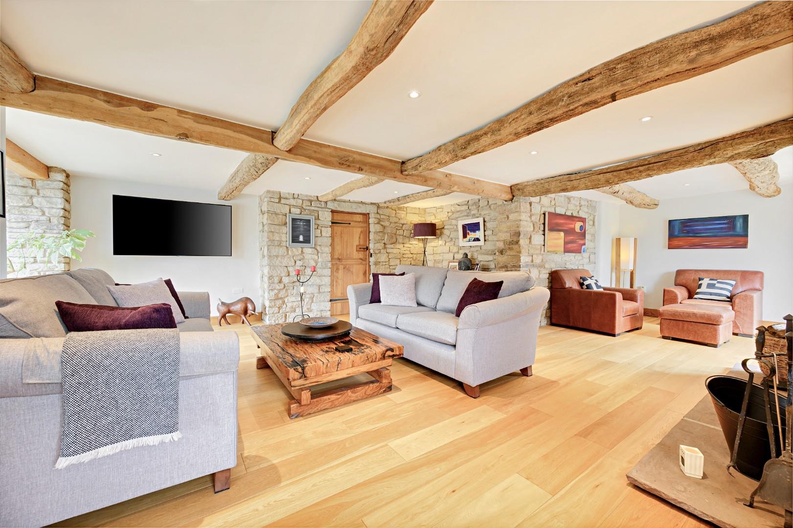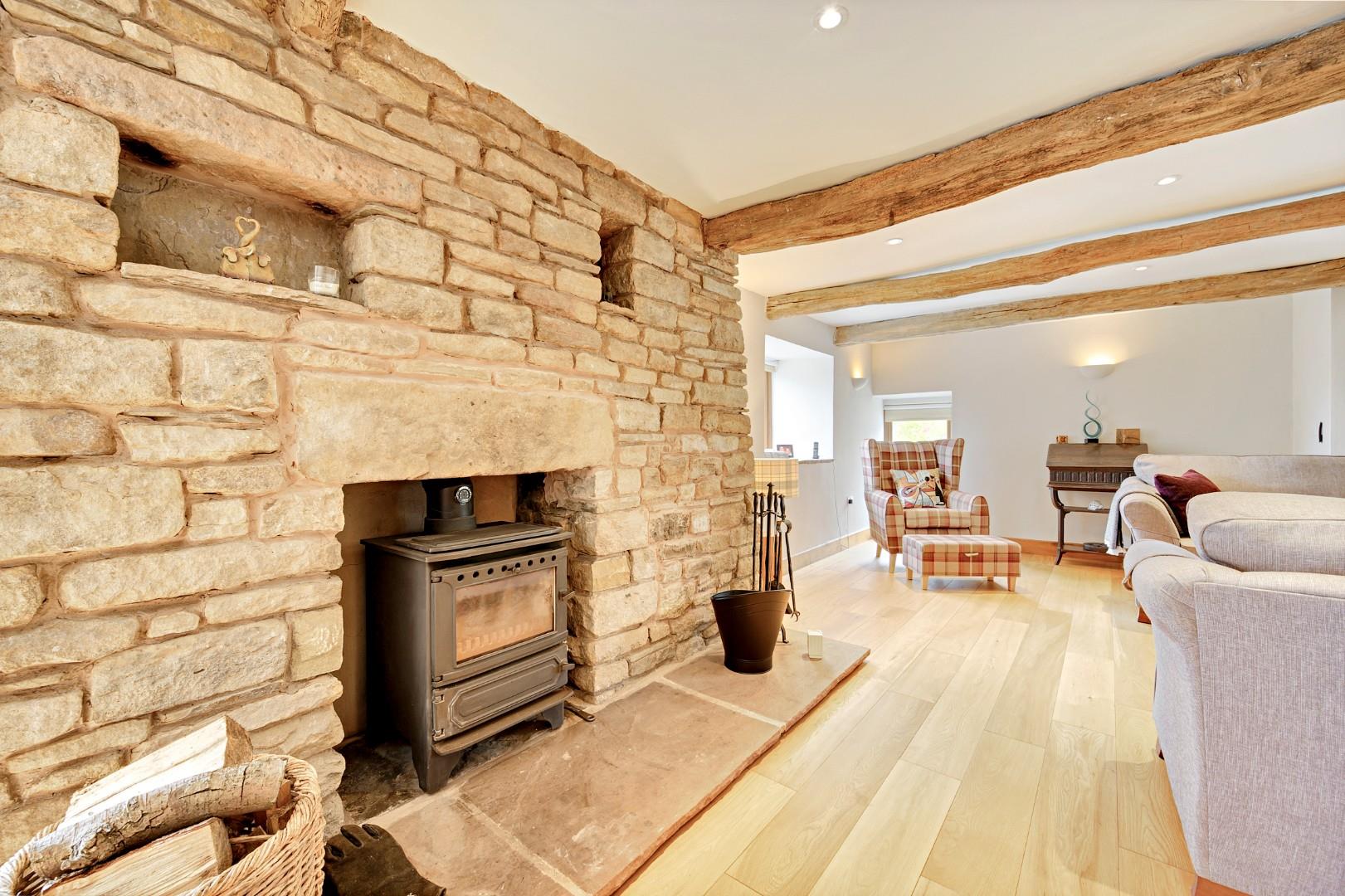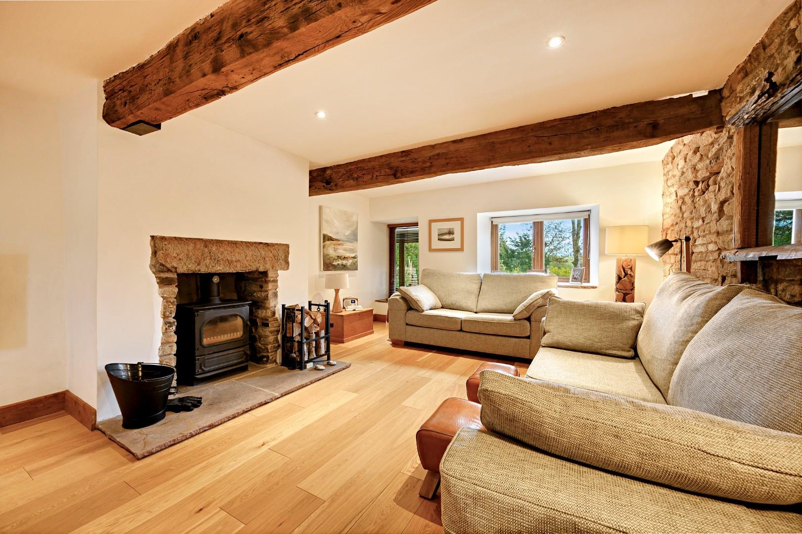 The main living room is situated to the left of the hall, and due its fantastic size it offers several seating areas, with high quality sliding doors and patio doors opening onto two separate patio areas. The stone chimney breast and original oak beams add to the character, and the multifuel burner provides a cosy warming glow.
