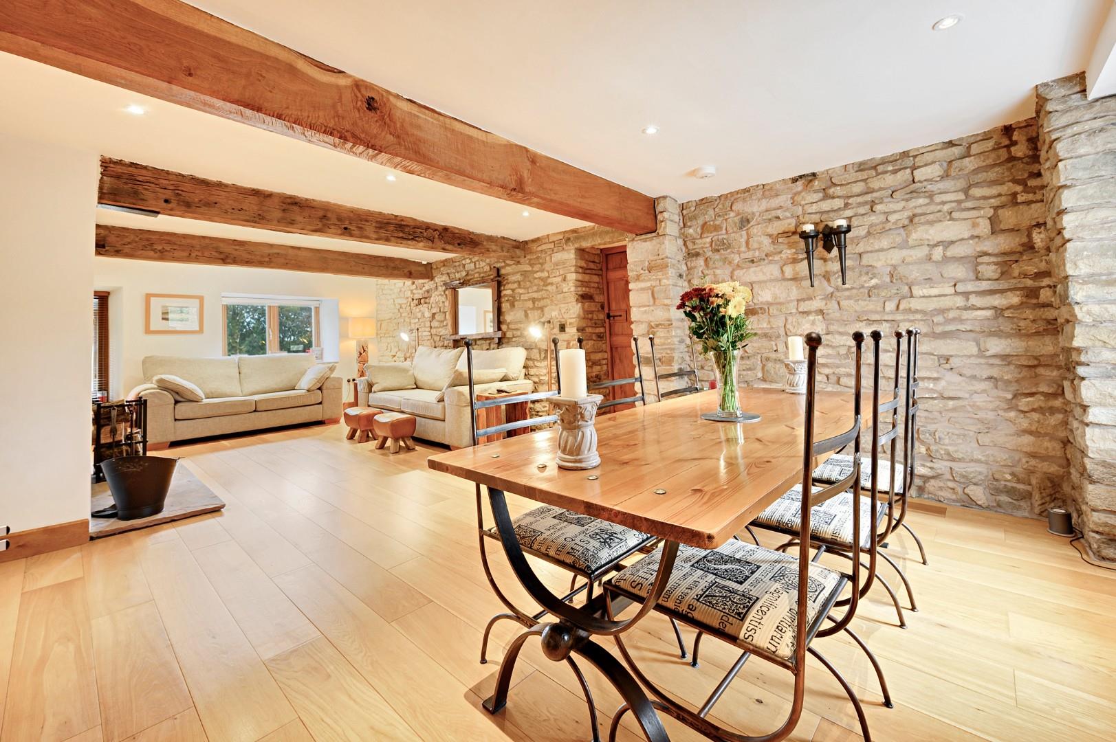 On the opposite side of the hall, the family lounge and dining area continue the charming character and practical appeal, with another log burner and multifunctional space. Another substantial sitting area can be enjoyed here – an ideal spot for the kids – and the room is adjacent to the kitchen, making it well-suited for use as a dining area too.