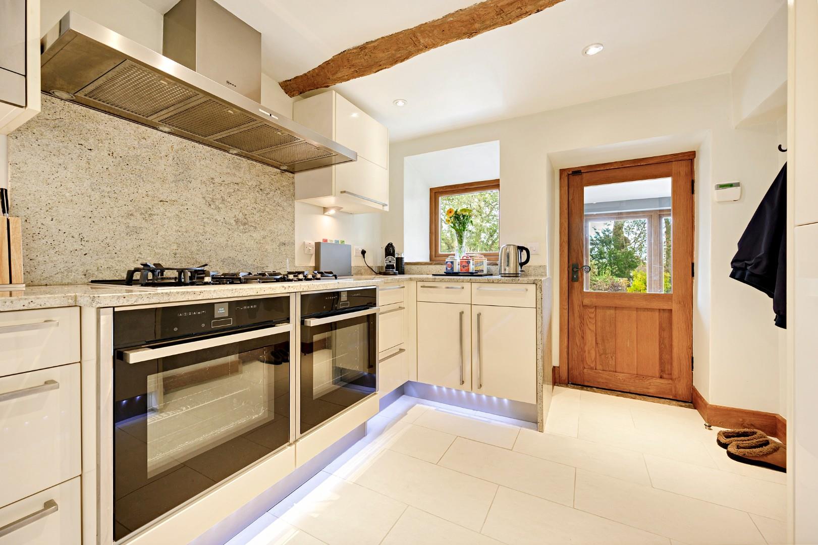 Off the kitchen is a large utility room, where the high quality of the kitchen design continues, featuring granite worktops, premium German kitchen units, a Franke sink and tap and porcelain tiles. There's heaps of extra storage and worktop space, as well as an extra freezer, and plumbing for the washer and dryer. The utility also has ample space for a table and chairs, as well as an external access door, giving it versatility in use. It would be handy to use it as a boot room too – a place to keep muddy boots and wet paws after strolls in the surrounding countryside.