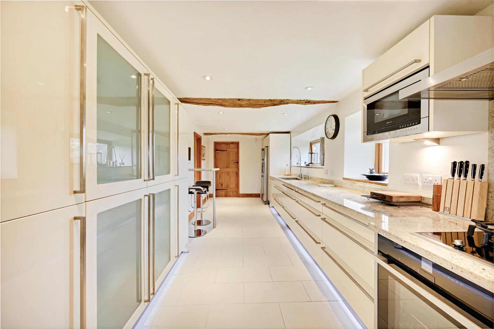 The kitchen spans the full depth of the original property, giving ample space for even the largest of families. Stylish textured porcelain tiles are featured on the floor, complementing the beautiful solid granite worktop and modern cabinetry, which houses a range of Neff integrated appliances, including a five-ring gas hob and extractor hood, two full size ovens, microwave, and dishwasher. Other practical features include an inset Franke sink with swan-neck flexi tap, breakfast bar with seating for two, and a variety of storage options. There is also an allocated space for an American-style fridge-freezer.