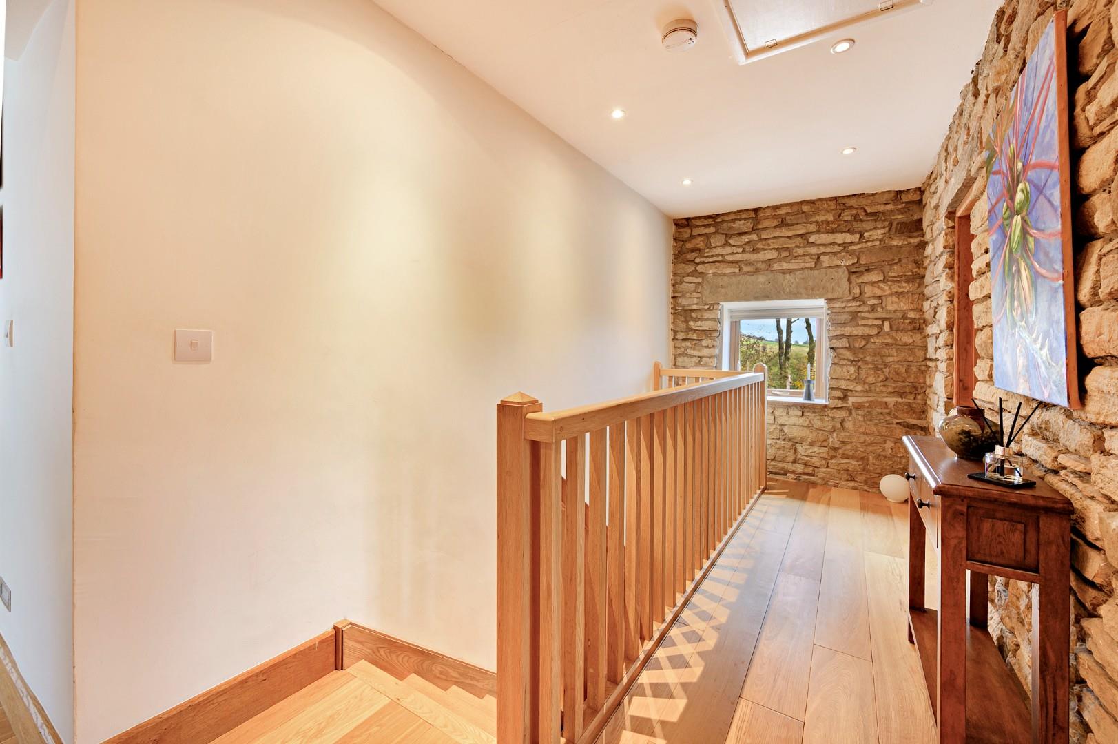 Ascending the beautiful bespoke oak staircase, the spacious landing features more exposed stone and solid oak flooring, connecting the bedrooms and bathrooms with a small corridor.