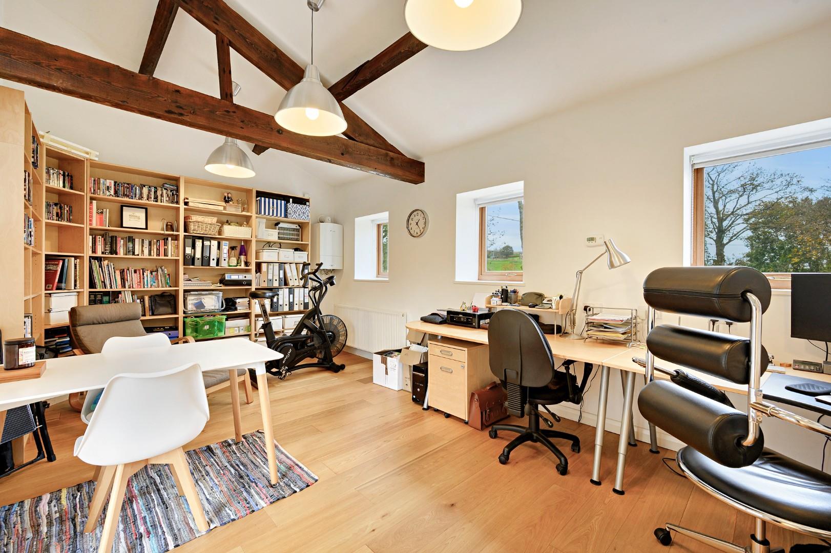 ‘The Barn’ is a large room currently used as a substantial home office though it would suit a variety of uses, from guest accommodation to a home gym, the choice is yours. Its high ceilings and multiple windows give it a fresh, airy ambience, and it has its own central heating system with a combi boiler and radiators – the gas boiler is powered by LPG bottles.