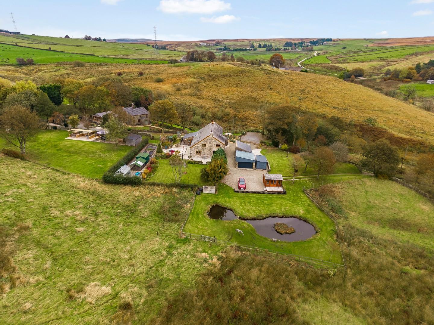 Situated in the quaint rural hamlet of Whittlestone Head, with extensive landscaped gardens and approximately six acres of land, this generous detached and extended stone property offers the best of countryside living. Its location between Bolton and Darwen means there’s the convenience of plenty of amenities within a short drive, with easy access to the motorway network too. A brief overview of the main property includes a central entrance hall, living room, multifunctional family and dining room, kitchen and breakfast room, utility, downstairs WC, porch, four large double bedrooms with two en-suites, and a family bathroom. The main property is accompanied by four/five useful outbuildings, comprising a double garage attached to an annex style office building, summerhouse, a large shed and a greenhouse.