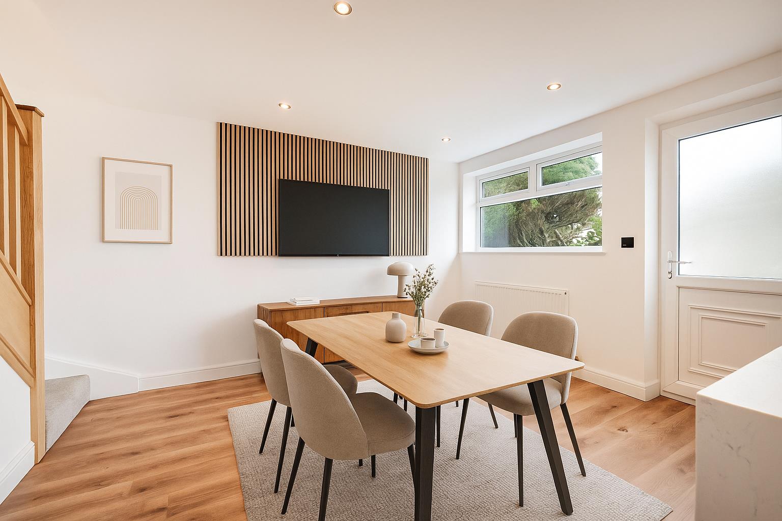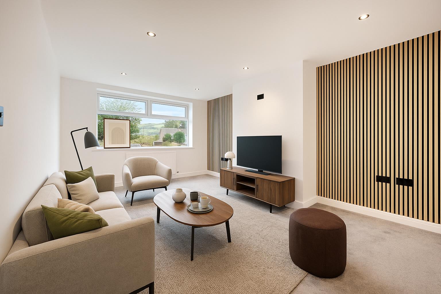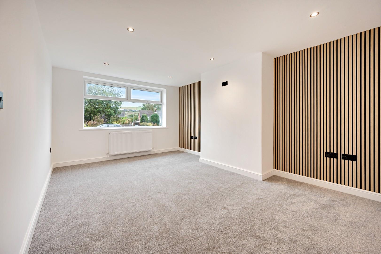 The main lounge is situated at the front of the property with stylish wall cladding which matches the TV point in the open plan living area. Another versatile room is also found at the front of the property which gives flexibility in its use and adds further practicality for family life – if not used as a fourth bedroom, it would alternatively be suited to use as another reception room.