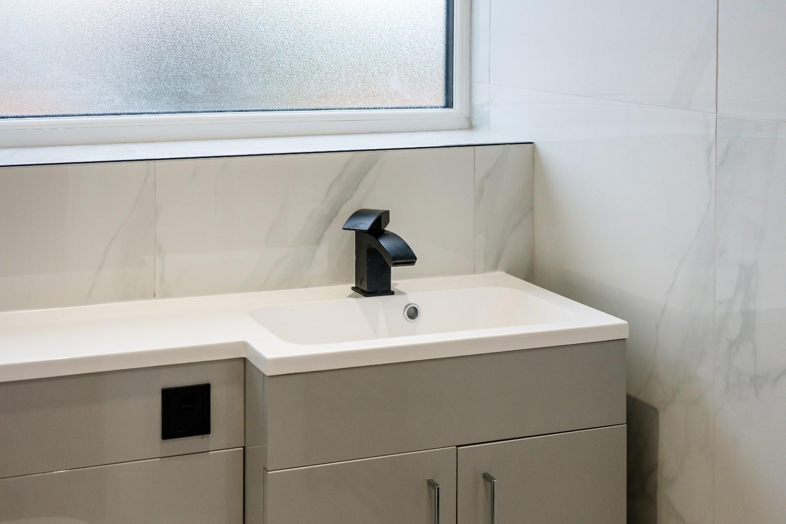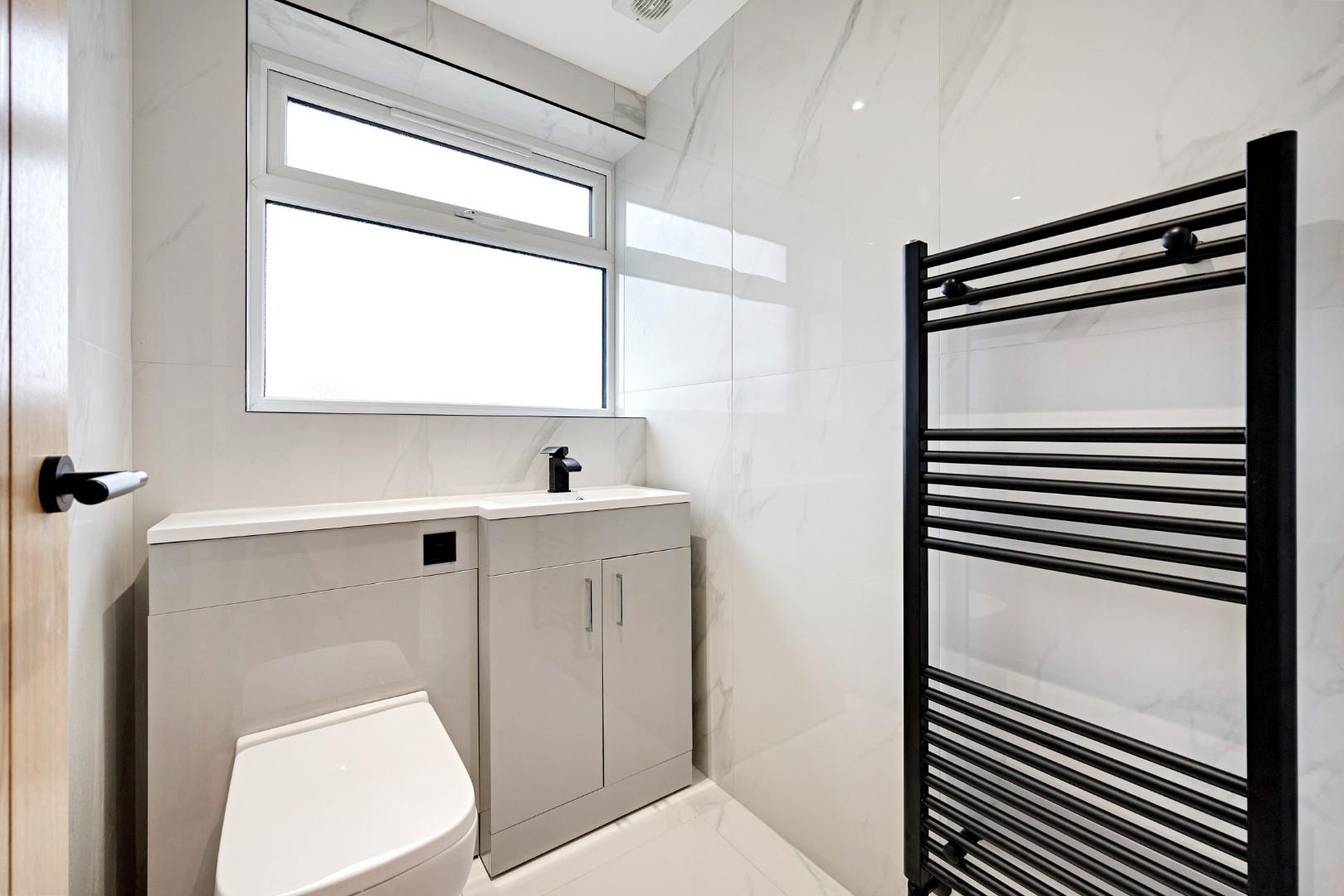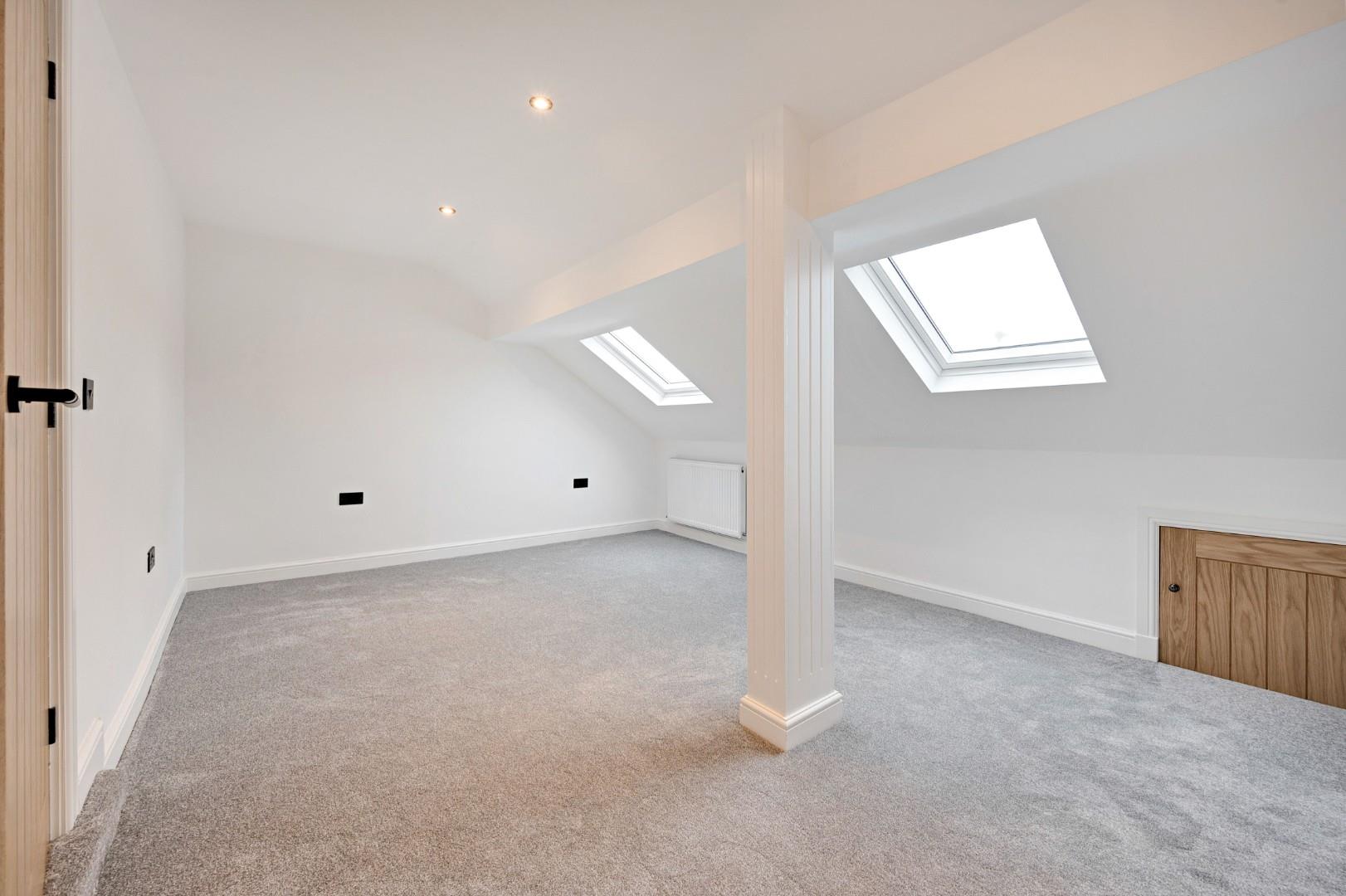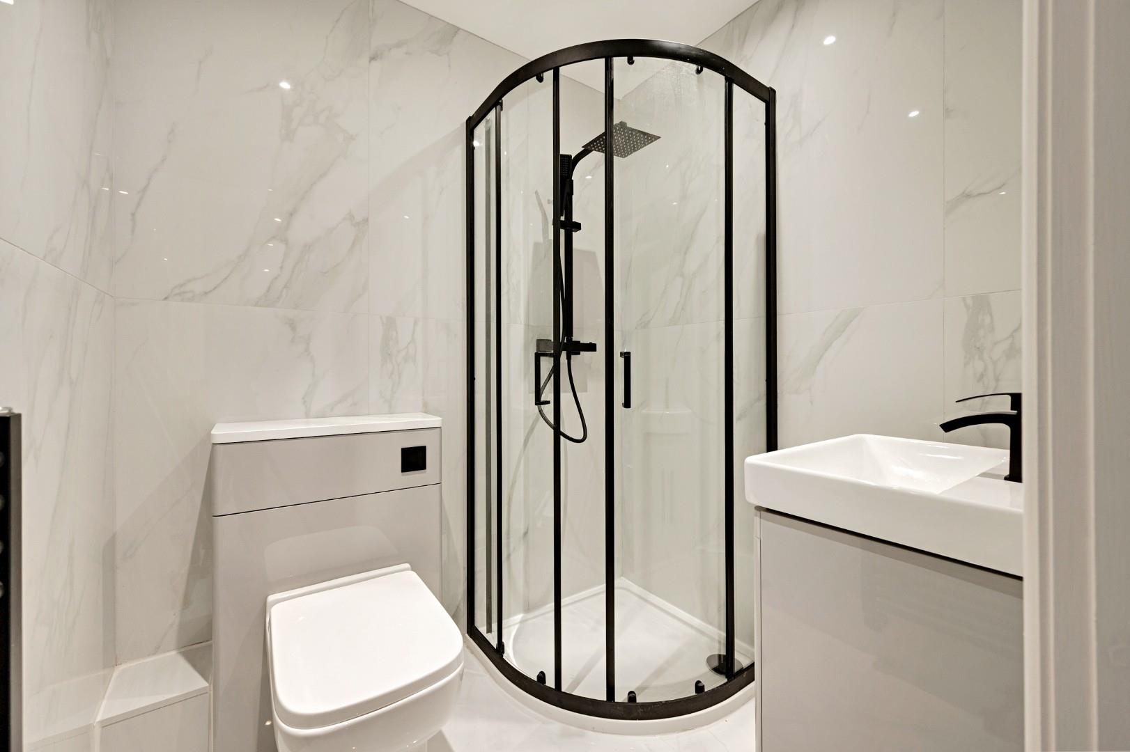 With a part-sloped ceiling and two large Velux windows, the master bedrooms boasts a unique design and features a three-piece en-suite with more matt black fittings on the walk-in corner shower that add stylish contrast to the marble-effect tiles and matching WC and vanity basin.