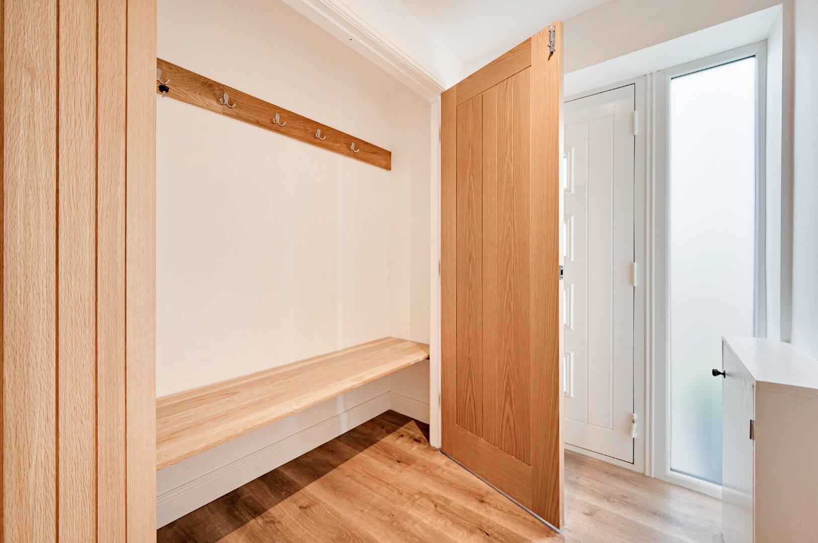 A spacious entrance hall connects the downstairs living space with a handy cloak store, and a spacious modern downstairs WC finished with fully tiled, marble-effect walls and floor, and a complementary grey WC and vanity unit. There’s also a matt black heated towel rail which matches the matt black fittings throughout the property, further complementing the oak doors.