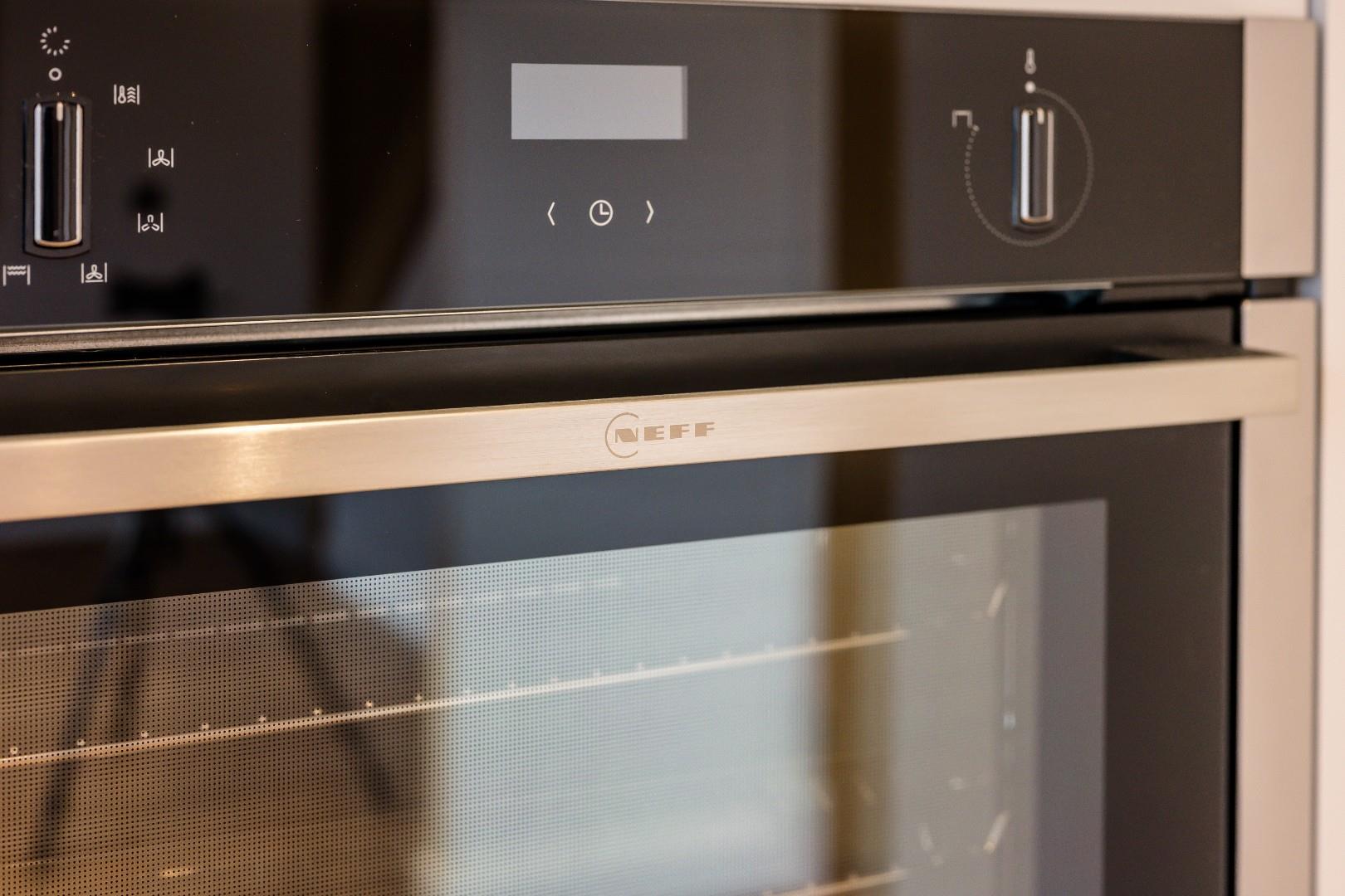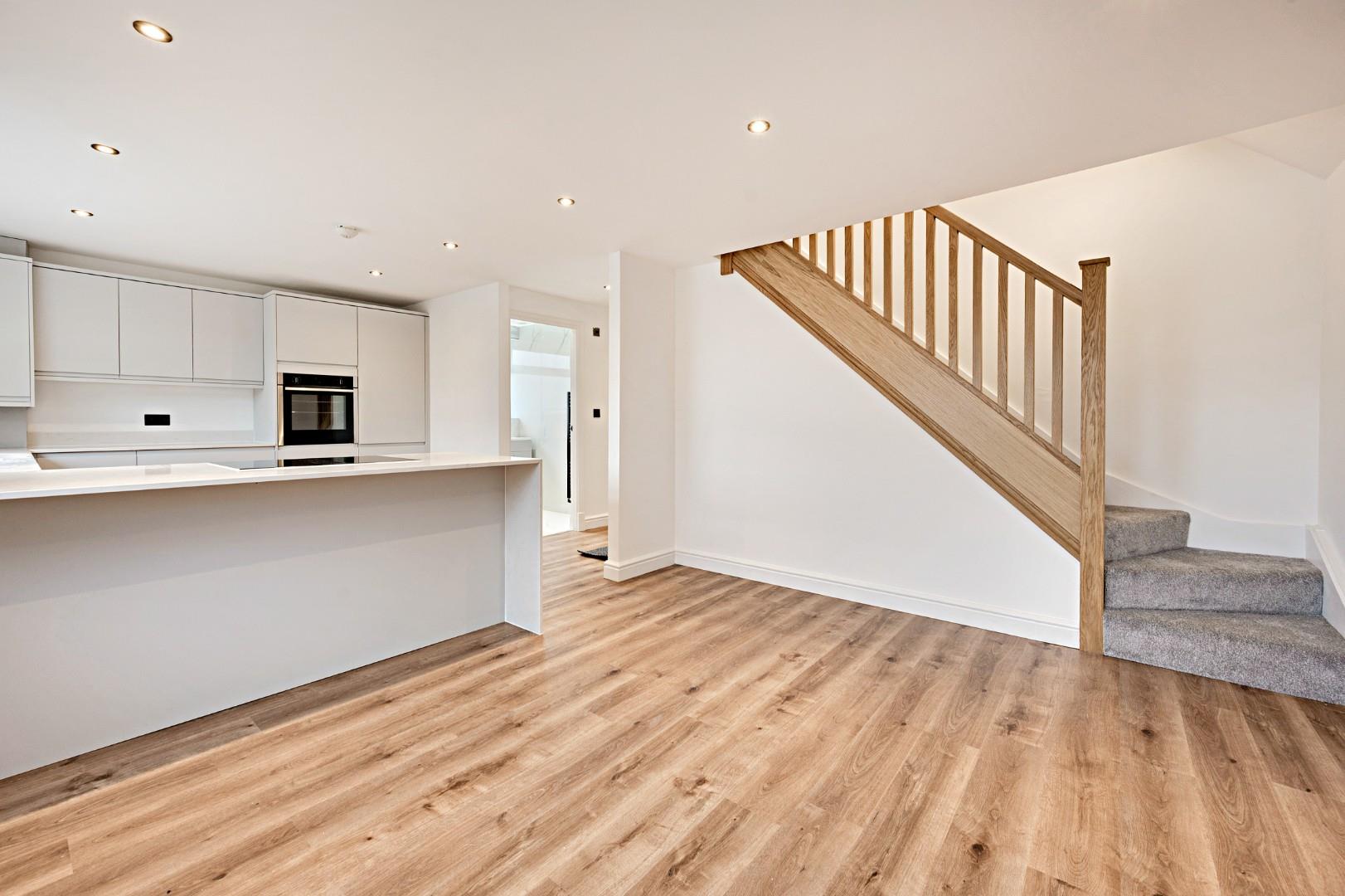 The open plan kitchen is bright and airy with a modern appeal featuring a solid granite worktop that wraps around the space and forms a breakfast bar. Within the sleek minimalist cabinetry is a range of integrated appliances, including a Neff oven, four-zone hob with downdraft extractor, dishwasher, washing machine, fridge-freezer, and an inset sink with 3-in-1 instant hot, chilled and sparkling tap. The kitchen’s open aspect to the adjacent space with wall-mounted TV point is ideal for use as a dining room or family room where cooking, dining and socialising come together in one convenient space.