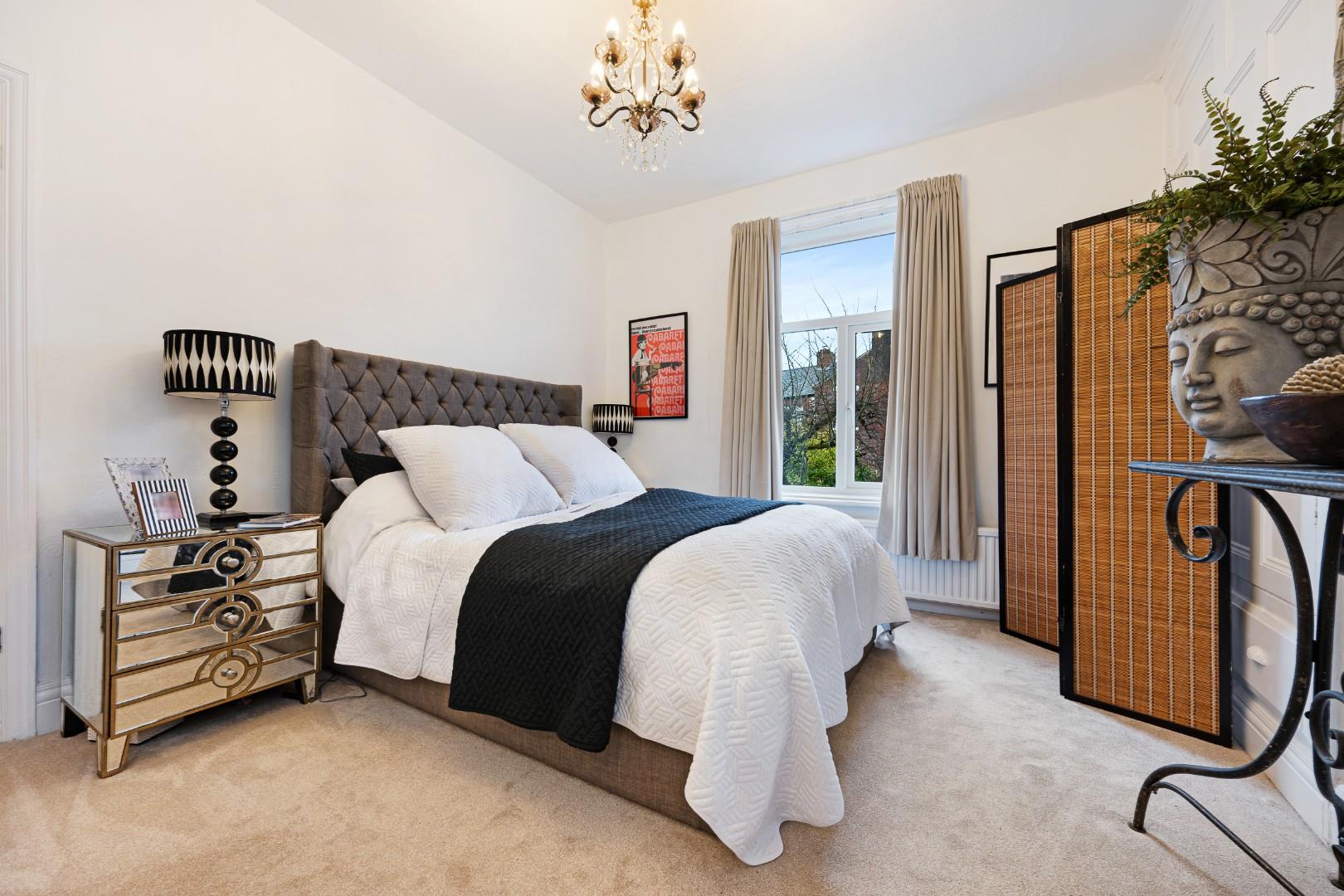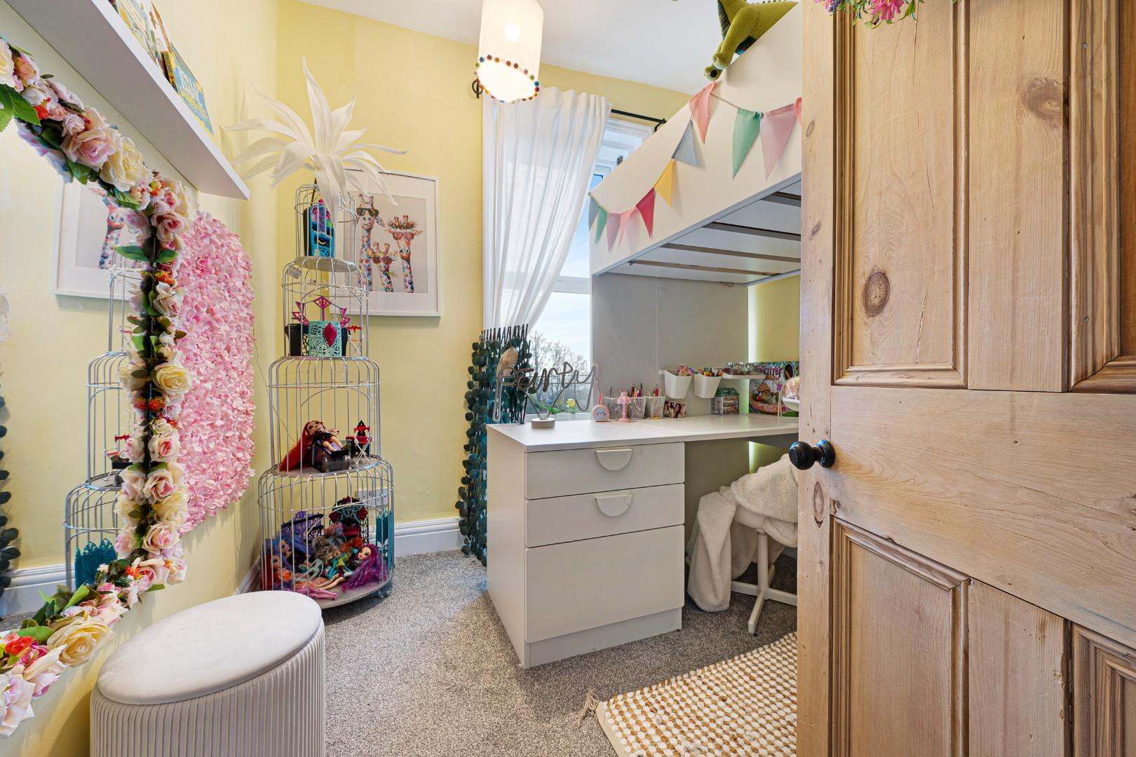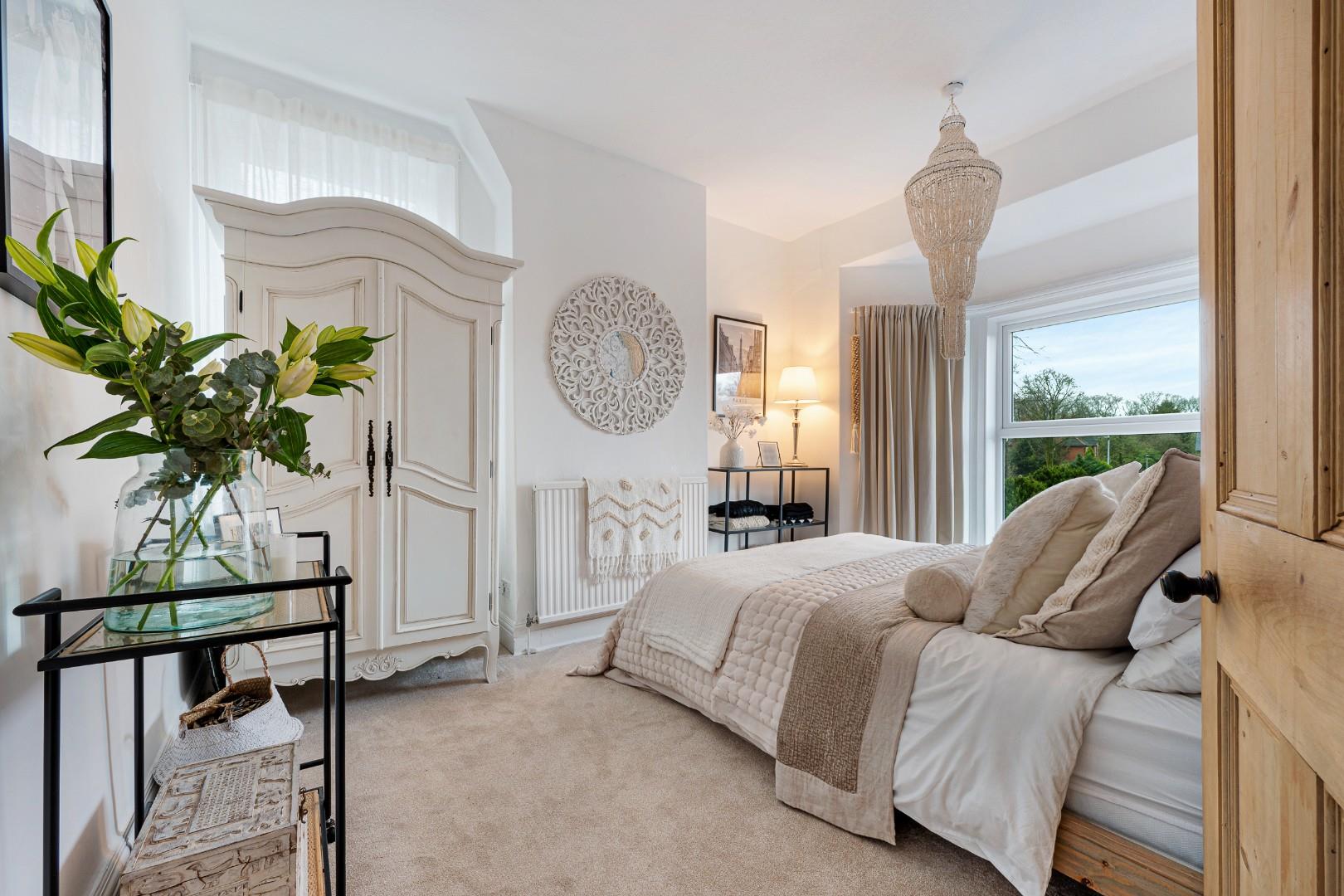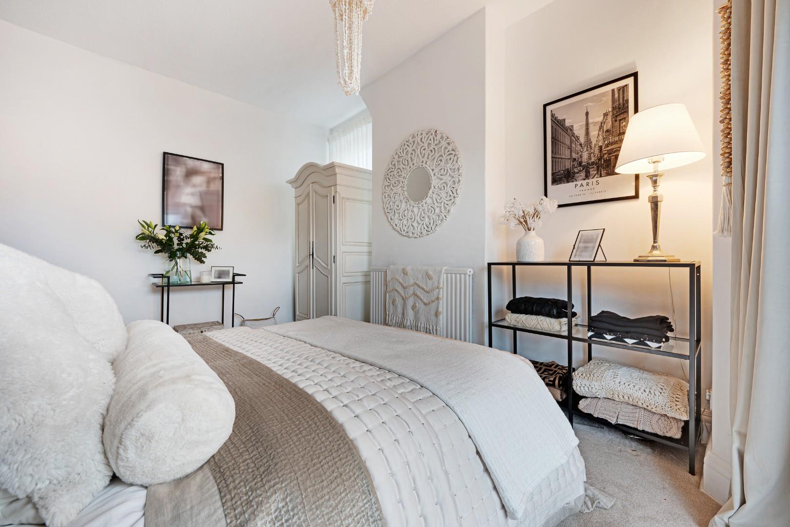 Two of the three bedrooms are generous doubles, with the front one featuring a bay window and second side window like the downstairs lounge, adding to the period charm. The other good-sized double is situated at the rear with a large window, fitted storage space, and fresh neutral decor. The family bathroom benefits from a contemporary design and four-piece suite, featuring a freestanding bathtub, walk-in corner shower, trendy wash basin with storage cabinet and WC.