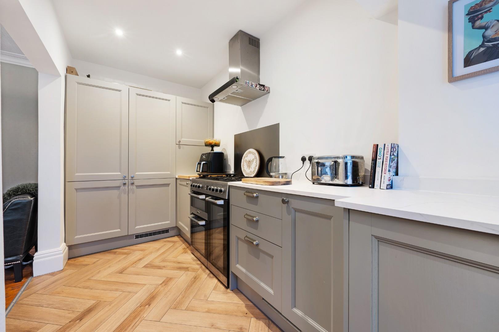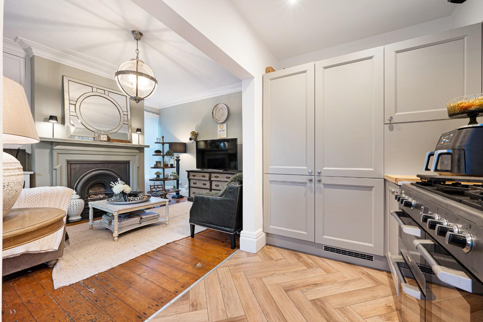 A standout feature of the rear living area is the open aspect flow into the new kitchen which has been designed to match the period character while offering modern appeal and practicality. A range of integrated appliances includes a white ceramic sink with drainer and traditional-style mixer tap, dishwasher, fridge, freezer, as well as a range-style cooker with several electric ovens, multi-ring gas hob, and splashback and extractor hood. The cottage grey cabinetry complements the white quartz worktop and herringbone flooring.