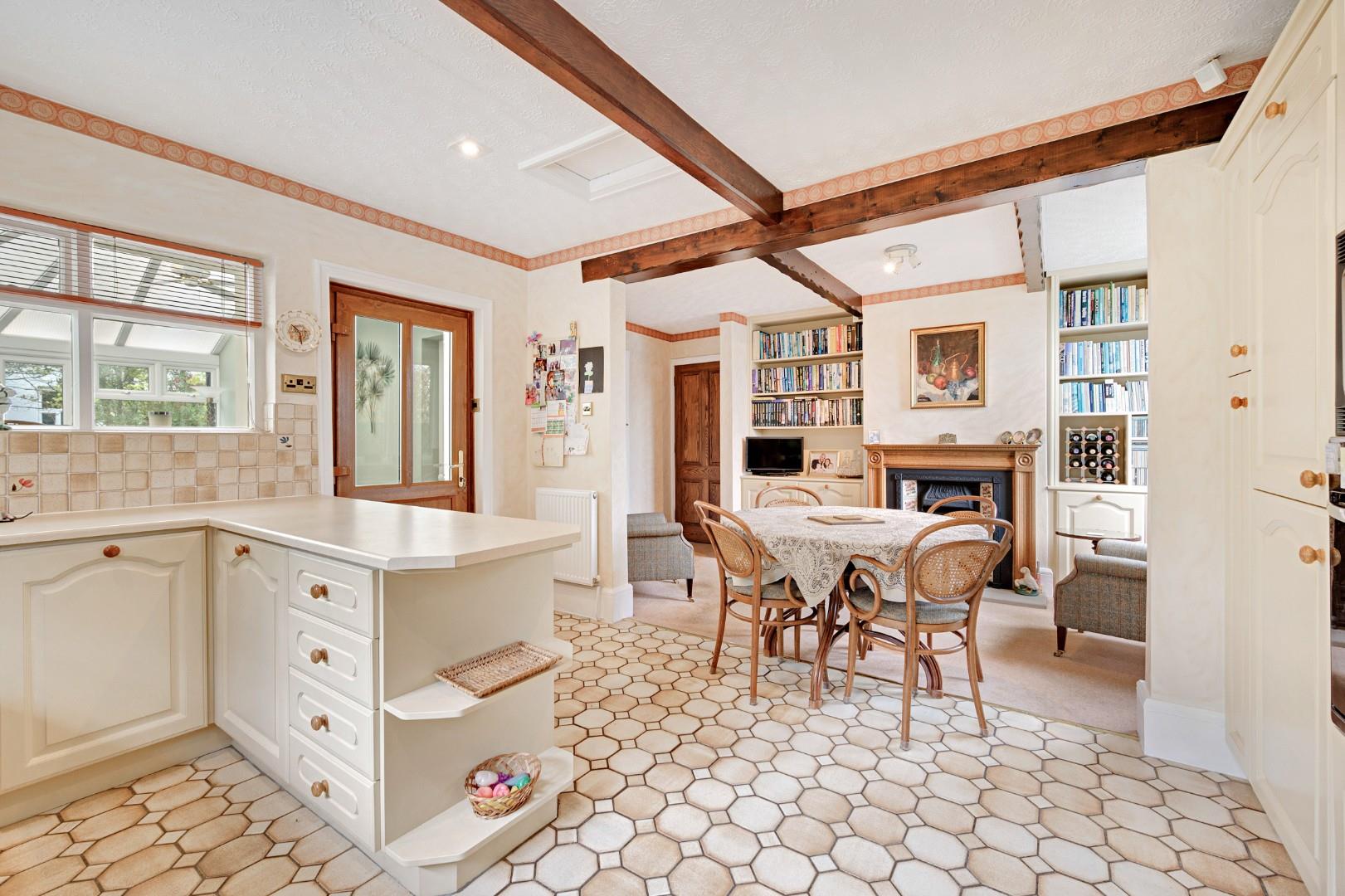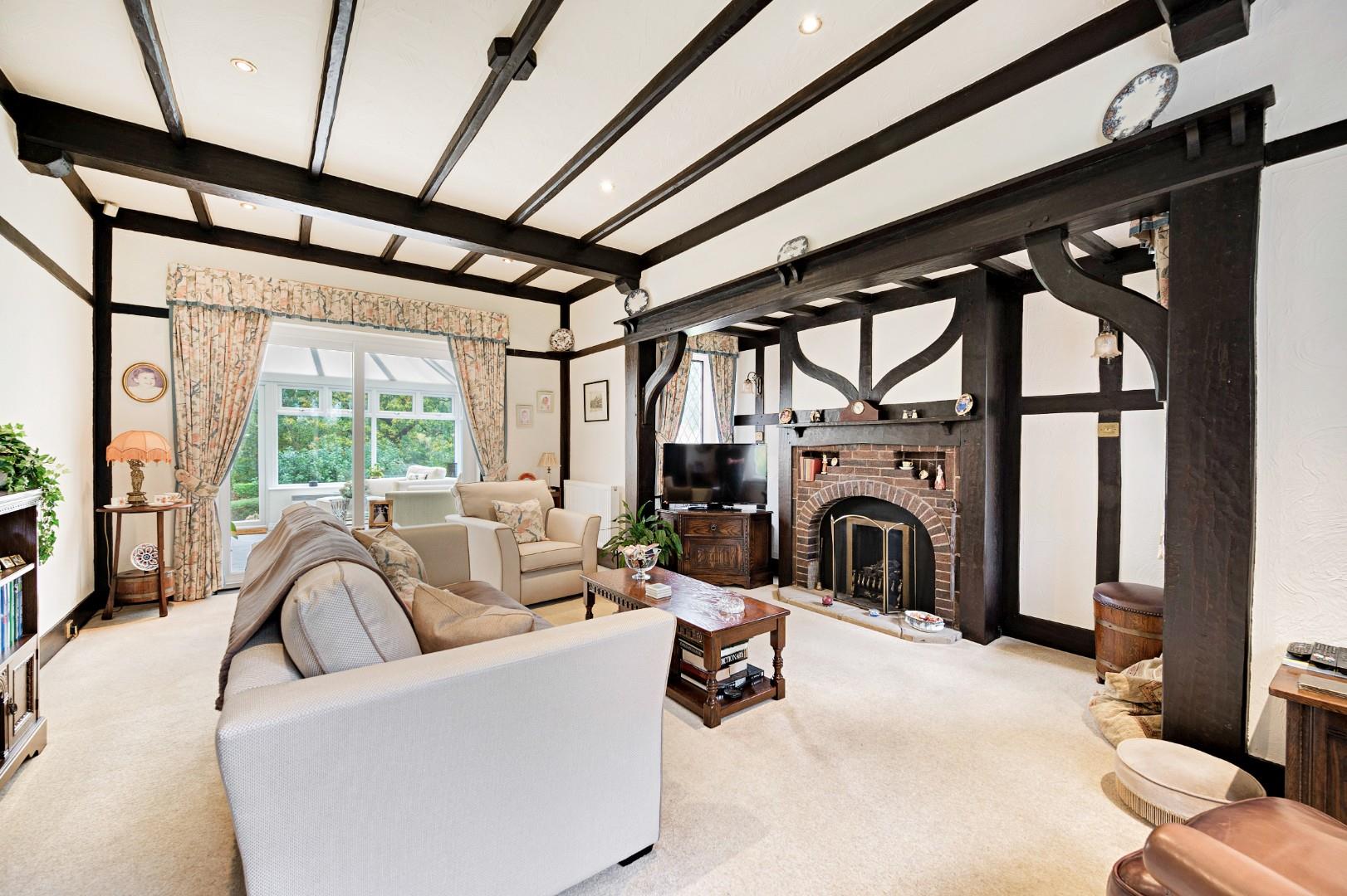 To the right of the hall is the main lounge – a large room filled with character and natural light, with impressive beams adding contrast to the white walls. A central fireplace with gas fire continues the traditional feel, and natural light pours in through several windows. Glass sliding doors to the rear open onto the conservatory, affording a flow between living spaces if desired. The dining room on the left of hall is another character-filled space with more leaded stone mullion windows and original plate racks.