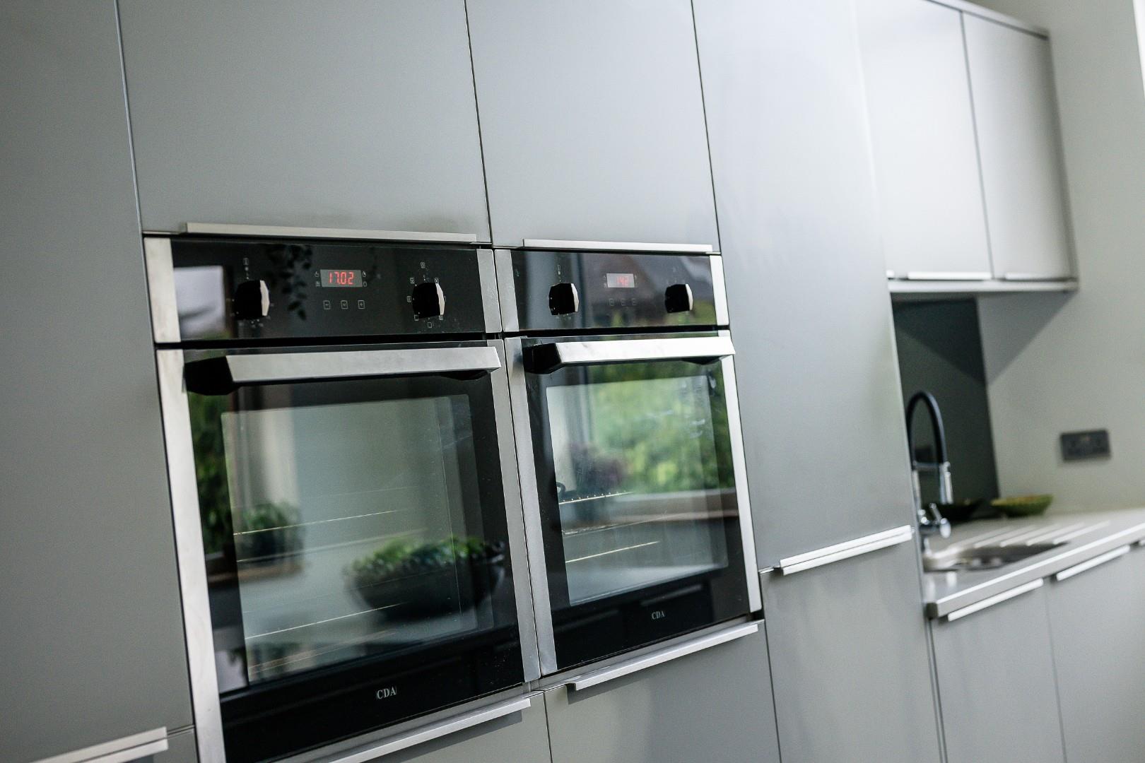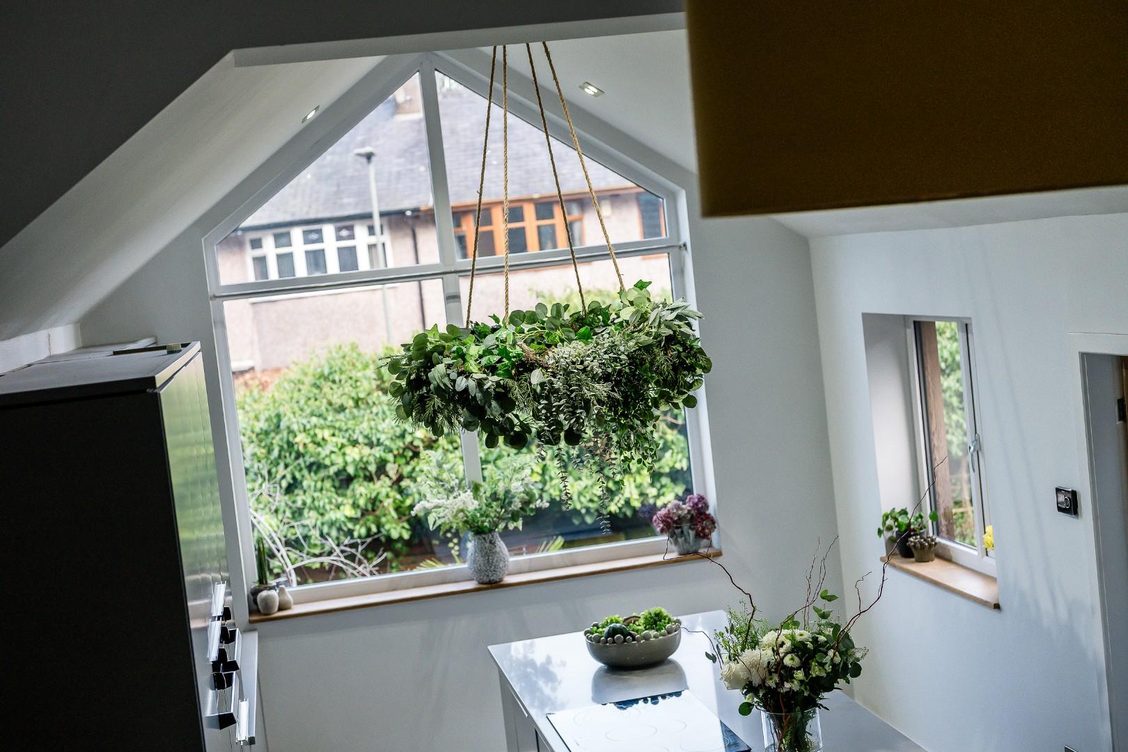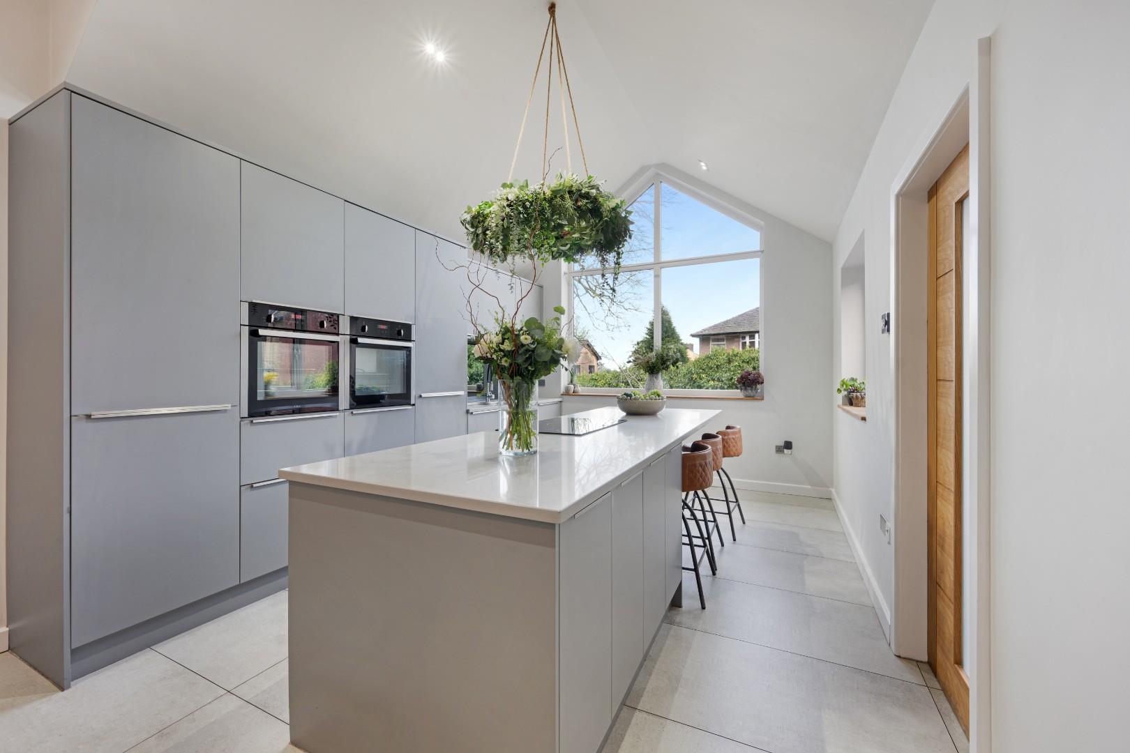 As soon as you step inside there’s a sense of grandeur due to the high vaulted ceiling and large open aspect living areas, and the engineered oak floor underfoot complements the contemporary design. The large reception room comprising the two sitting areas is situated on an upper level with a stylish glass balustrade that partitions the space from the hall area and the kitchen-diner adjacent. Between the two sitting areas is a set of large glass sliding doors which open onto the rear garden, providing plenty of light for the spaces inside while allowing you to enjoy that sought-after indoor-outdoor lifestyle on warm summer days. One of these sitting areas has a log burner which is sure to give off a cosy warm glow on cold winter days.
