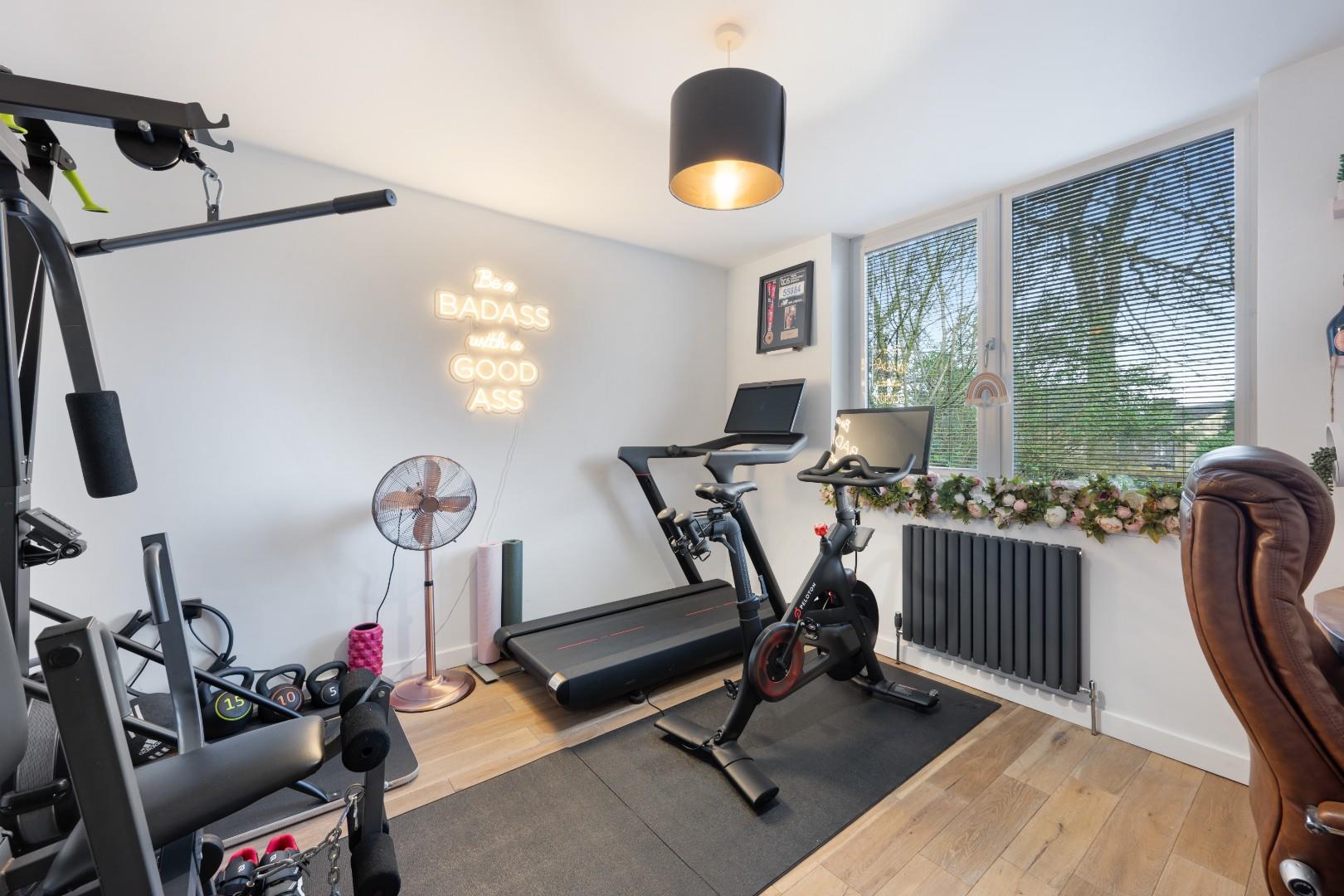 Back to the lower level and on the left side as you walk in is the ‘downstairs WC’ which like the living spaces is presented to stylish contemporary standards. To the right as you walk in is the store/cloak room, and through a small corridor is the versatile room which is currently used as a study and home gym.