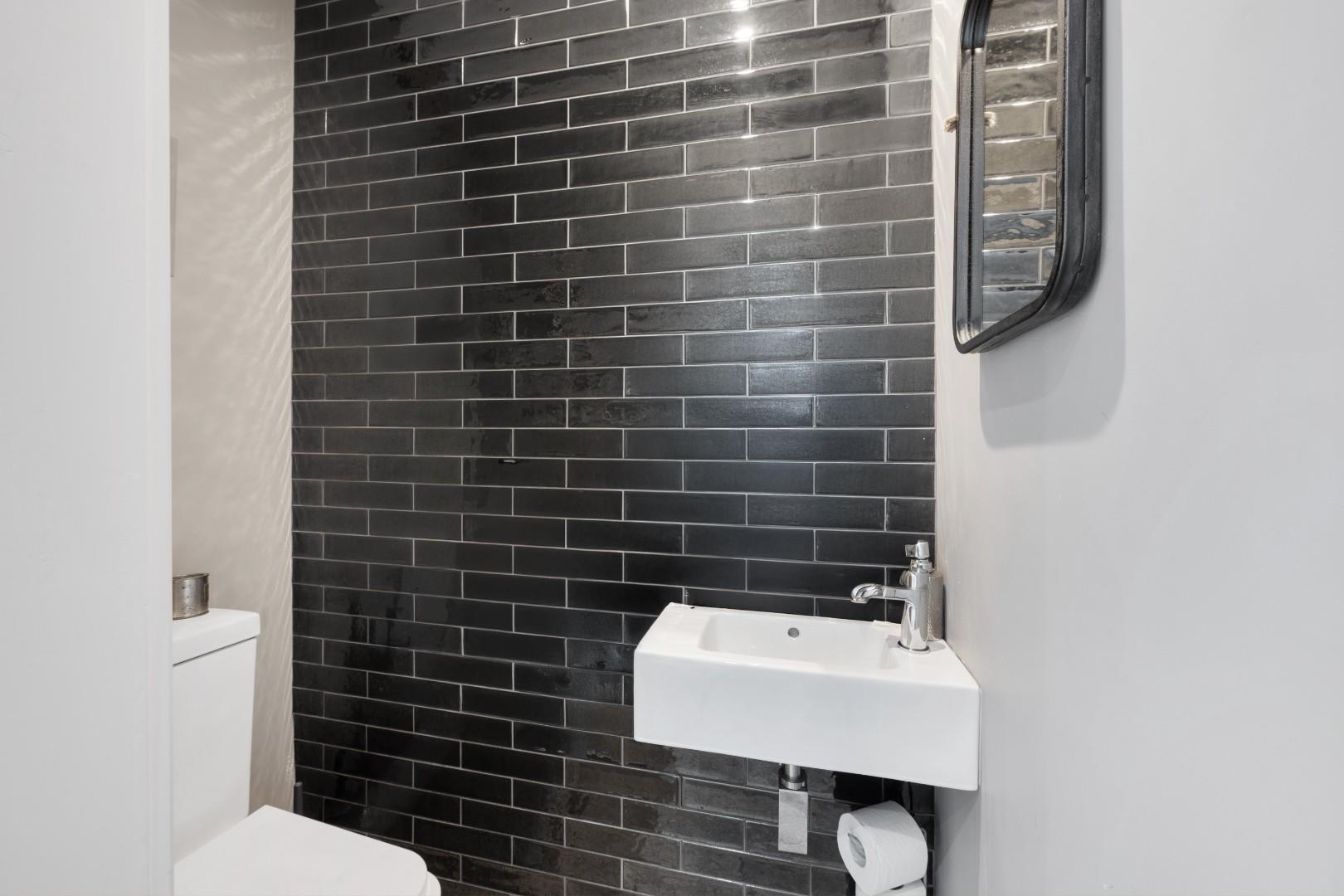 The kitchen and dining area is on the lower level too, it is grounded by premium stone tiling and is connected to the reception room on the upper level through the wall opening and glass balustrade, which makes this is a fantastic house for socialising and family life, while adding to its unique contemporary design. Within the kitchen are a range of integrated appliances, comprising two ovens, a dishwasher, wine fridge, fridge-freezer, sink with drainer and mixer tap, and ample storage space. The design is fresh and modern, with a Silestone worktop complementing the stylish cabinetry, and its substantial size ensures plenty of room for the biggest of families.