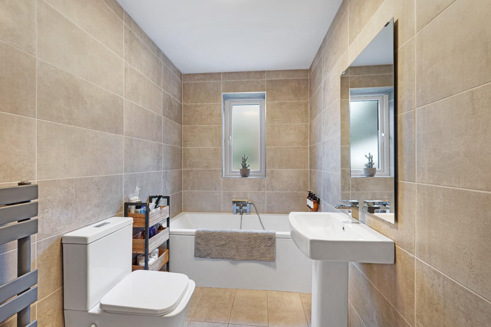 Within the family bathroom the fashionable décor continues, where the walls and floor are presented with stylish stone tiling, and its large size with modern suite again contributes to the appeal of this property as a fantastic family home.