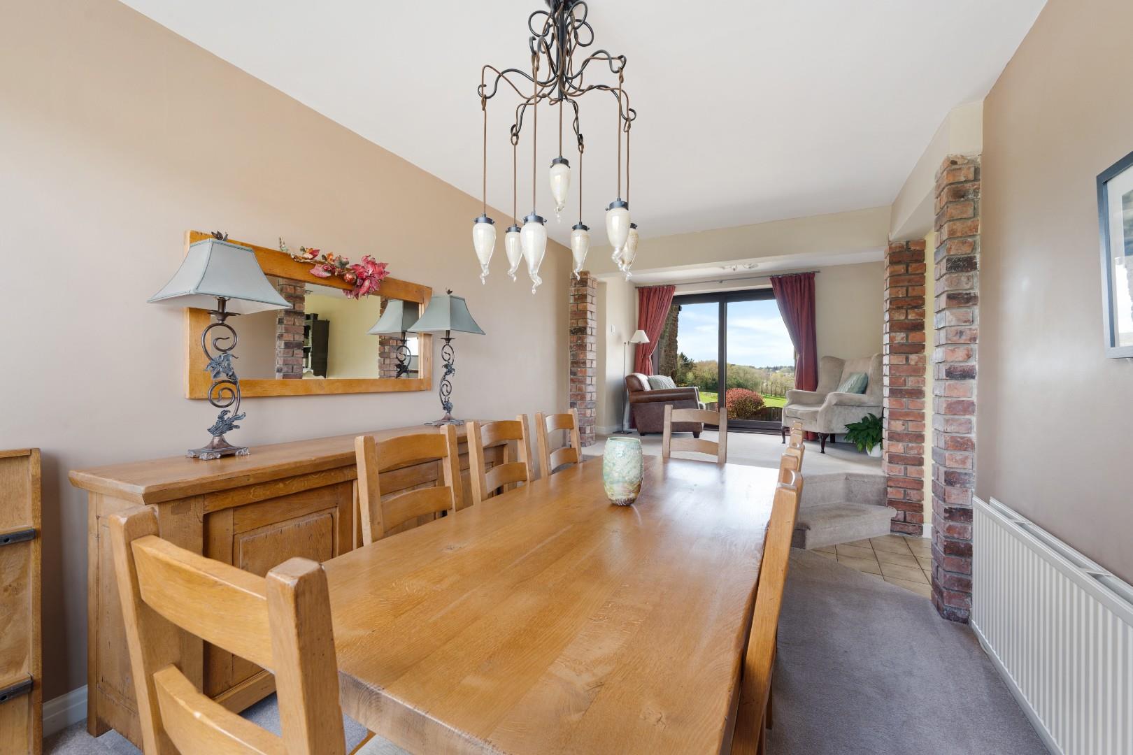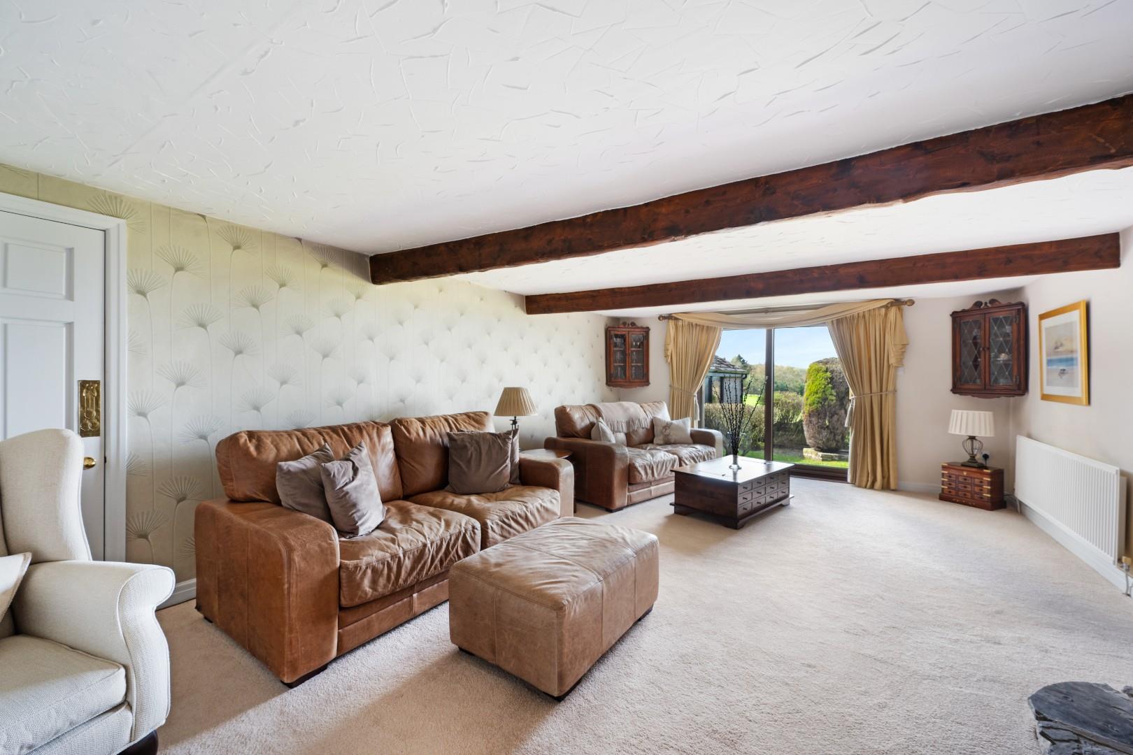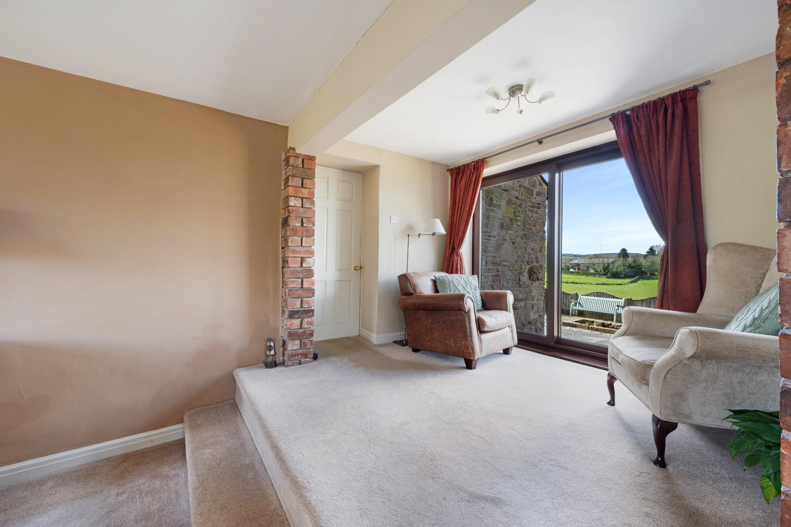 A large sliding door opens directly onto the garden, framing attractive countryside views and allowing natural light to fill the room. Generous in size, the layout comfortably accommodates multiple seating areas, making it a perfect setting for both quiet evenings and social gatherings.