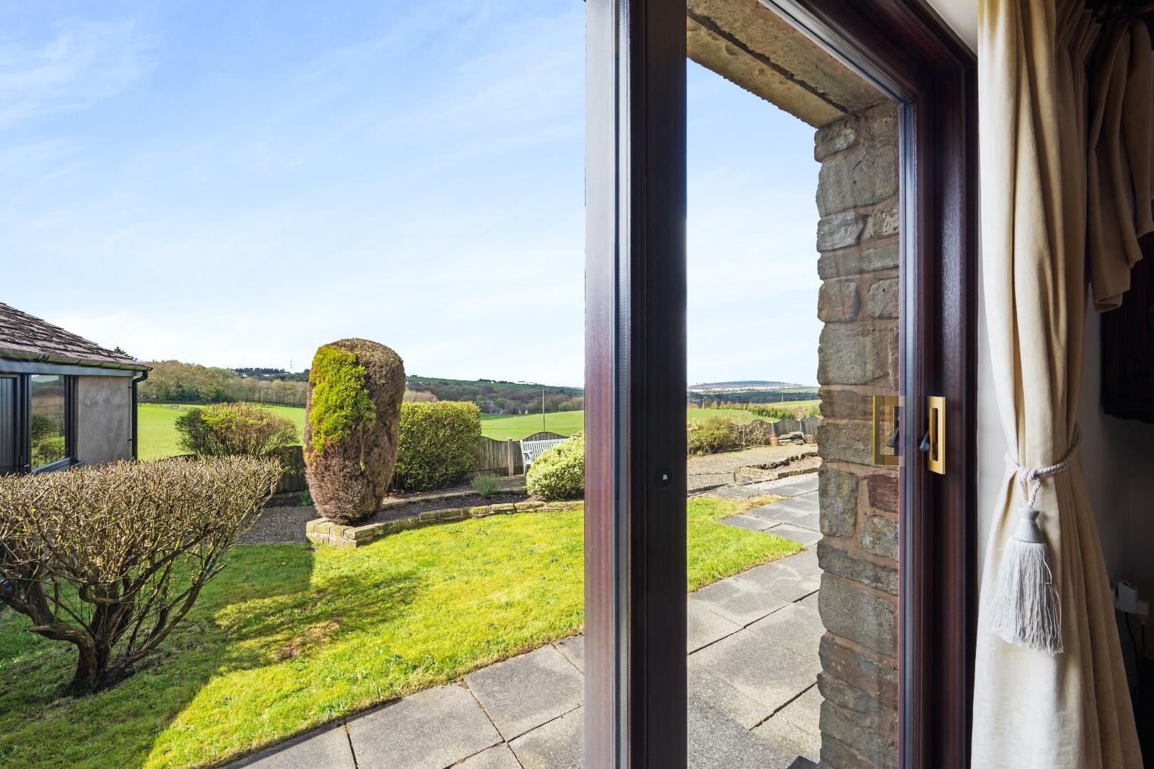 The property enjoys a superb outdoor setting, with gardens that make the most of the surrounding scenic views. A paved patio area provides the perfect space for outdoor dining and entertaining, flowing onto a well-maintained lawn and landscaped sections with established planting. The garden backs directly onto open fields, creating a wonderful sense of privacy and connection to the rural landscape, with uninterrupted views stretching across the countryside.