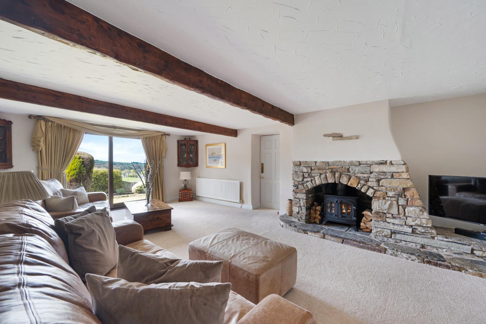 The lounge is a beautifully proportioned and inviting space, full of character and ideal for relaxing or entertaining. Exposed ceiling beams and a striking stone fireplace with inset stove create a warm focal point, enhancing the room’s cosy, cottage feel.